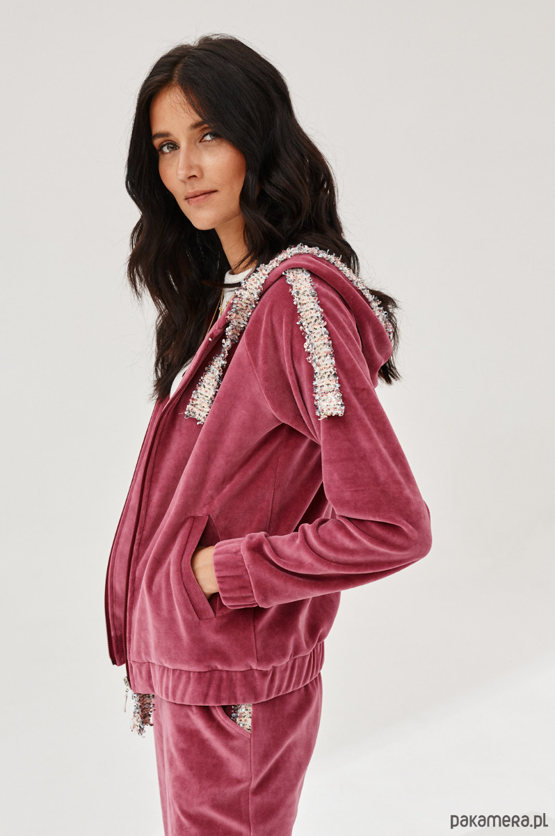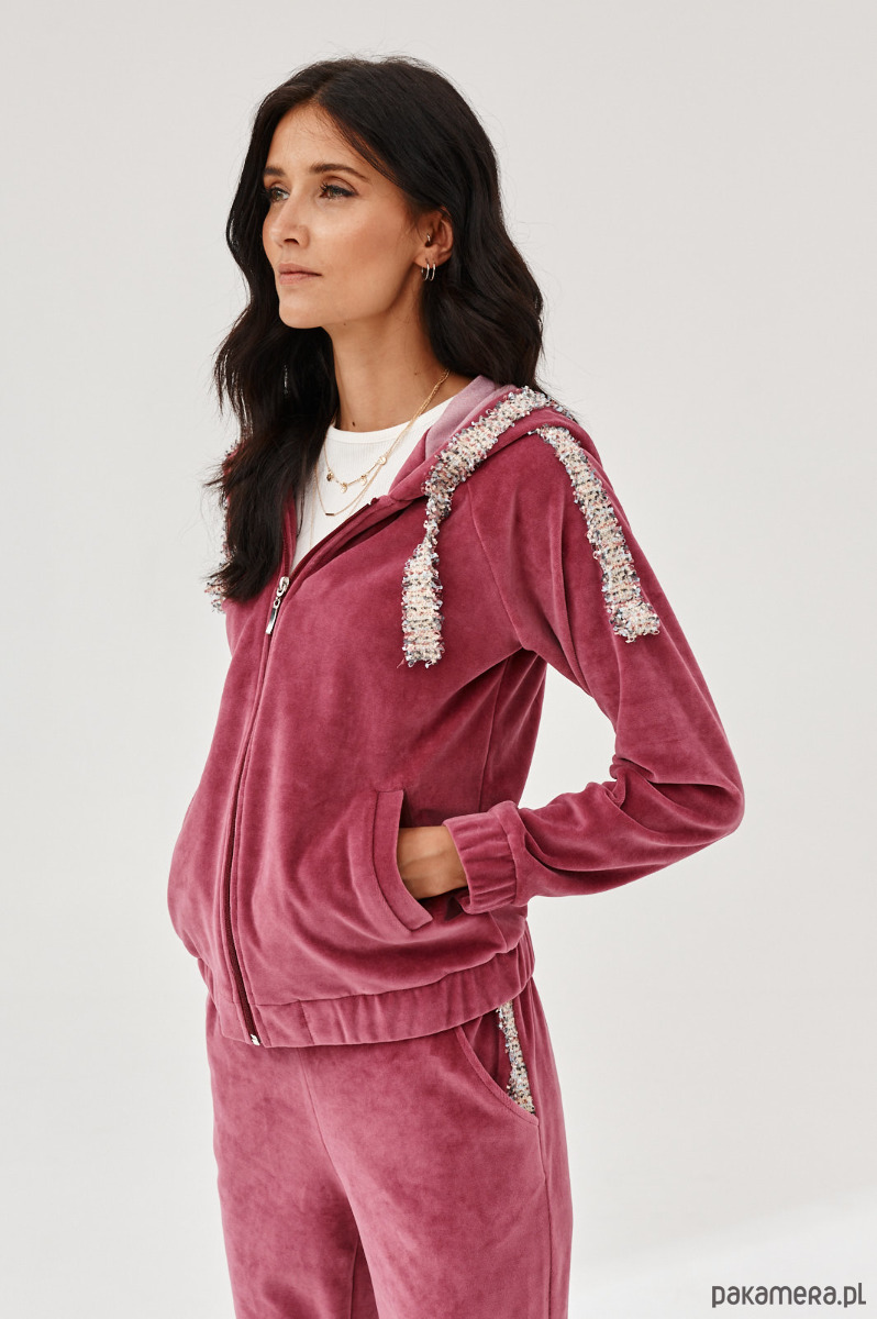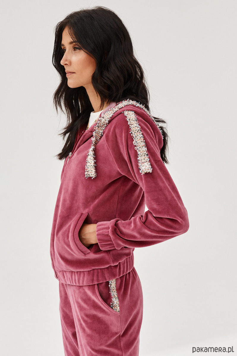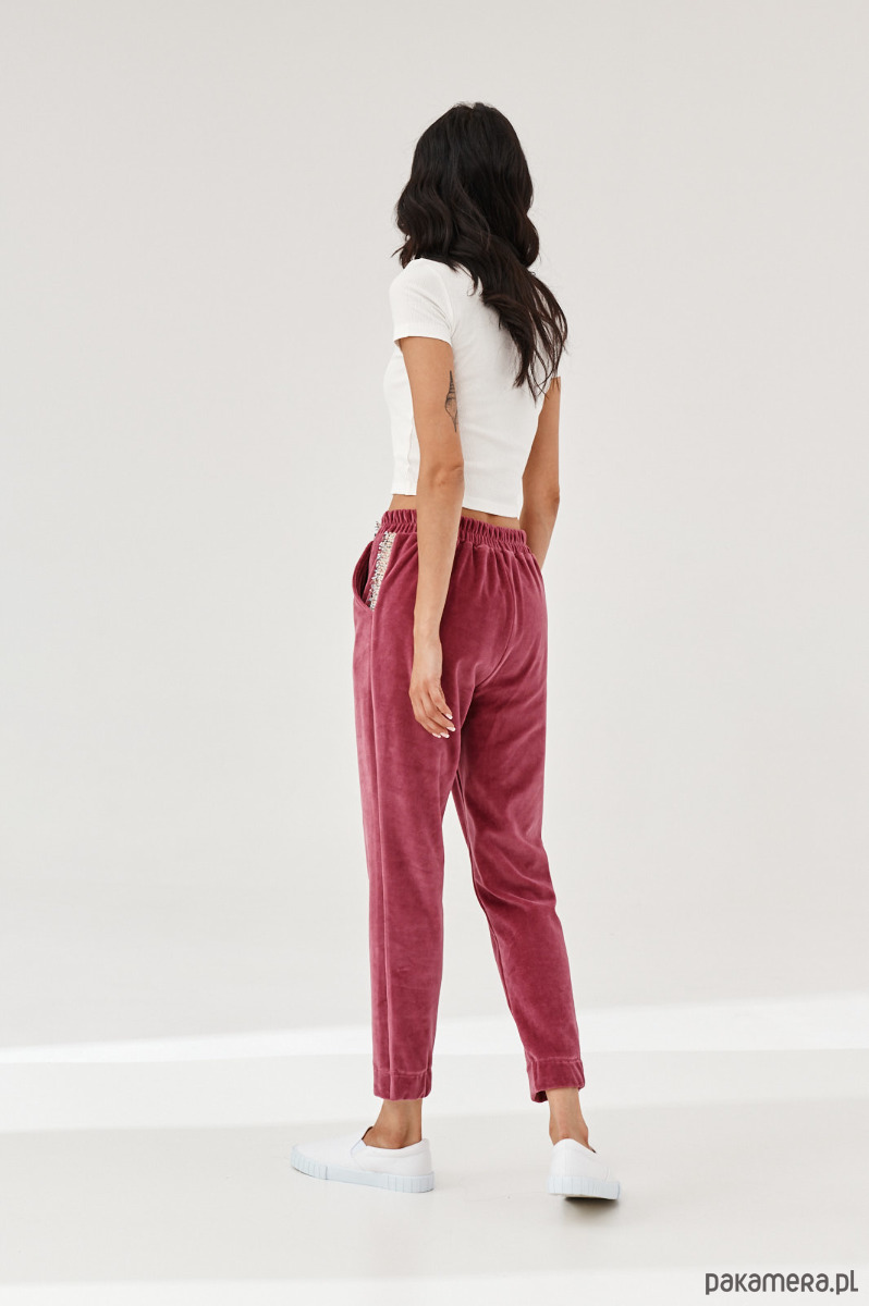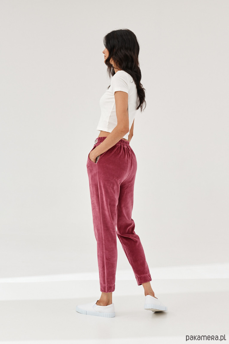 Spodnie ALDO uszyte z miękkiej dzianiny. Dzianina to połączenie bawełny z elastanem, która posiada certyfikat OEKO-TEX. Spodnie mają kieszenie z naszytą ozdobną taśmą. W talii na tyle jest guma. Dół nogawek z przodu jest prosty, na tyle ma wszytą delikatną gumę. Na przodzie na pasku naszyta ozdobna taśma. Taśma typu bucle ze złotymi akcentami. Bluza do kupienia również w sklepie.