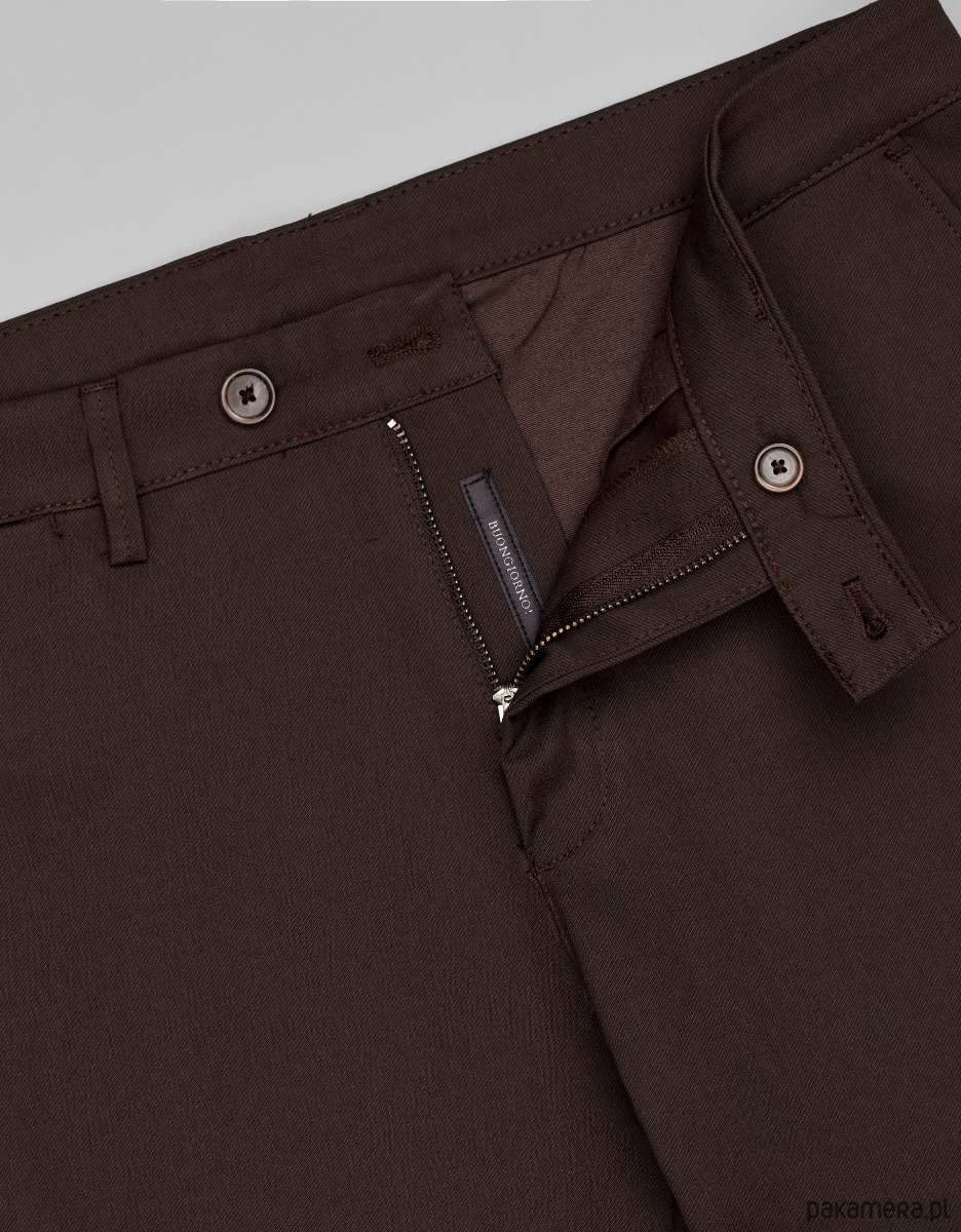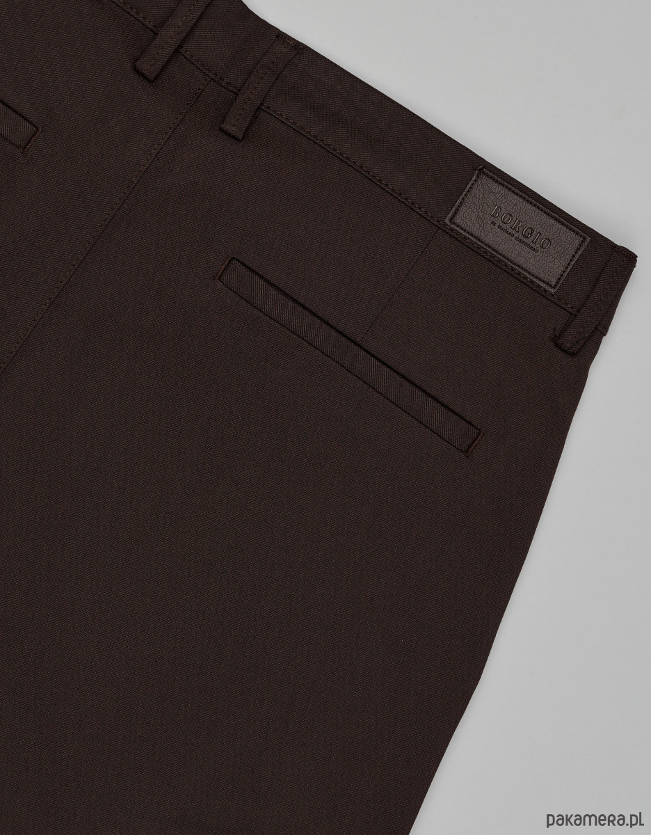Spodnie Altedo w kolorze brązowym mają zawężany krój (Slim Fit), a wykonane zostały z niezwykle i wytrzymałej elastycznej tkaniny technicznej. Całoroczny materiał oraz uniwersalny krój zapewniają wszechstronny charakter spodni. Wyróżniają je m.in. najwyższej jakości zamki i pullery od renomowanego producenta YKK oraz stylowe dodatki: dedykowana wszywka Buongiorno (na wewnętrznej części rozporka) i dobrana kolorystycznie skóra z logotypem Borgio Il taglio naturale na tylnej części pasa.