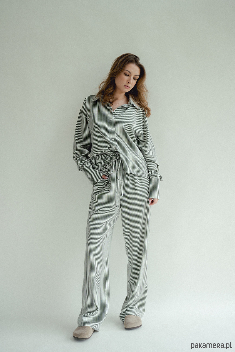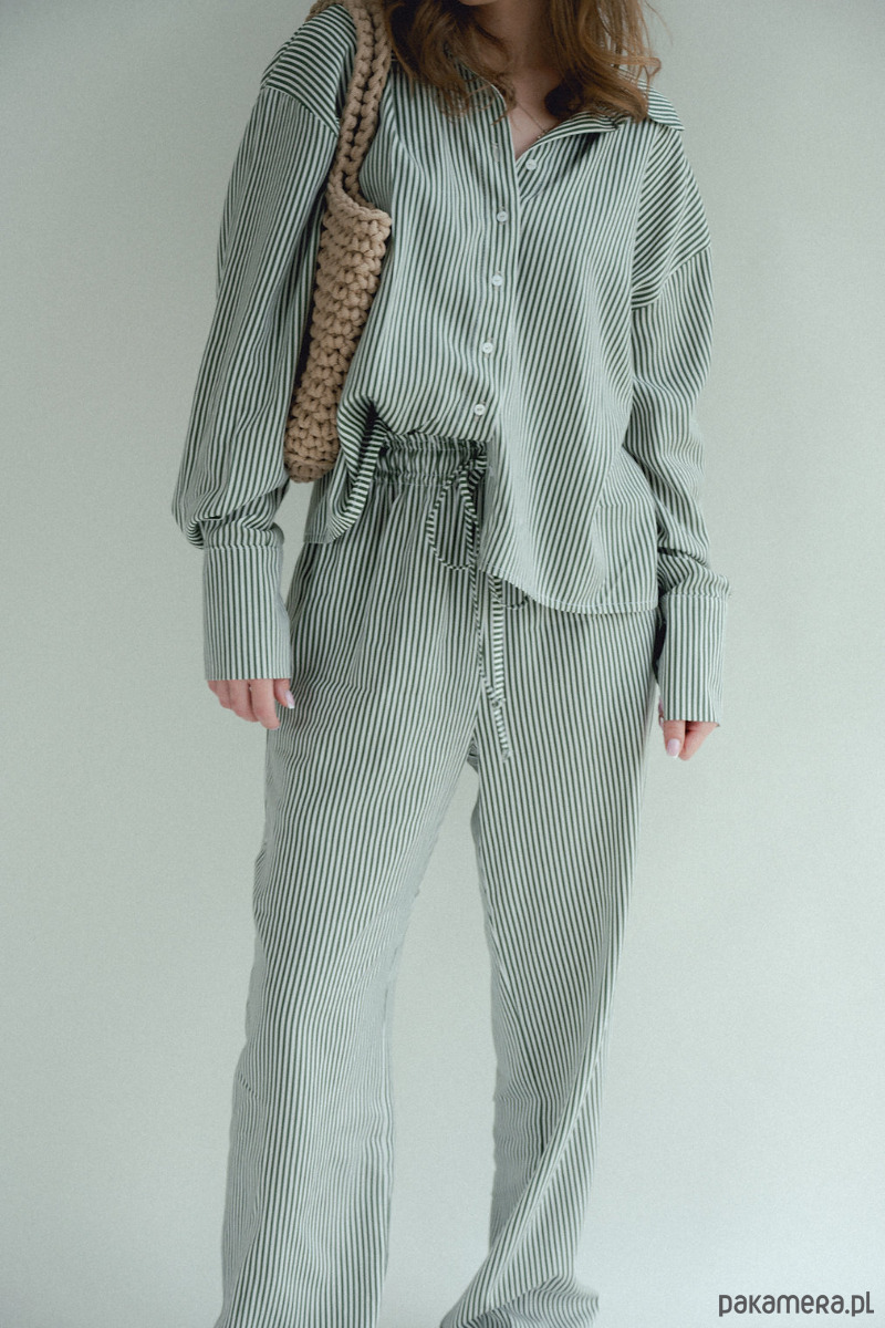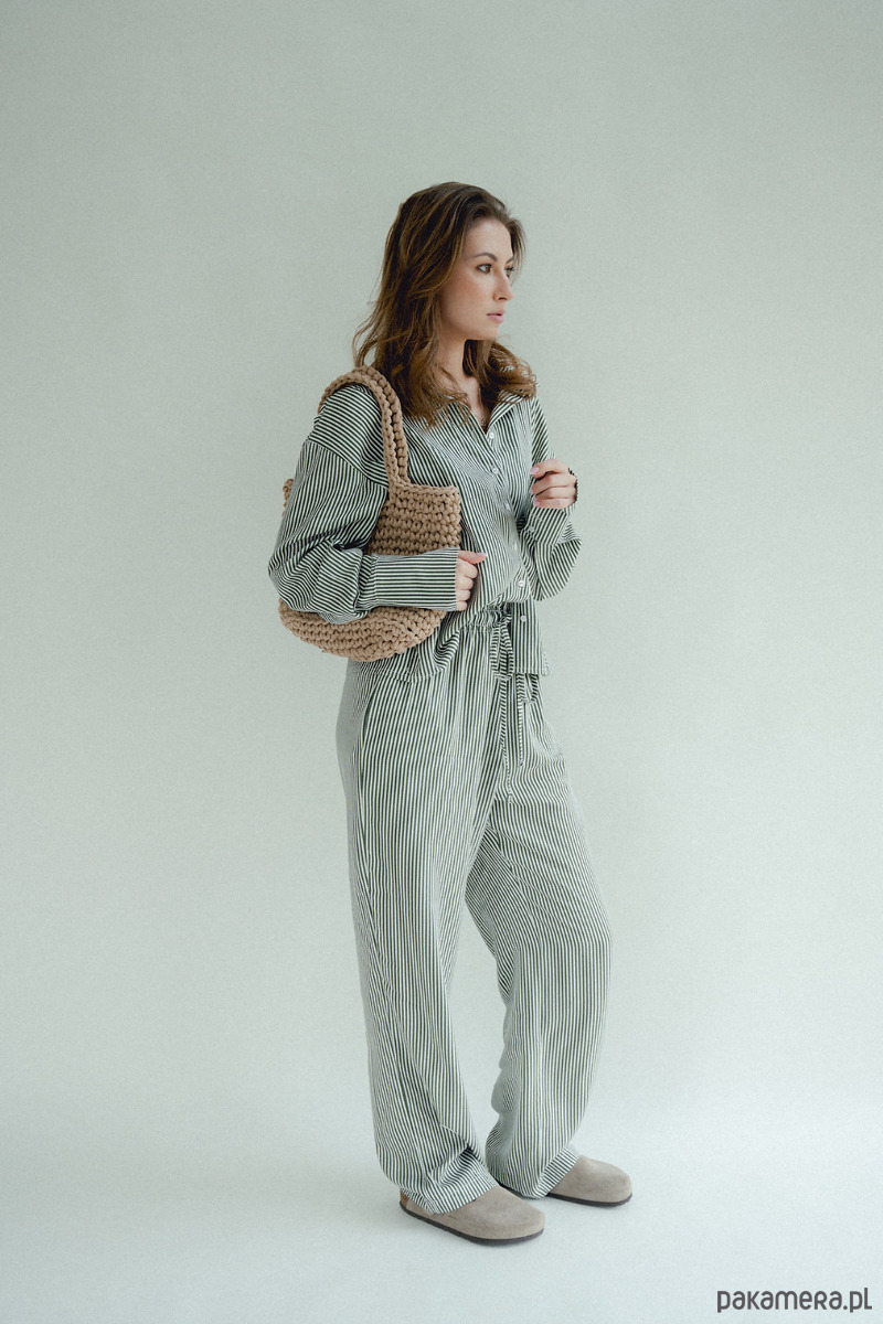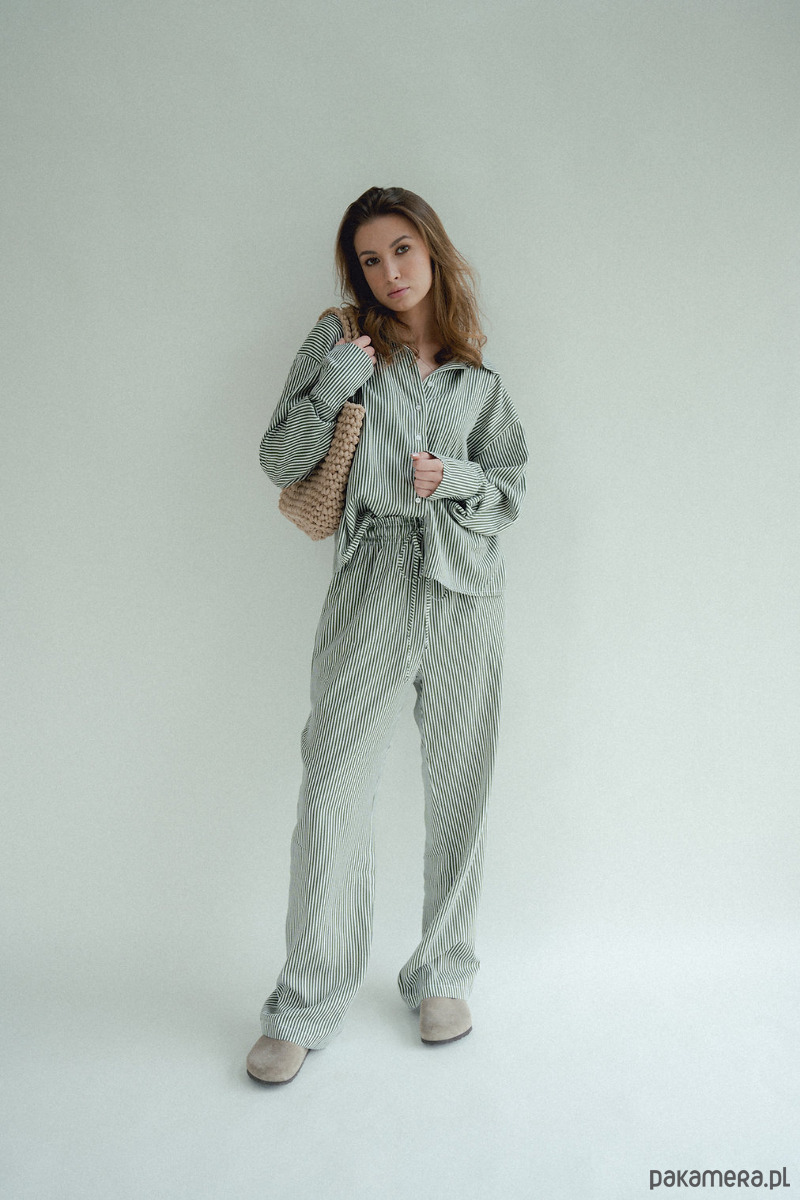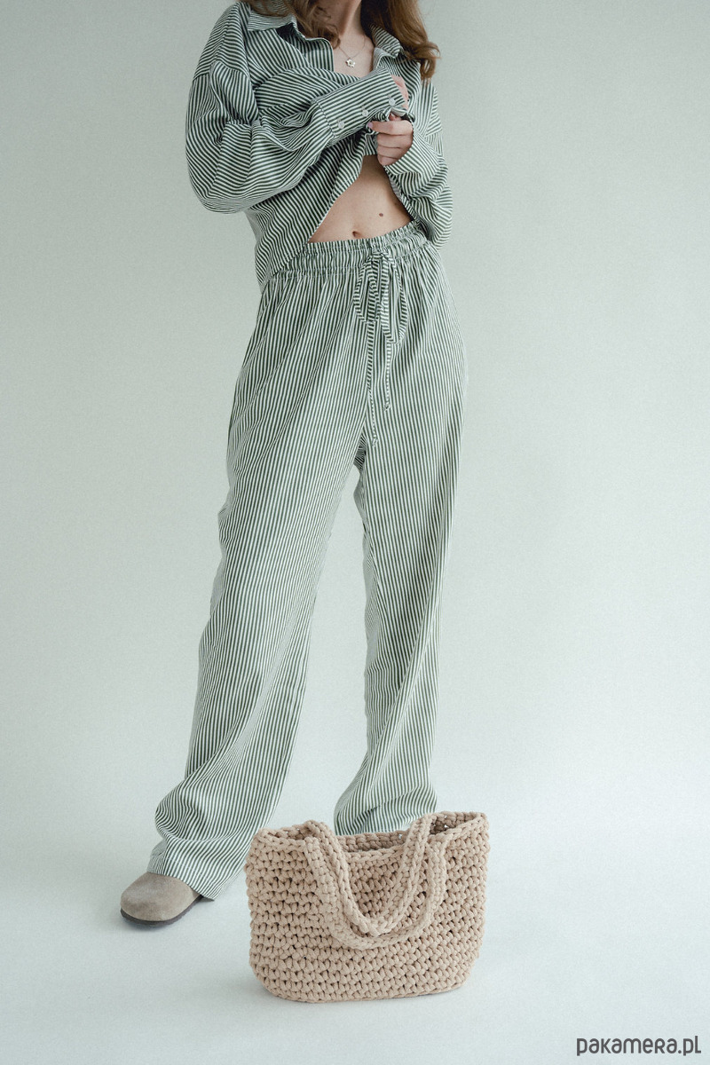 Spodnie w paski to HIT sezonu. Chcesz poczuć się wygodnie i stylowo? Te spodnie są dla Ciebie, szerokie, luźne nogawki, w pasie szeroka gumka która dopasowuję się do talii i sznurek który możesz zawiązać. Piękne połączenie kolorów, zieleni ze śmietanką. W środku kieszenie. Dobierz do nich koszule i stwórz codzienny piżamowy look!