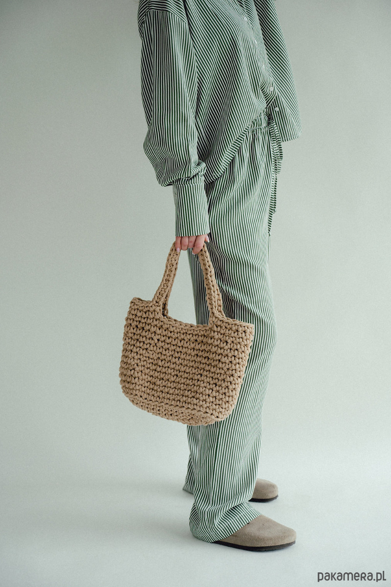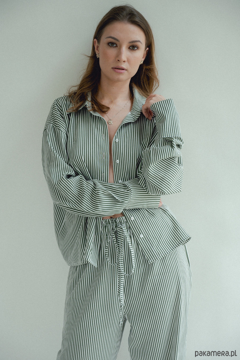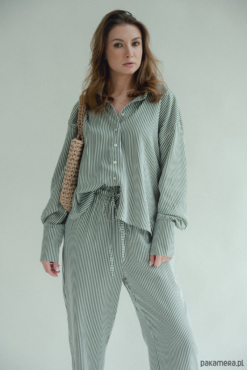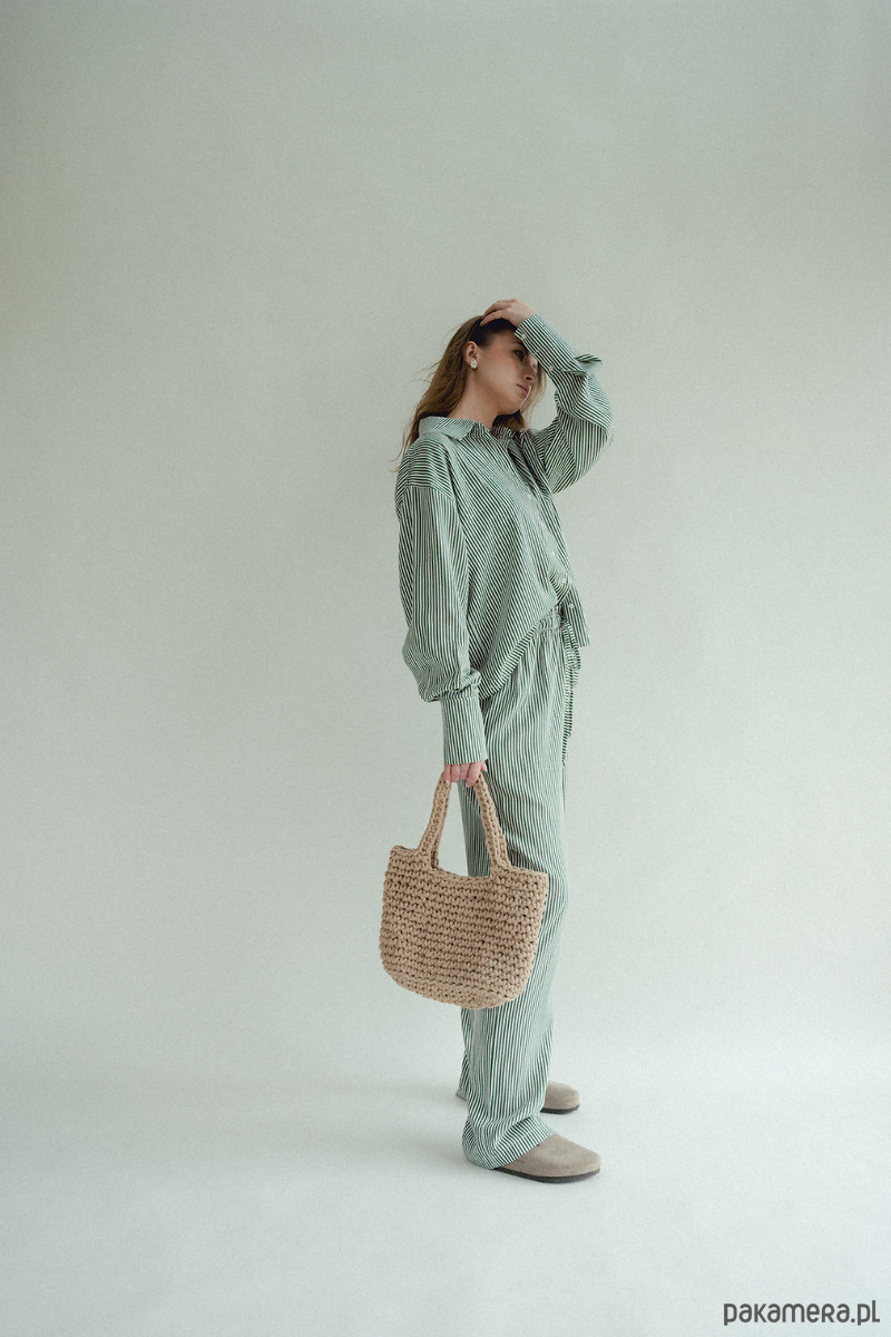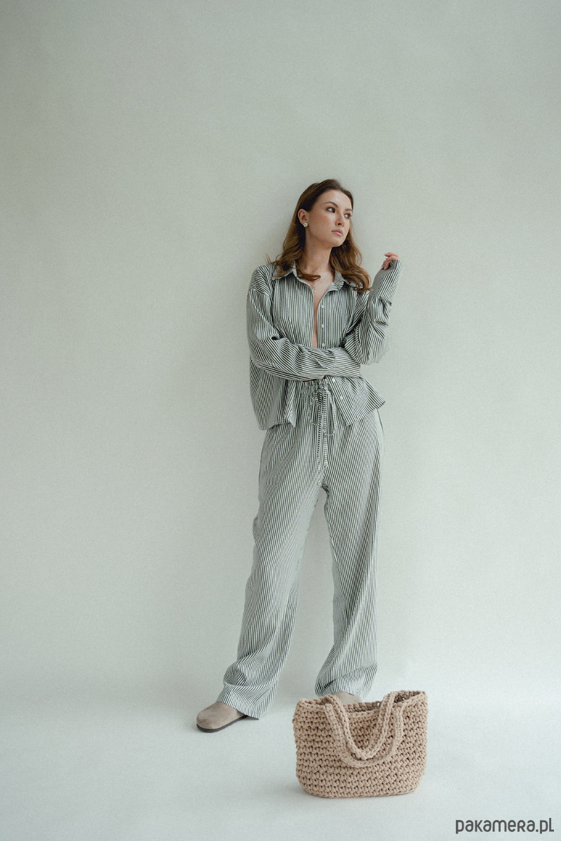 Spodnie w paski to HIT sezonu. Chcesz poczuć się wygodnie i stylowo? Te spodnie są dla Ciebie, szerokie, luźne nogawki, w pasie szeroka gumka która dopasowuję się do talii i sznurek który możesz zawiązać. Piękne połączenie kolorów, zieleni ze śmietanką. W środku kieszenie. Dobierz do nich koszule i stwórz codzienny piżamowy look!
