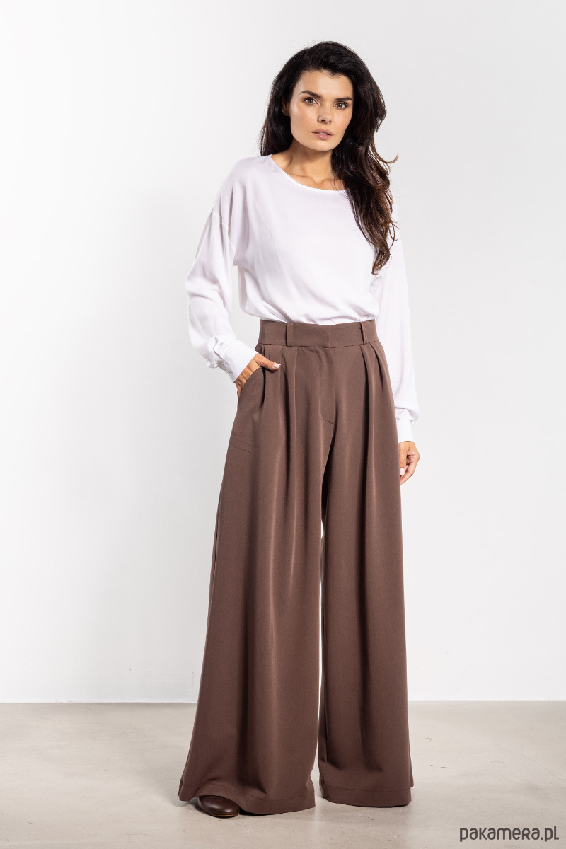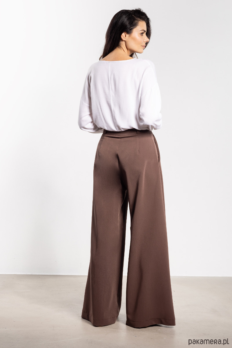 Stylowe spodnie z szerokimi nogawkami łączą wygodę z elegancją. Wysoki stan podkreśla talię i optycznie wydłuża sylwetkę, a rozszerzane nogawki nadają lekkości i nowoczesnego charakteru. Model sprawdzi się zarówno w codziennych stylizacjach, jak i w zestawieniach biurowych czy bardziej formalnych. Świetnie komponuje się z marynarką, koszulą czy swetrem, a praktyczne kieszenie boczne zwiększają funkcjonalność. Ponadczasowy fason pozwala tworzyć wiele modnych kombinacji i gwarantuje uniwersalność.