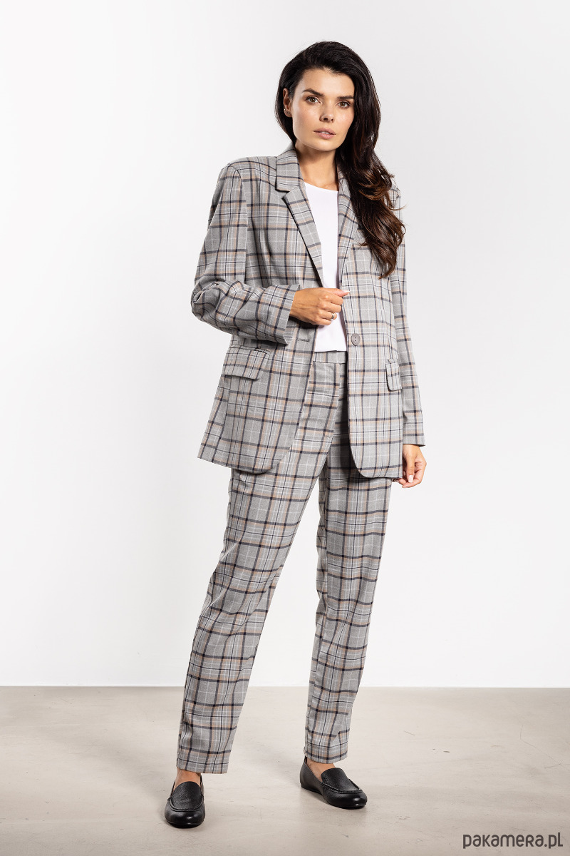 Eleganckie spodnie cygaretki w ponadczasowy wzór kraty łączą styl i wygodę. Prosty, dopasowany fason pięknie układa się na sylwetce, a średni stan zapewnia komfort przez cały dzień. Charakterystyczna kratka dodaje elegancji, dzięki czemu spodnie sprawdzą się zarówno w biurowych, jak i codziennych stylizacjach. Praktyczne kieszenie boczne zwiększają funkcjonalność, a uniwersalny design pozwala zestawiać je z koszulami, swetrami czy marynarkami, tworząc różnorodne, efektowne looki.