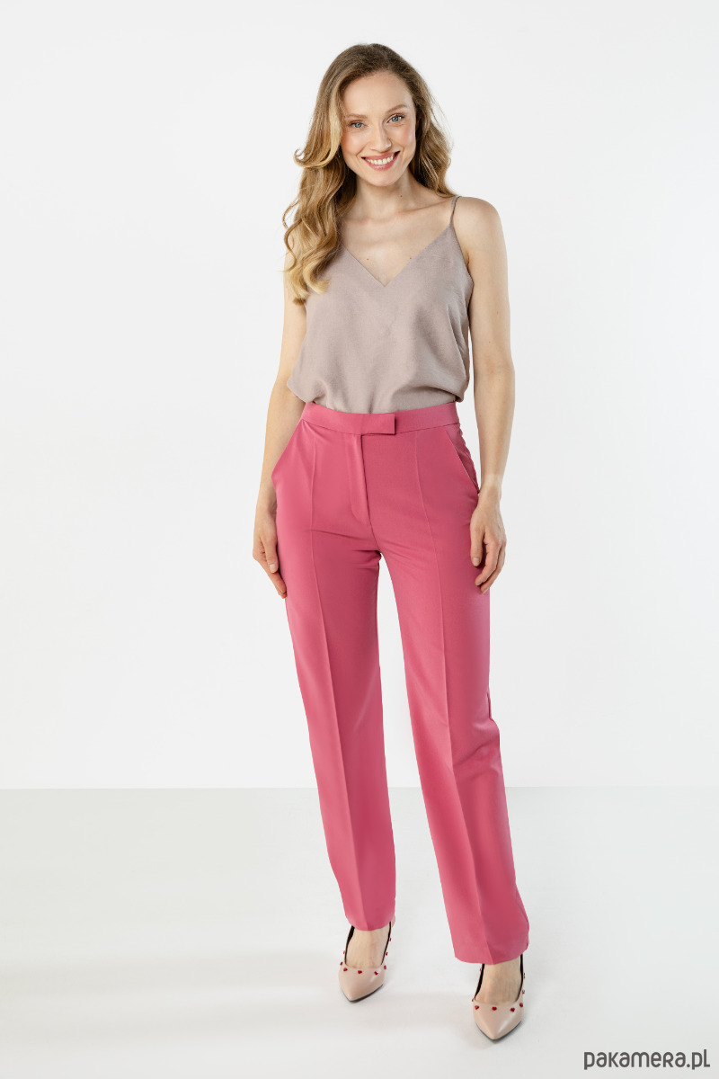 Spodnie w wyrazistym, malinowym kolorze o eleganckim, lekko zwężanym kroju. Model z kantem subtelnie wysmukla sylwetkę, a gładki materiał i klasyczny fason sprawiają, że świetnie sprawdzi się zarówno w codziennych, jak i bardziej szykownych stylizacjach.