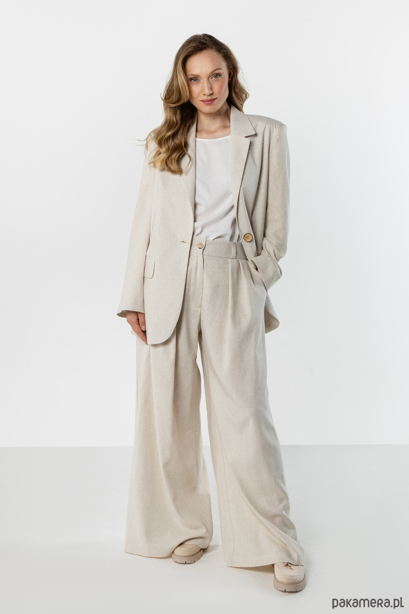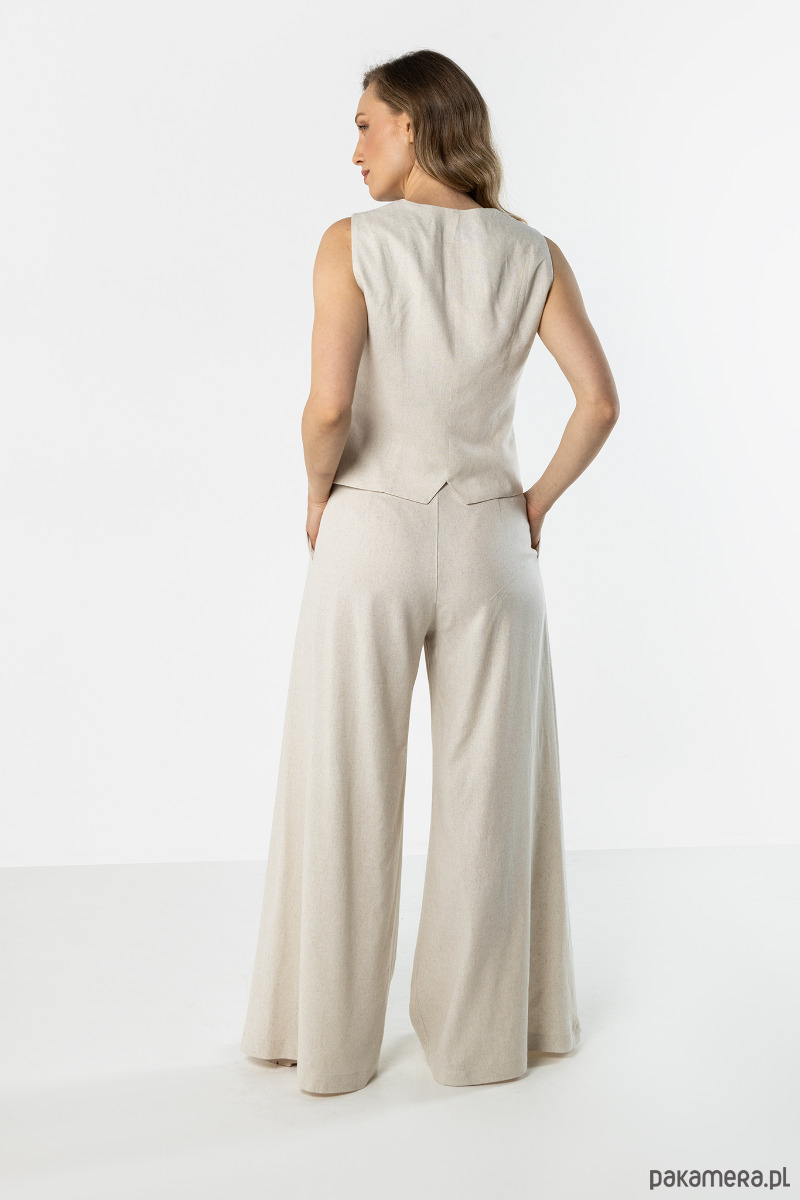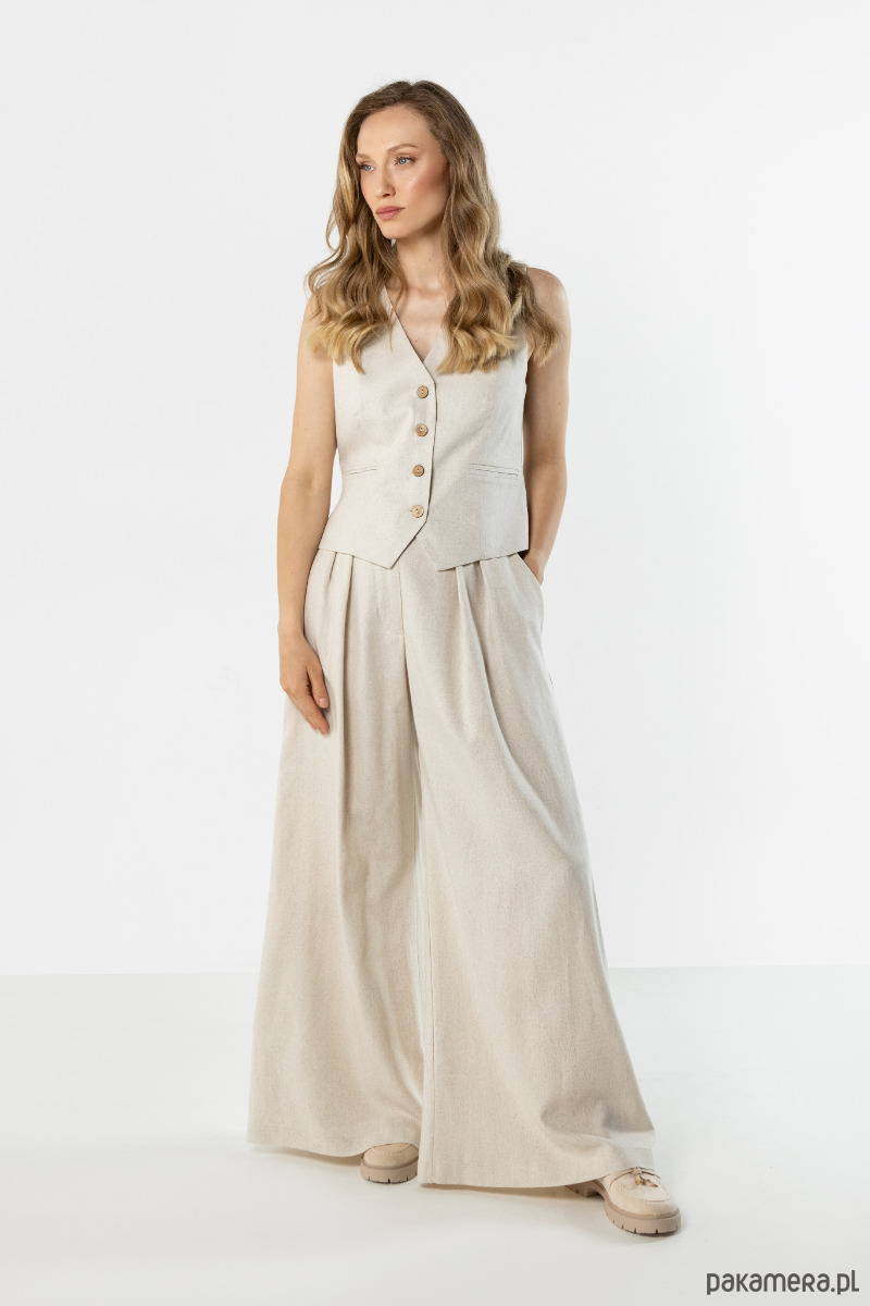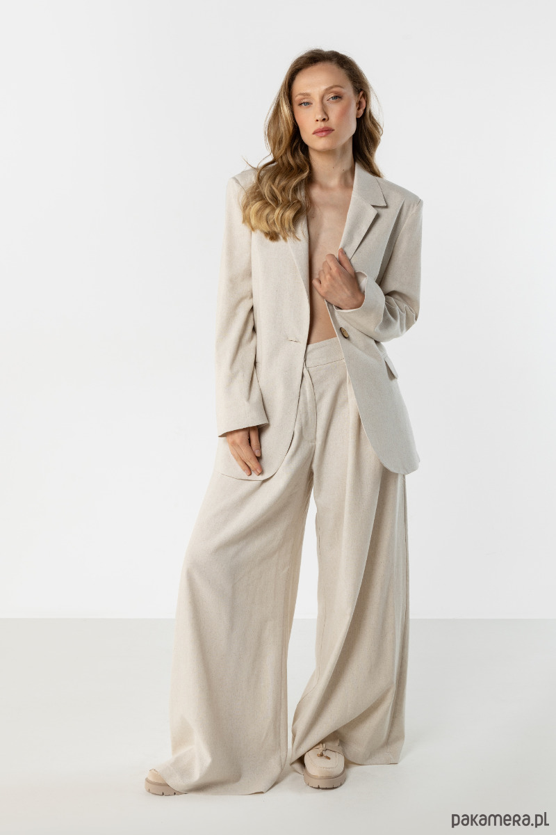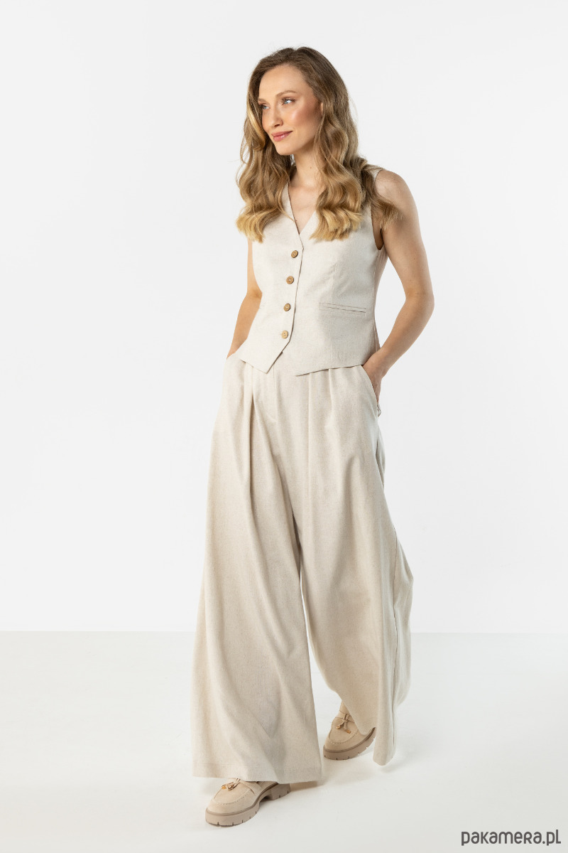 Spodnie w jasnym, naturalnym odcieniu beżu o szerokim, swobodnie układającym się kroju. Model z wysokim stanem i szerokimi nogawkami optycznie wydłuża sylwetkę, a lekki materiał zapewnia komfort noszenia. Idealne do eleganckich i casualowych stylizacji.
