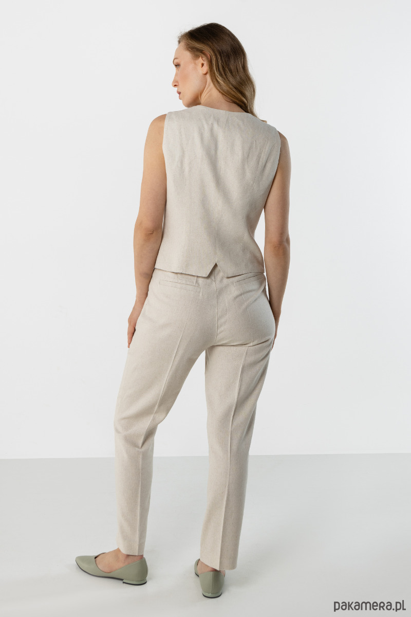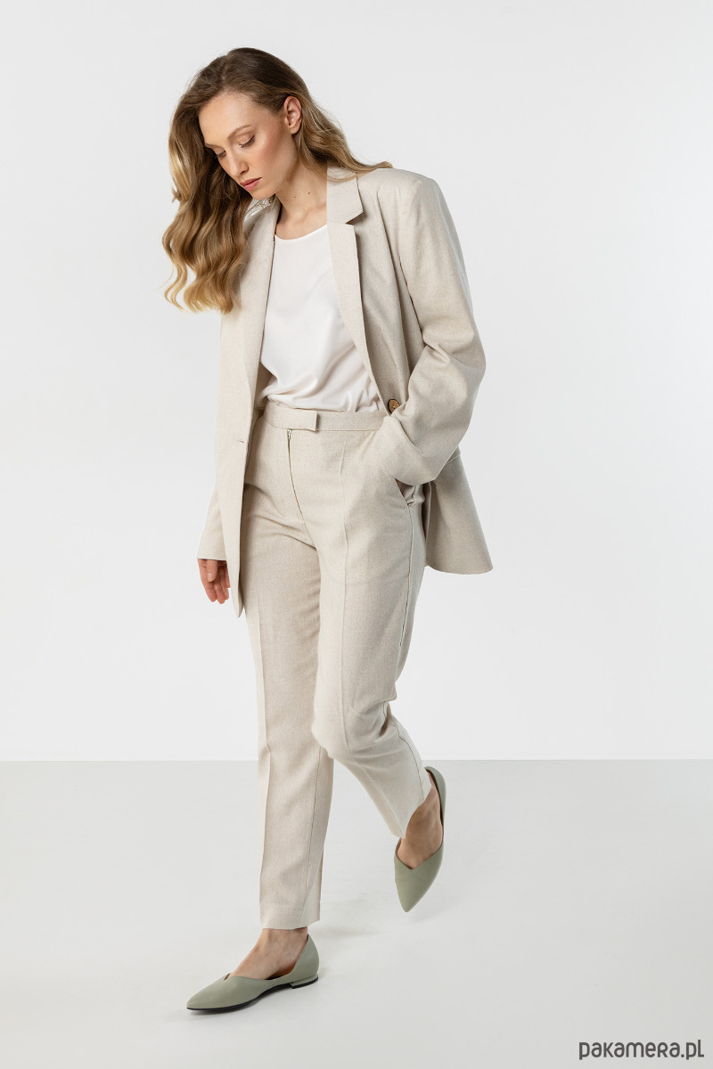 Eleganckie spodnie w kolorze jasnego beżu o prostym, kobiecym kroju. Model z wysokim stanem pięknie układa się na sylwetce, zapewniając wygodę noszenia i stylowy wygląd. Idealne do biura, na spotkania i codzienne stylizacje.
