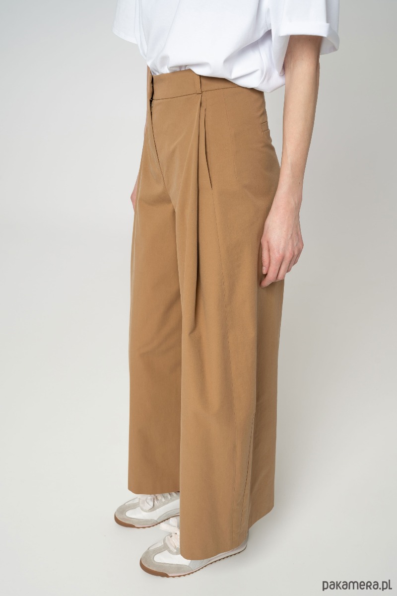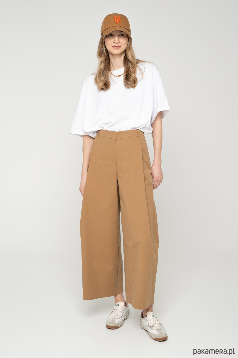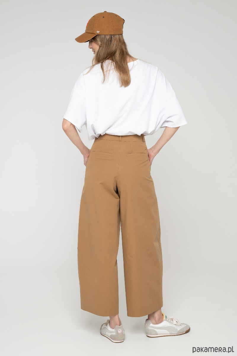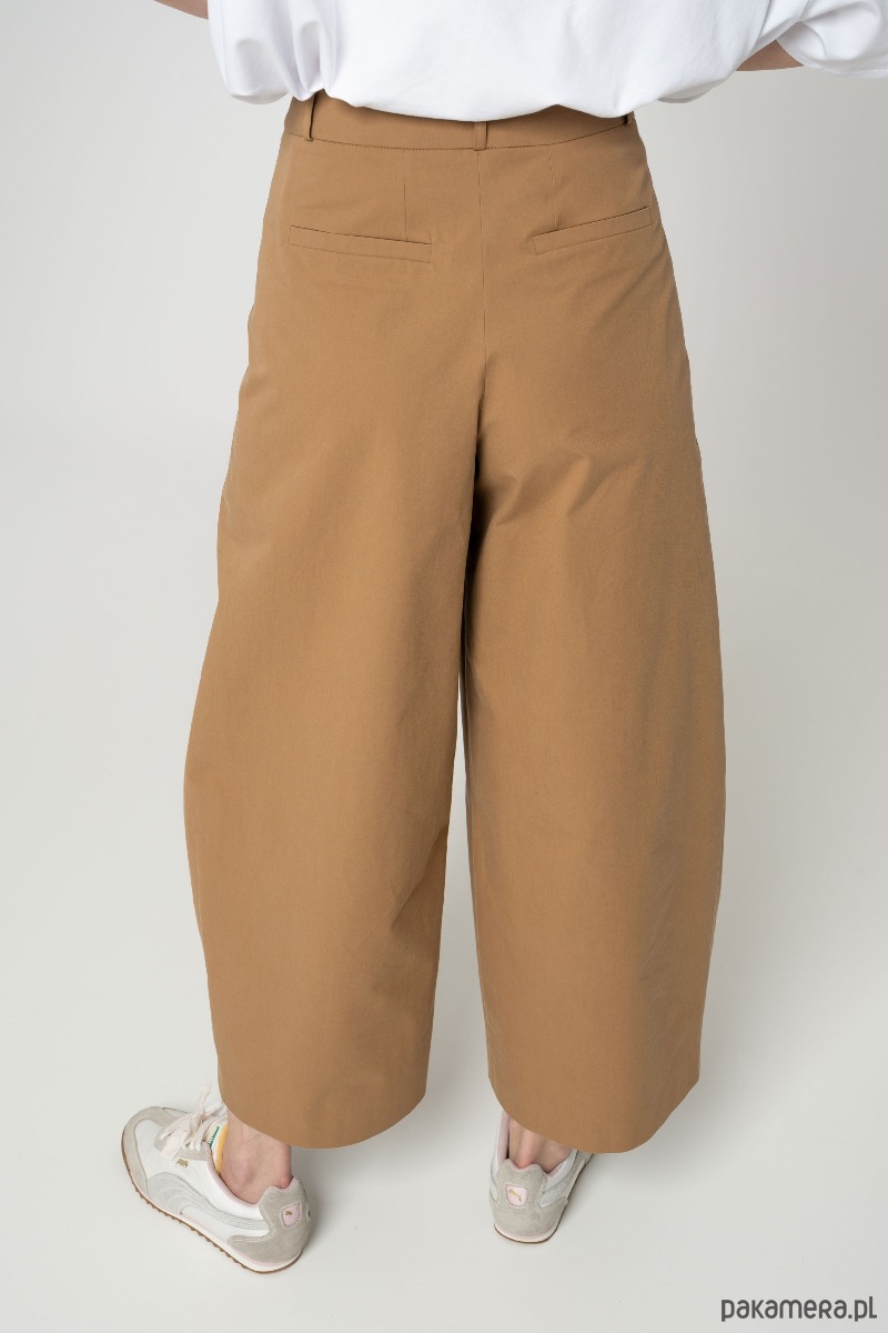 Bawełniane szerokie spodnie ze zwężaną nogawką. Przy pasku głęboka zakładka nadaje balonowy charakter. Fason wyszczupla biodra i dodaje luzu. Uszyte z wysokogatunkowej bawełny.
