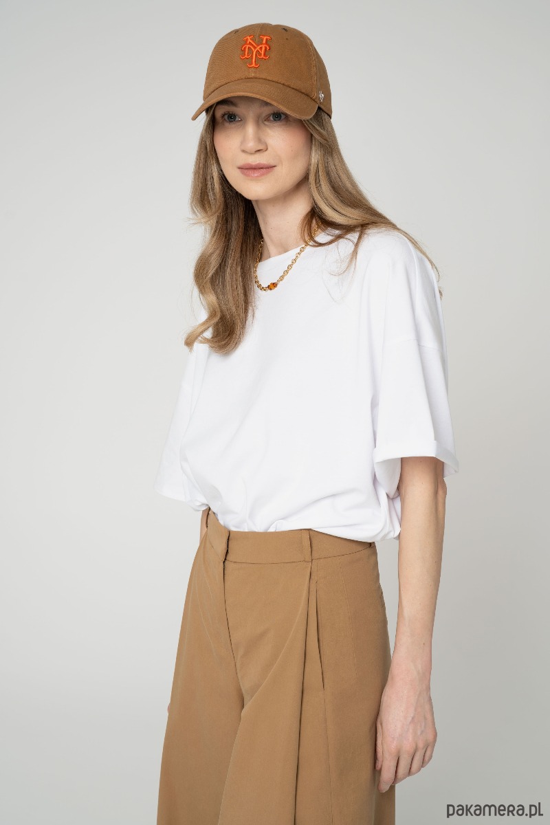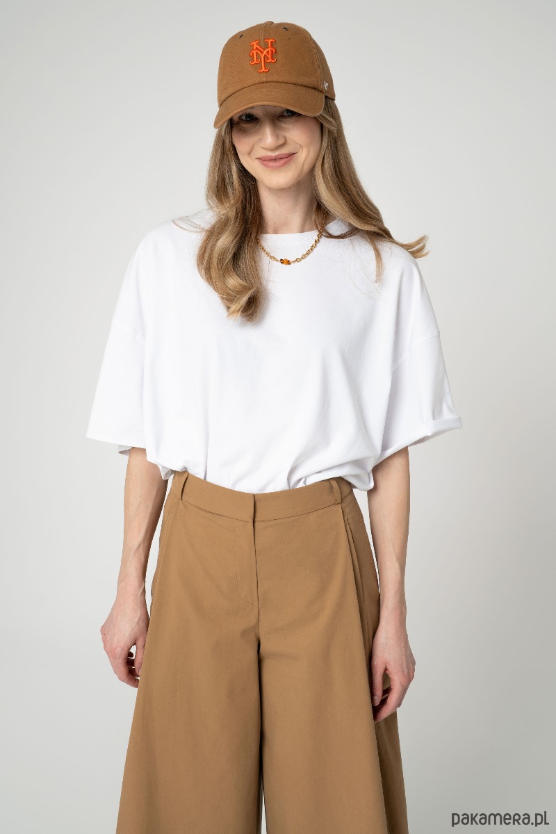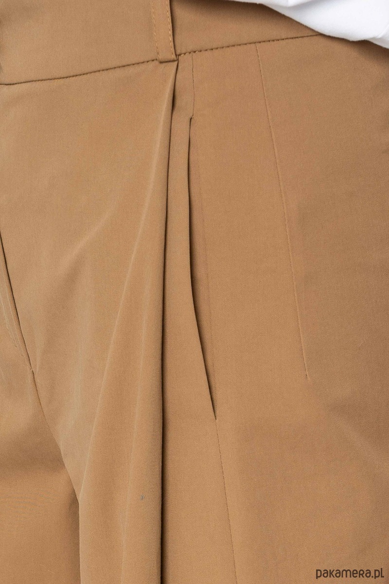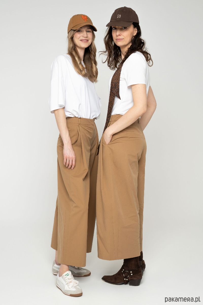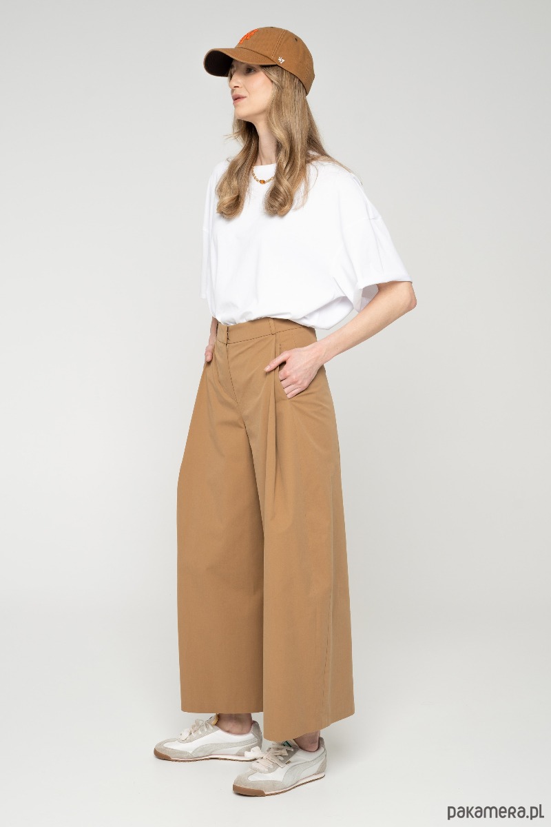 Bawełniane szerokie spodnie ze zwężaną nogawką. Przy pasku głęboka zakładka nadaje balonowy charakter. Fason wyszczupla biodra i dodaje luzu. Uszyte z wysokogatunkowej bawełny.