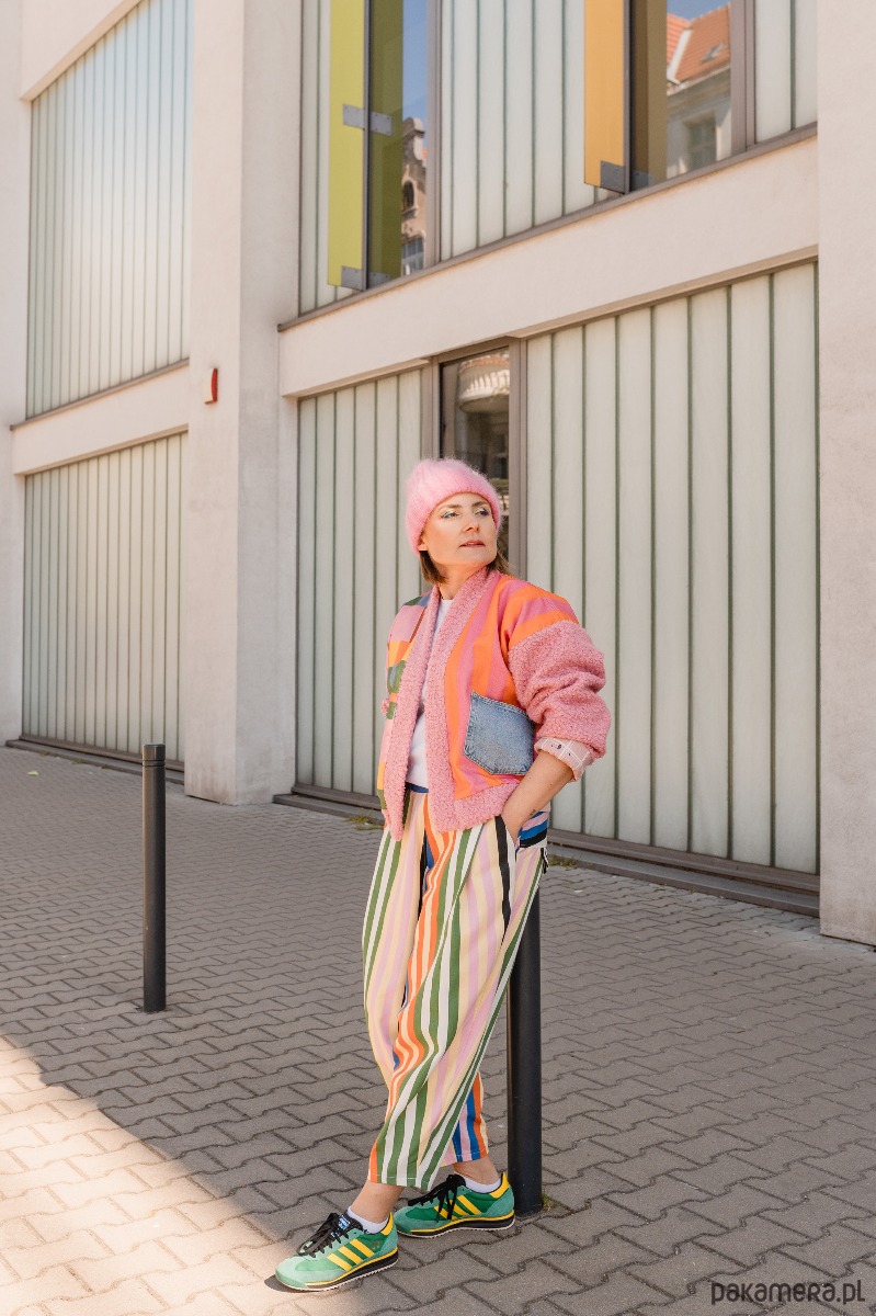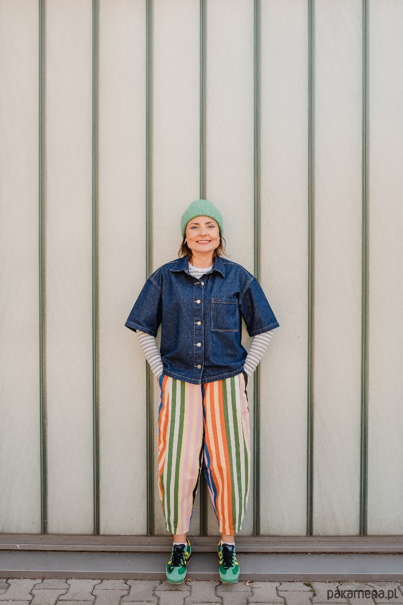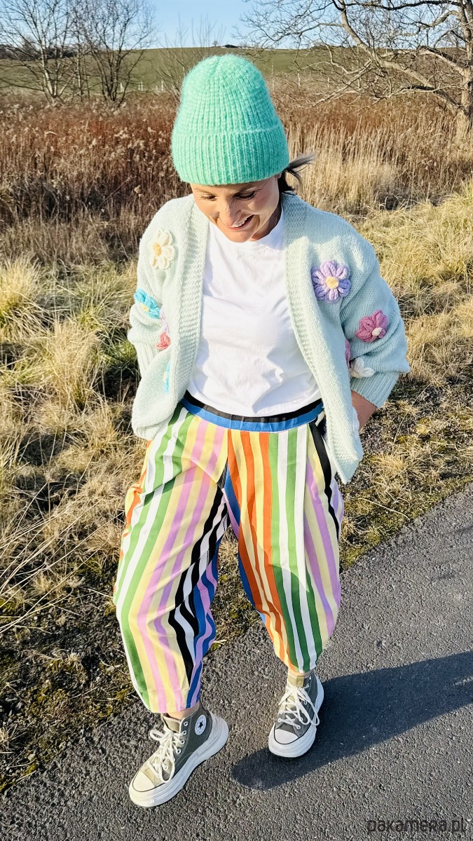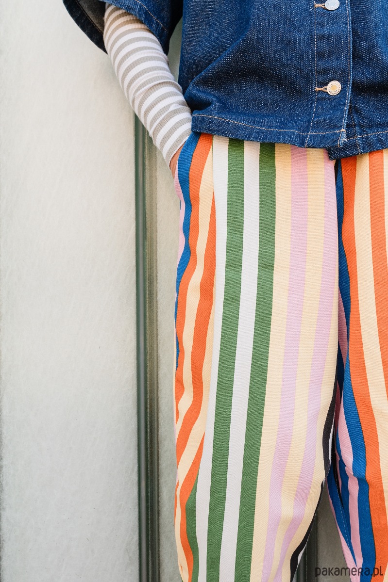 Te spodnie to odważne połączenie wygody i wyrazistego stylu. Wykonane z grubej bawełny w szalony wzór kolorowych pasków, wyróżniają się unikalnym, beczkowym krojem, który nadaje sylwetce charakterystyczny kształt.