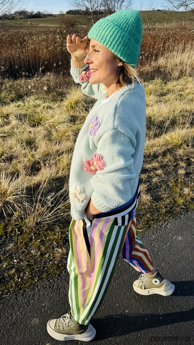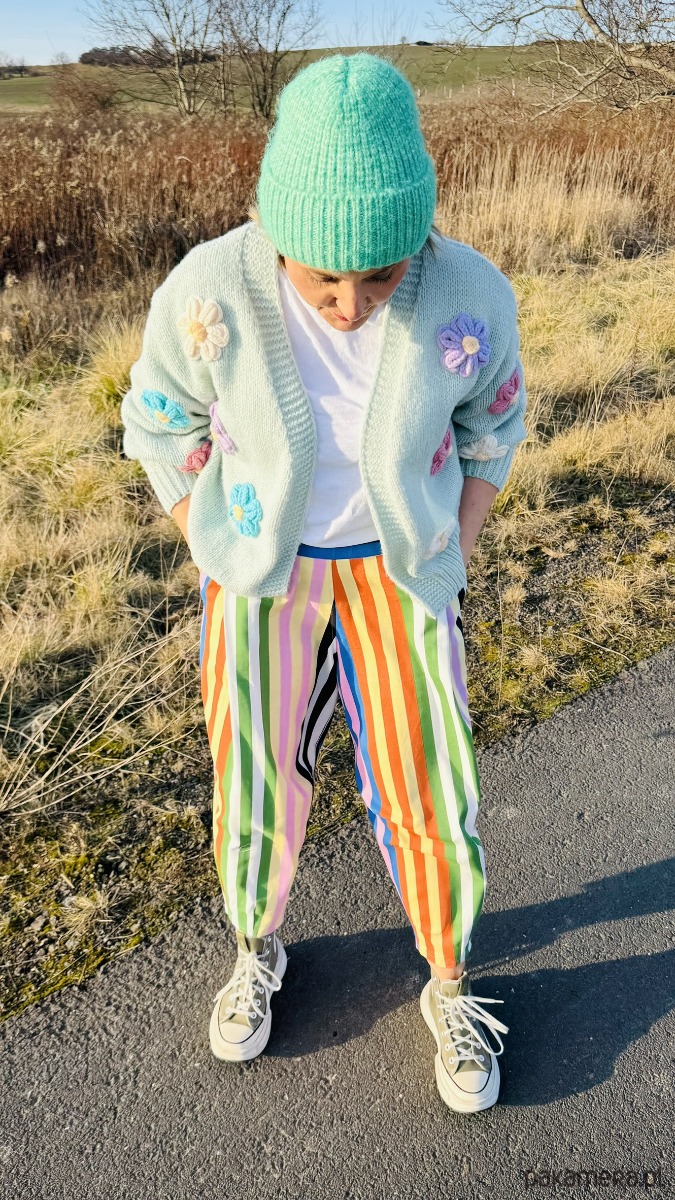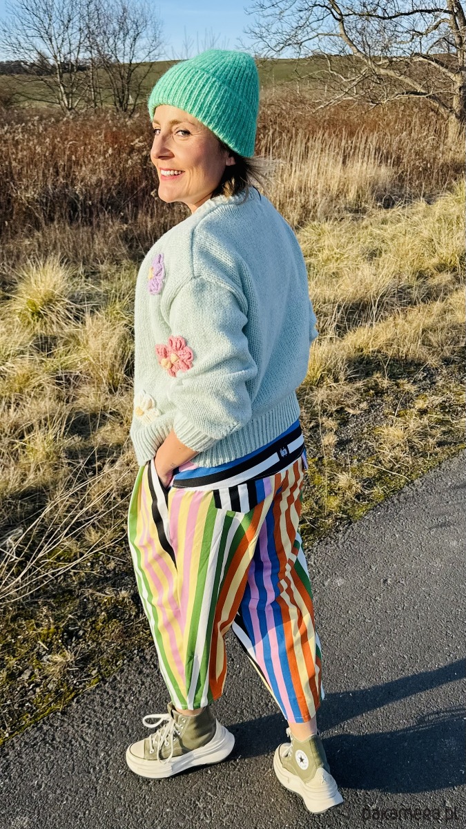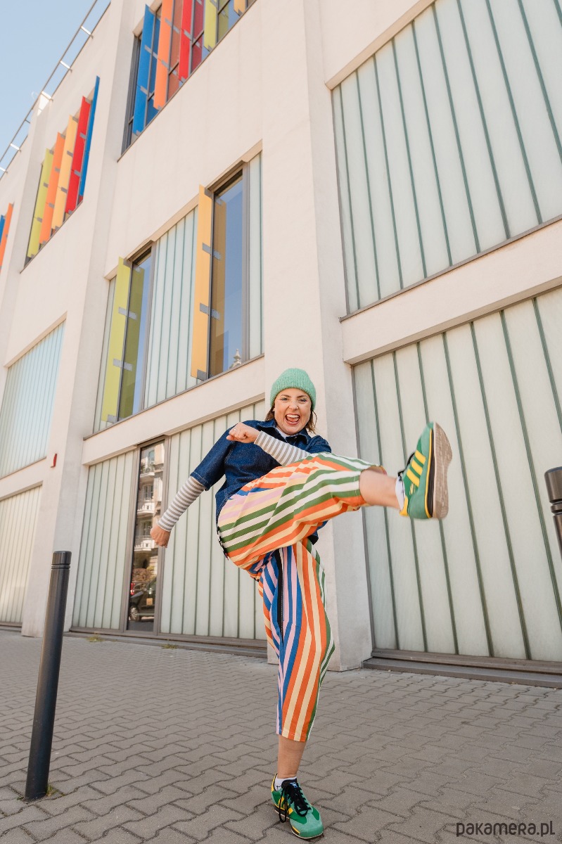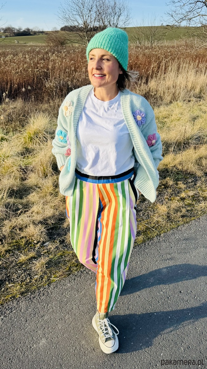 Te spodnie to odważne połączenie wygody i wyrazistego stylu. Wykonane z grubej bawełny w szalony wzór kolorowych pasków, wyróżniają się unikalnym, beczkowym krojem, który nadaje sylwetce charakterystyczny kształt.