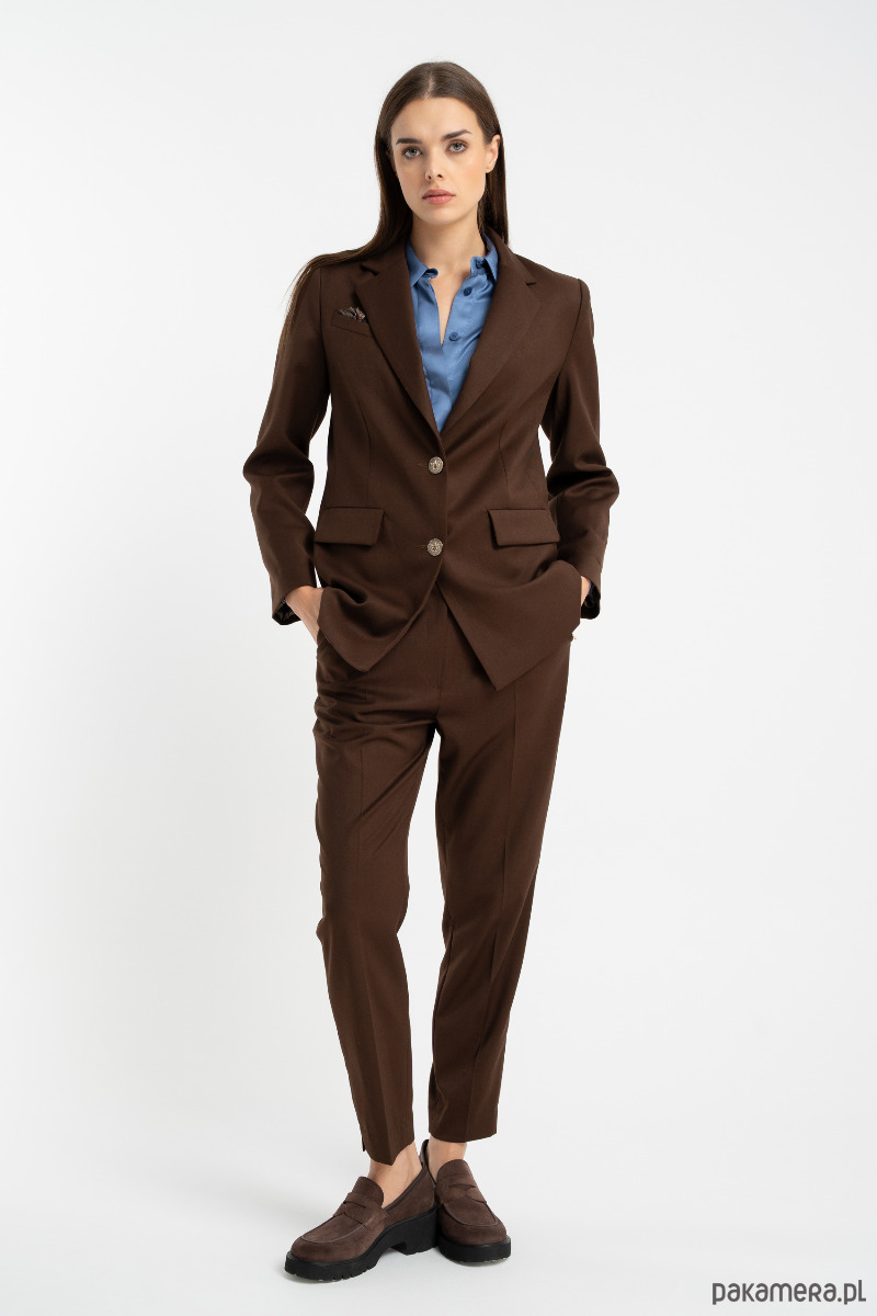 Brązowe spodnie w kantkę, ze zwężaną nogawką i zapięciem na zamek umieszczonym w bocznym szwie.