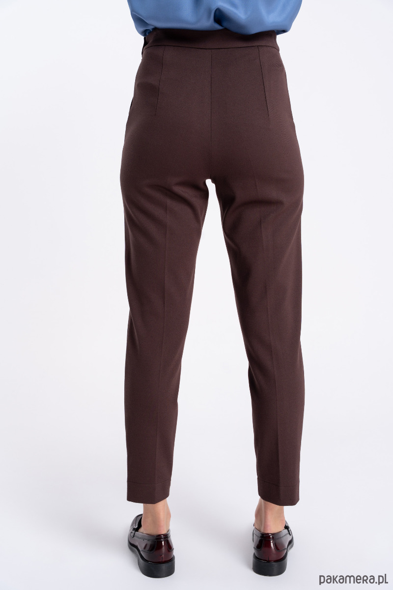 Brązowe spodnie w kantkę, ze zwężaną nogawką i zapięciem na zamek umieszczonym w bocznym szwie.