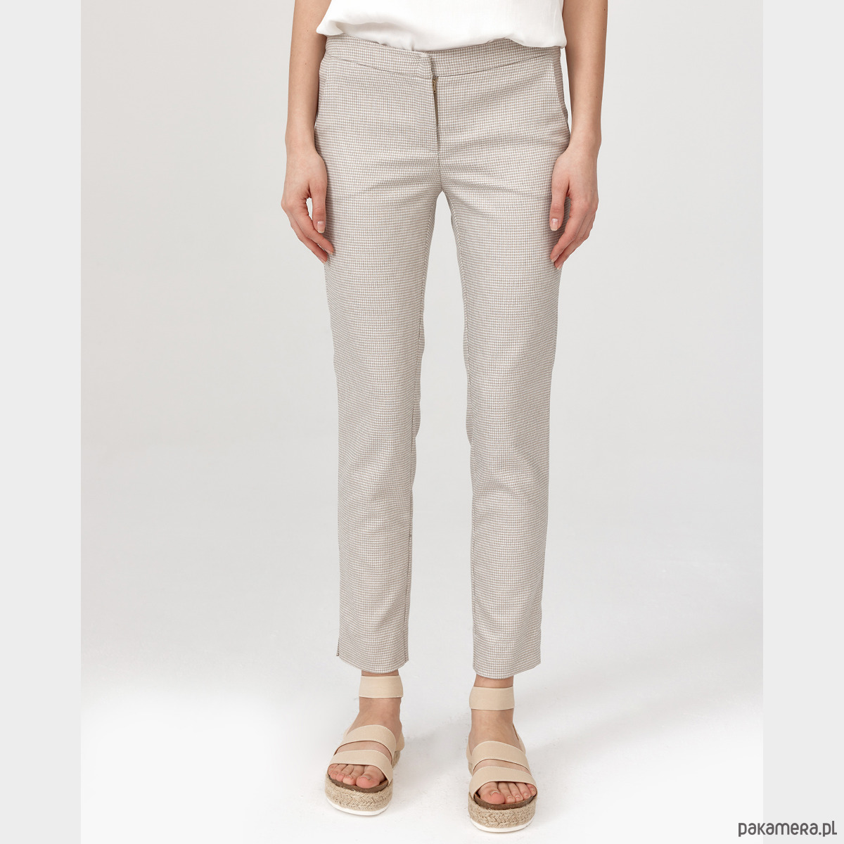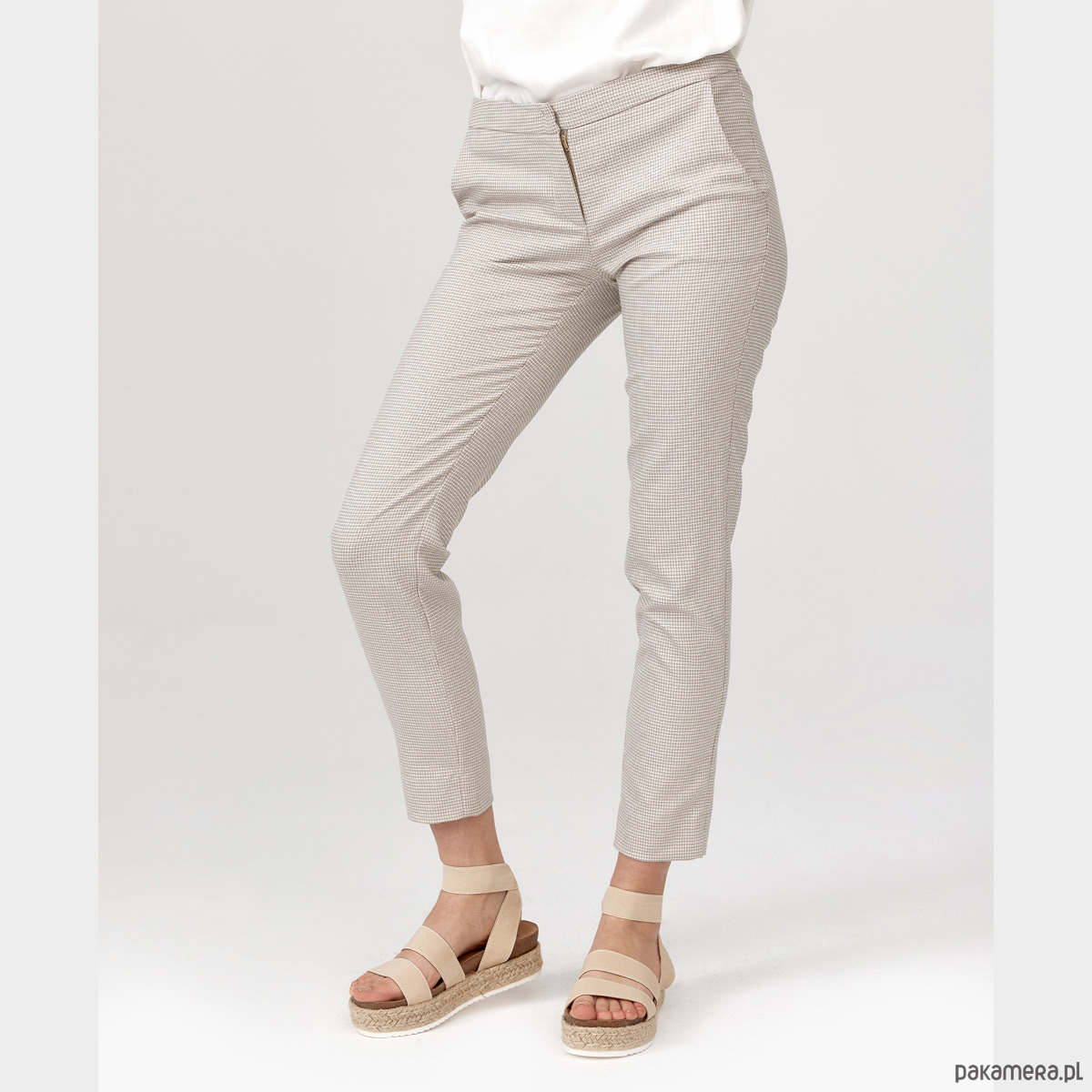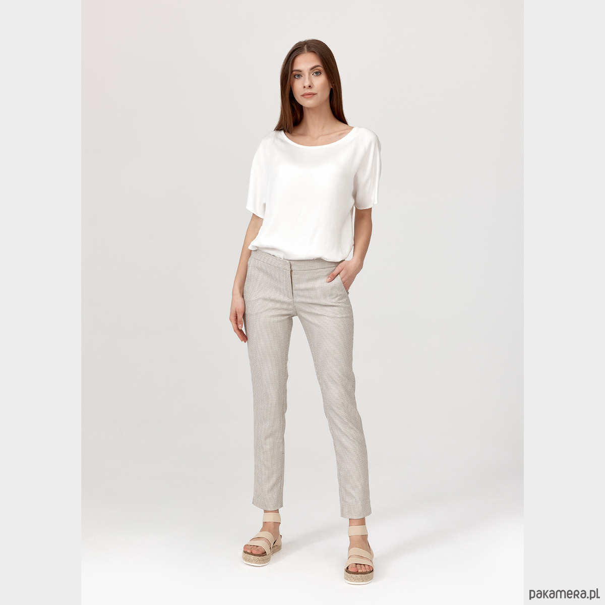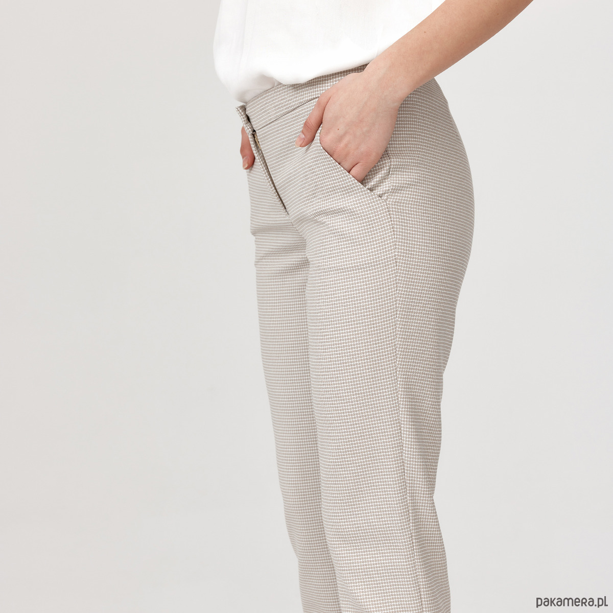 Eleganckie, długie spodnie z kieszeniami z pęknięciem przy nogawce. Uszyte z miękkiej bawełnianej tkaniny z domieszką elastanu. Materiał w delikatny prążek, który optycznie wydłuży i wysmukli sylwetkę. Krój typu cygaretki, zwężane nogawki. Idealne na co dzień jak i do pracy.