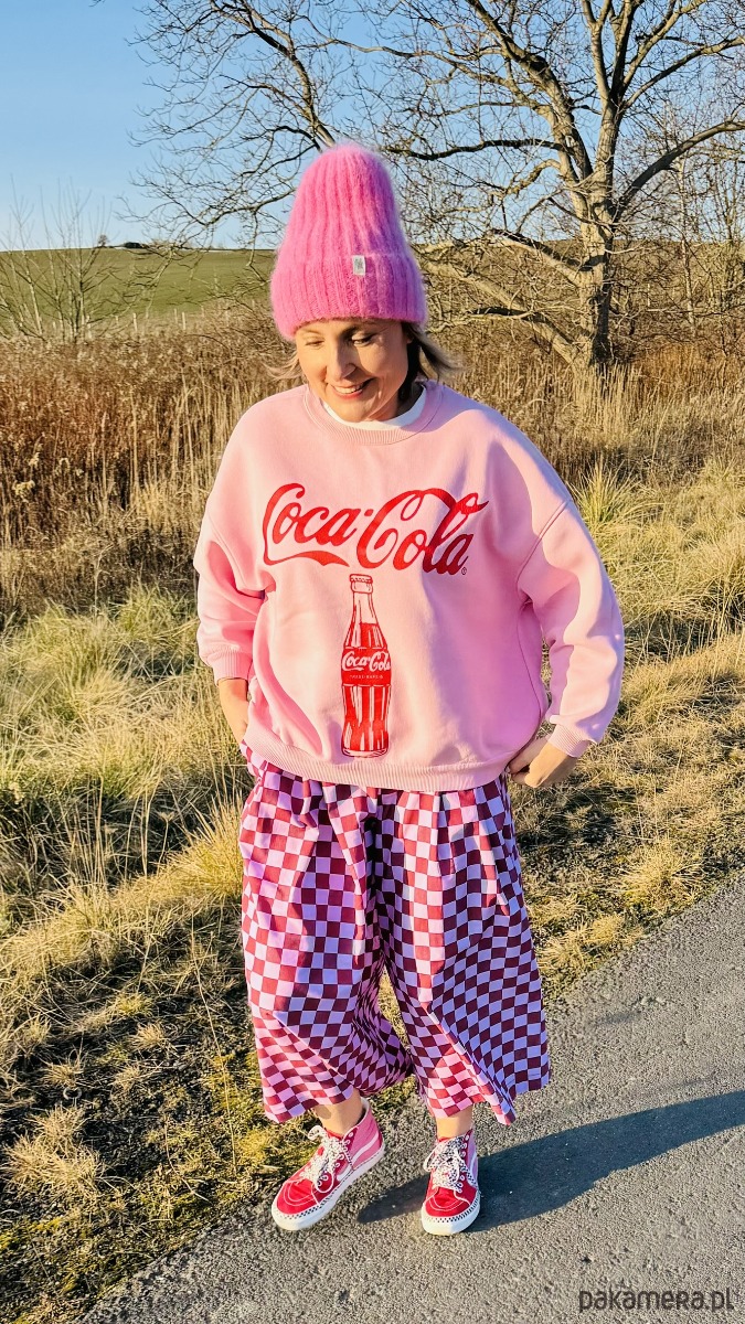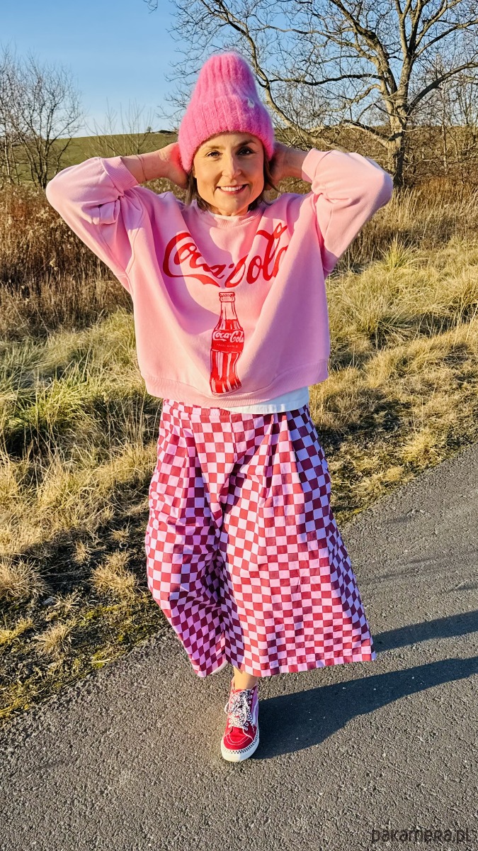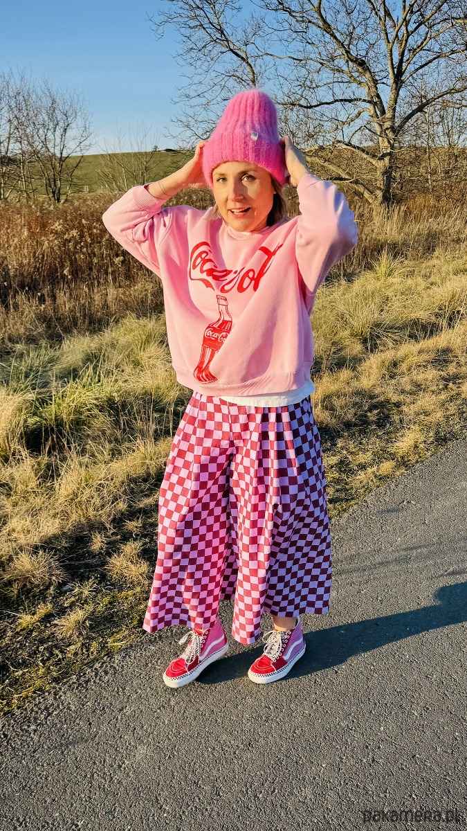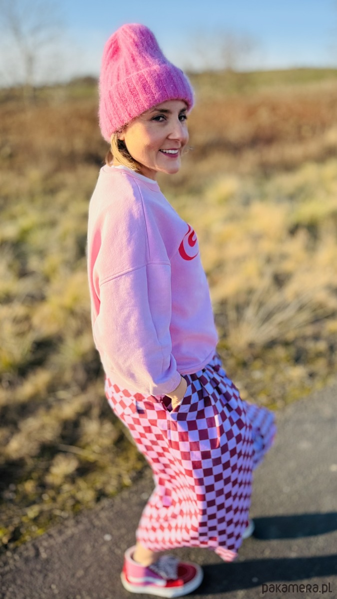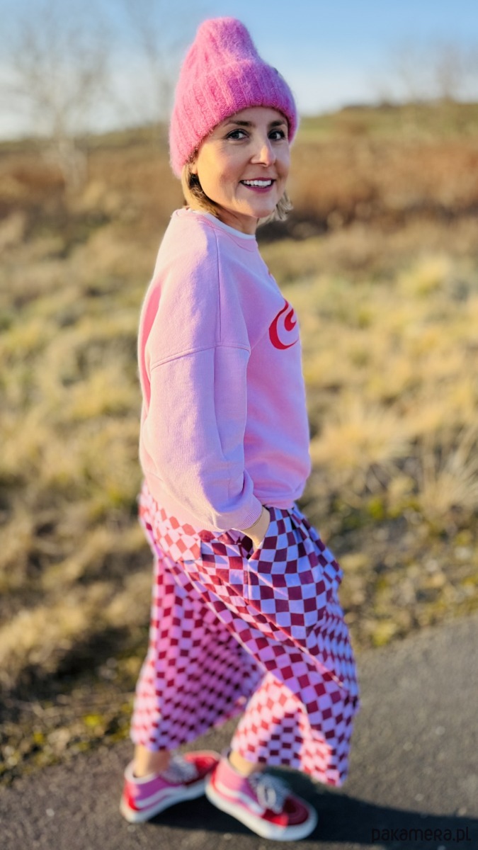 Szachowniczy wzór w odcieniach różu i delikatnego fioletu dodaje im oryginalności, a luźny krój culotte zapewnia komfort i swobodę ruchów. W pasie wszyta jest elastyczna gumka, dzięki czemu spodnie doskonale dopasowują się do sylwetki. Praktyczność podkreślają duże, przednie kieszenie, a z tyłu znajdują się subtelne patki imitujące kieszenie.