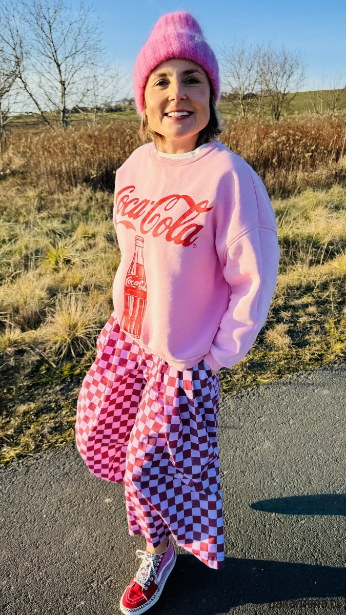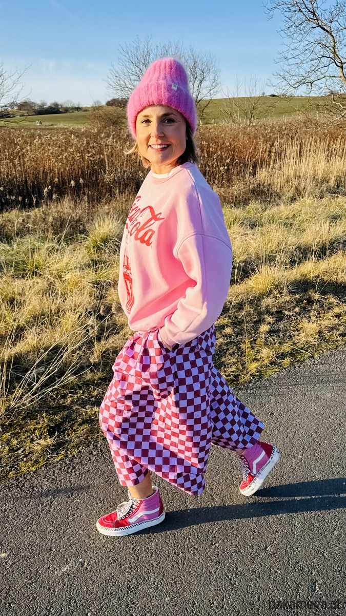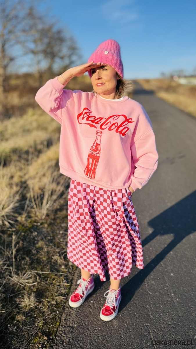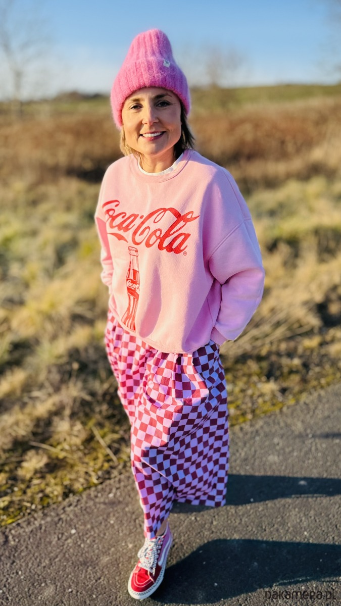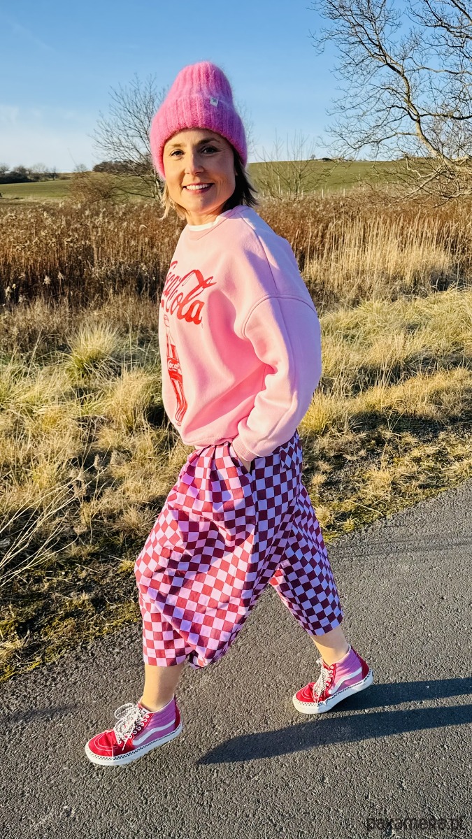 Szachowniczy wzór w odcieniach różu i delikatnego fioletu dodaje im oryginalności, a luźny krój culotte zapewnia komfort i swobodę ruchów. W pasie wszyta jest elastyczna gumka, dzięki czemu spodnie doskonale dopasowują się do sylwetki. Praktyczność podkreślają duże, przednie kieszenie, a z tyłu znajdują się subtelne patki imitujące kieszenie.