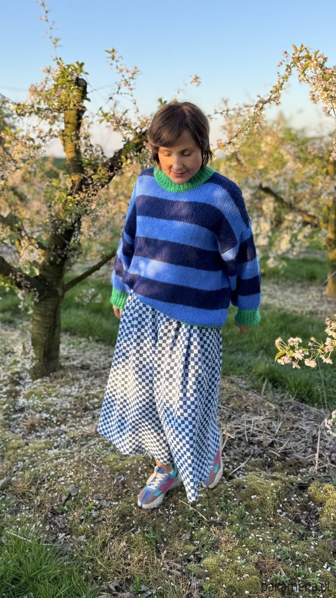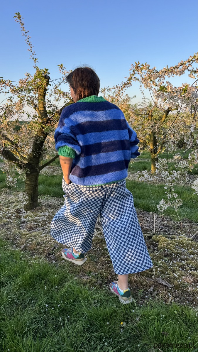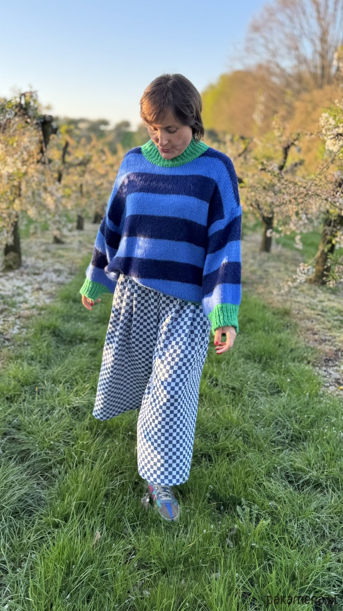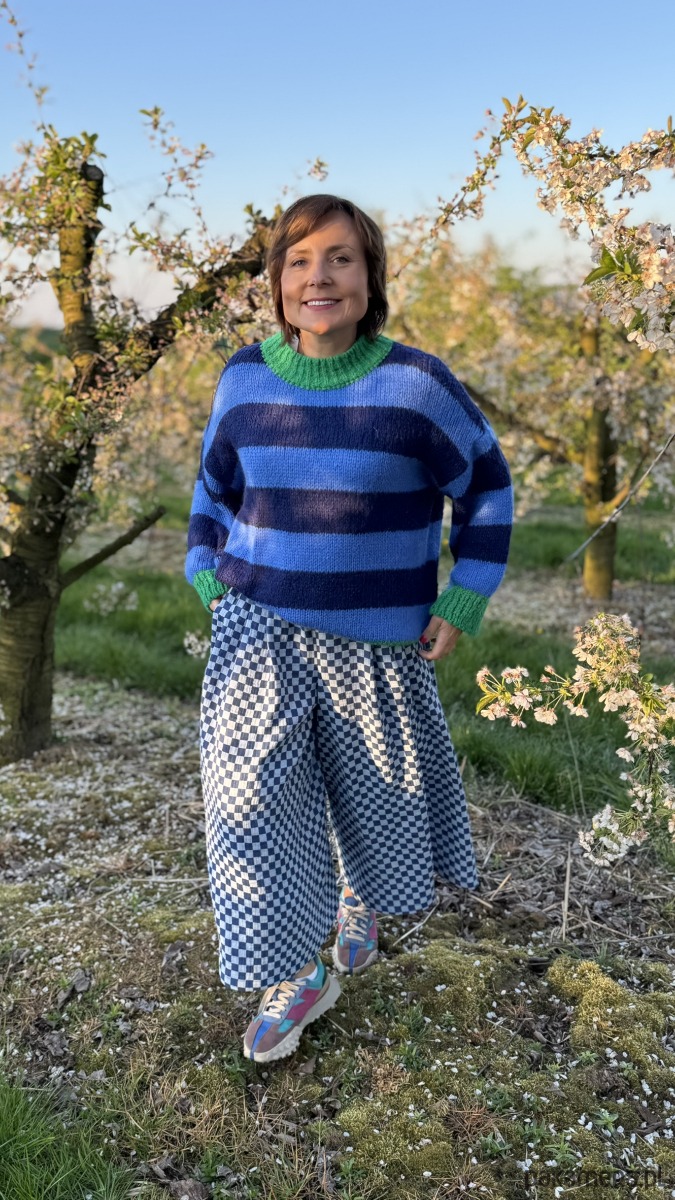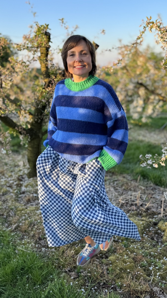 Szachownica w kolorze niebieskim dodaje im oryginalności, a luźny krój culotte zapewnia komfort i swobodę ruchów. W pasie wszyta jest elastyczna gumka, dzięki czemu spodnie doskonale dopasowują się do sylwetki. Praktyczność podkreślają duże, przednie kieszenie, a z tyłu znajdują się subtelne patki imitujące kieszenie.