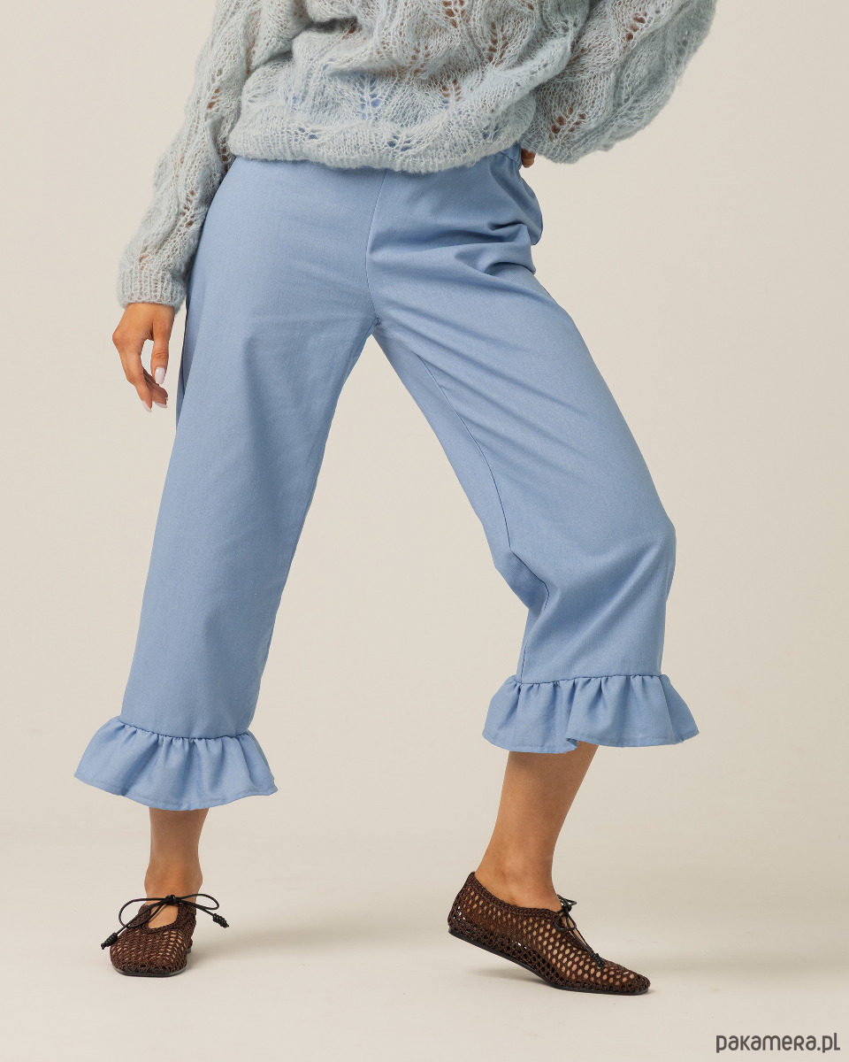 Fason o prostym kroju został uzupełniony szeroką, elastyczną gumą w pasie, dzięki czemu spodnie łatwo dopasowują się do sylwetki i zapewniają wygodę przez cały dzień. Proste nogawki zakończone zostały efektowną, dużą falbaną, która wprowadza lekkość i ruch, a jednocześnie nadaje całości subtelnego, dziewczęcego uroku.