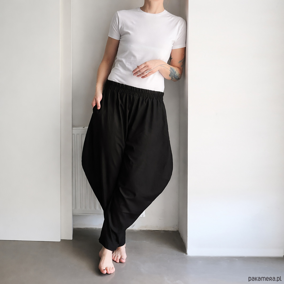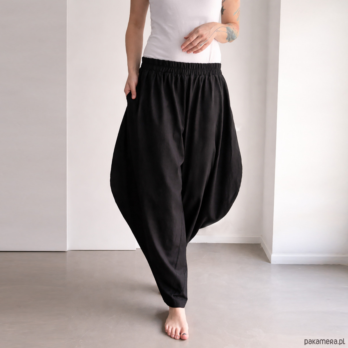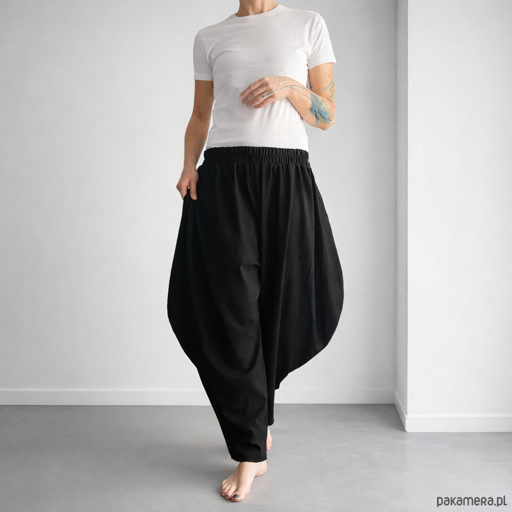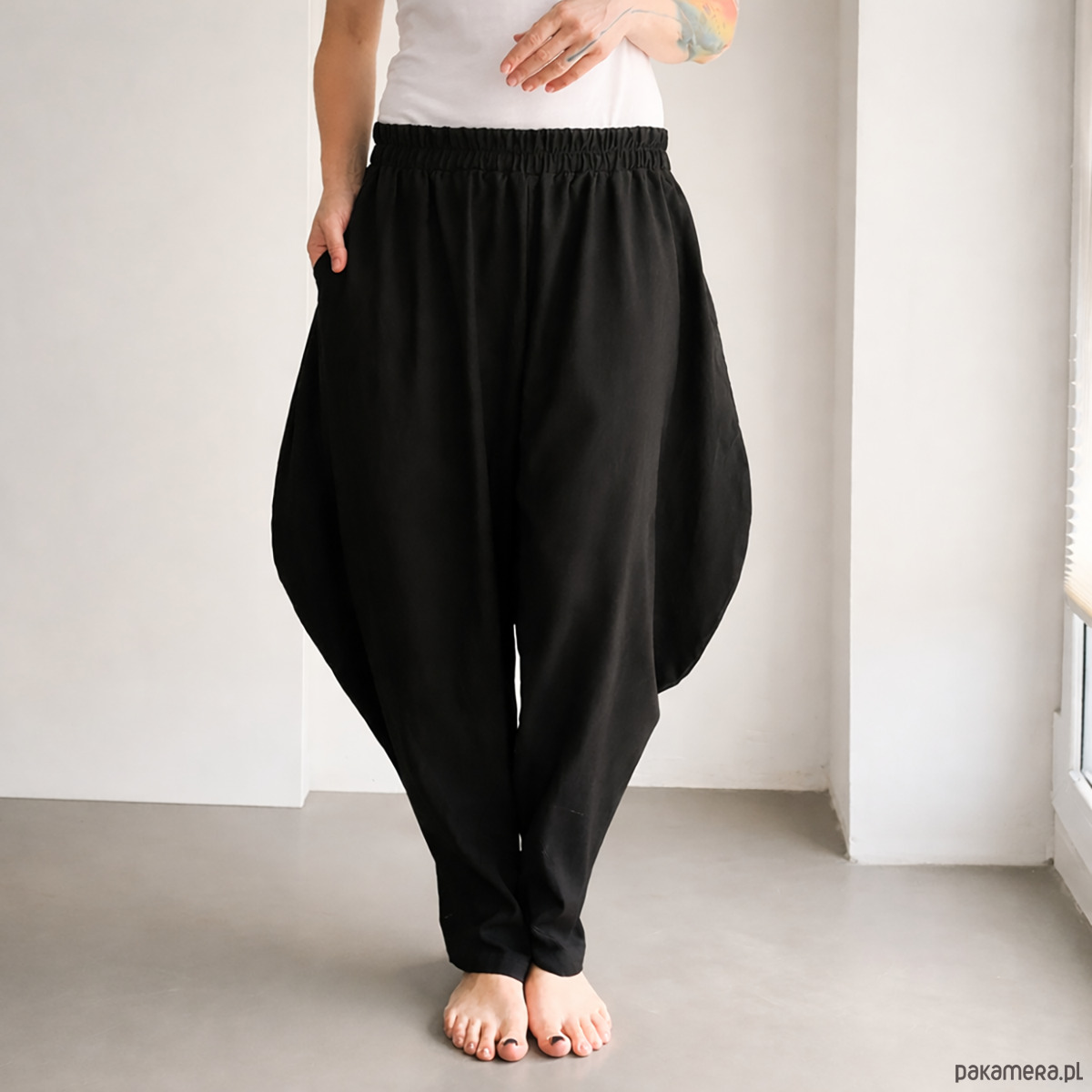 Spodnie, 30% lnu, 70% wizkozy, gramatura 215g/m2, luźne, szersze w biodrach, styl: haremki.