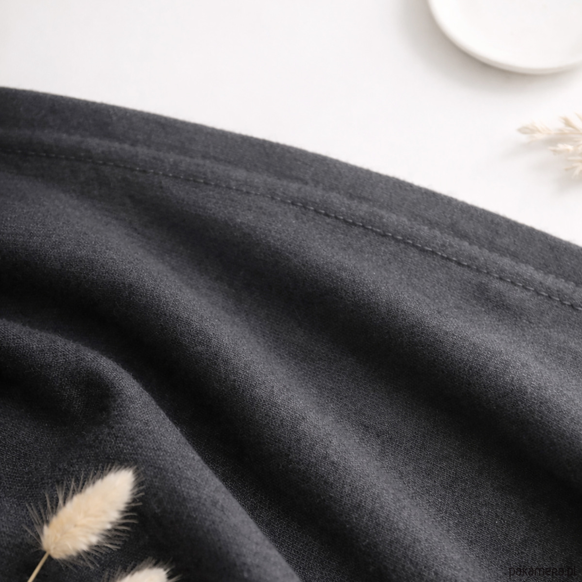 Uszyte z naturalnej tkaniny: 30% lnu i 70% wiskozy. Materiał dobrze się układa, jest lekki i przyjemny w noszeniu, a przy tym daje charakterystyczny lniany, miękki ruch całej formie. Spodnie mają fakturę lnu, ale dzięki przewadze wiskozy nie gniotą się tak bardzo i nie są sztywne ani szorstkie.