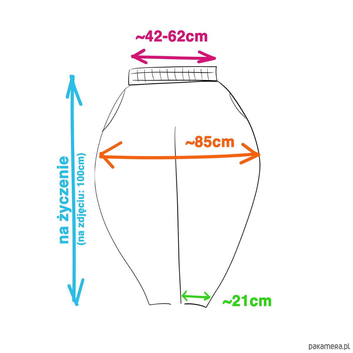 Model wykonujemy w naszej pracowni specjalnie dla Ciebie. Gumka w pasie ma od 40cm do 62cm, w najszerszym miejscu szerokość około 85cm, mierząc na płasko.