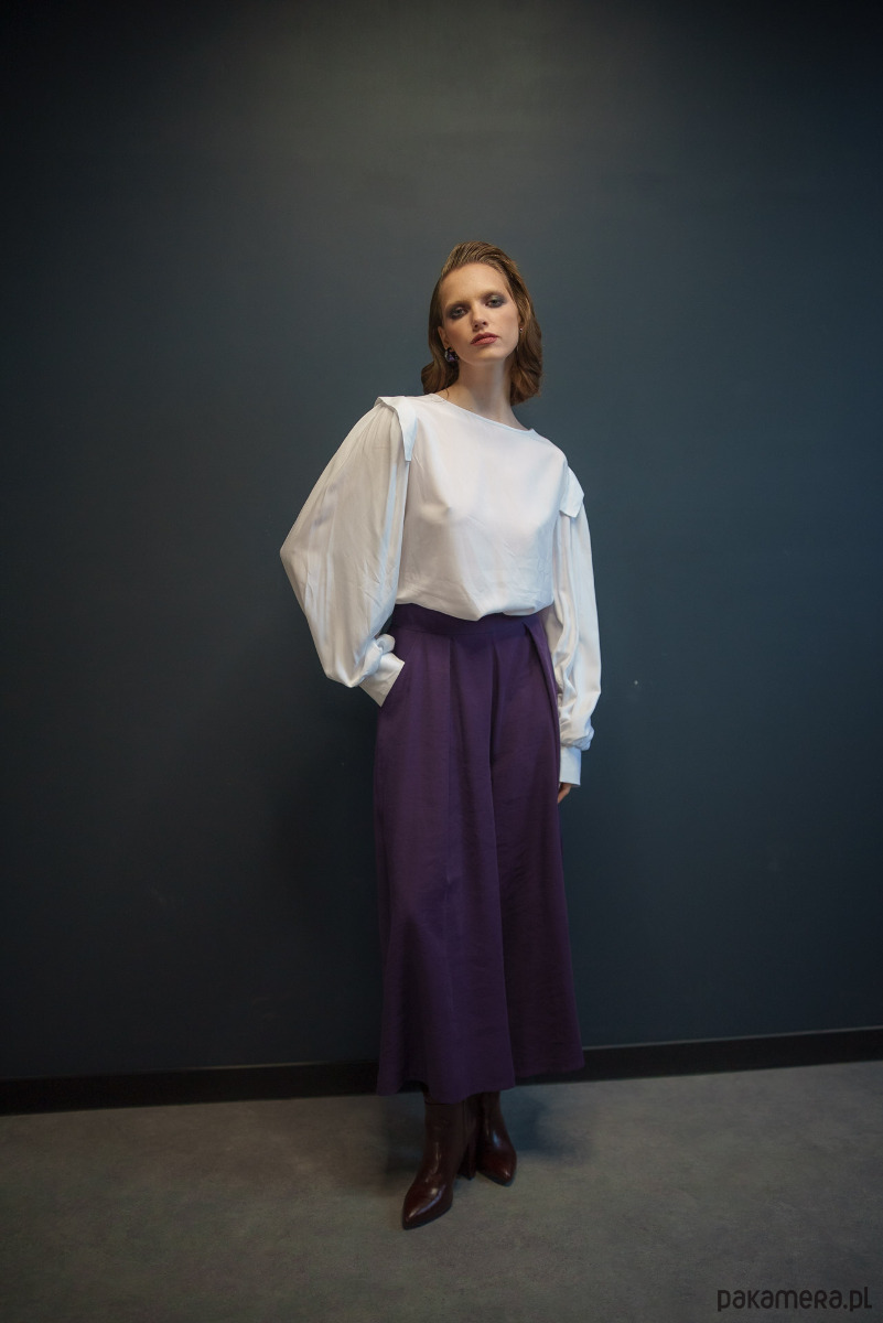 Design: Szeroki krój nóg podkreśla sylwetkę i nadaje lekkości, jednocześnie zapewniając swobodę ruchów. Długość 7/8. Zakładki z przodu skierowane do wewnątrz.