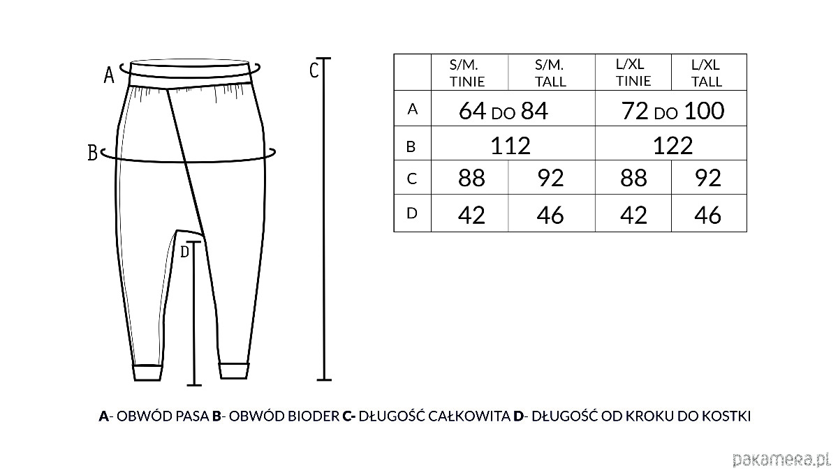 -spodnie dostępne w rozmiarze S/M oraz L/XL Każdy z tych rozmiarów ma dwie opcje długości TINIE dla wzrostu 160- 168 cm oraz TALL 168-174 cm