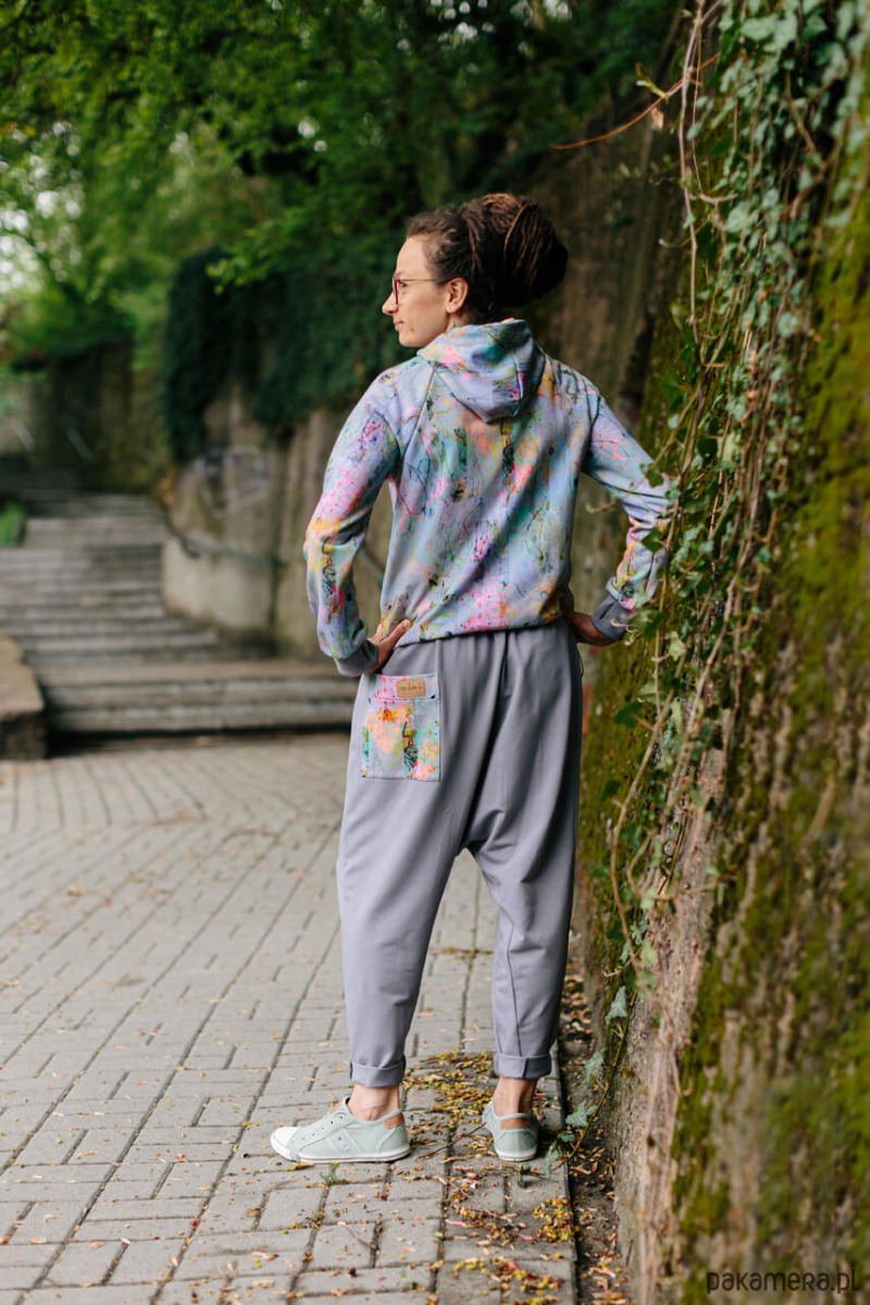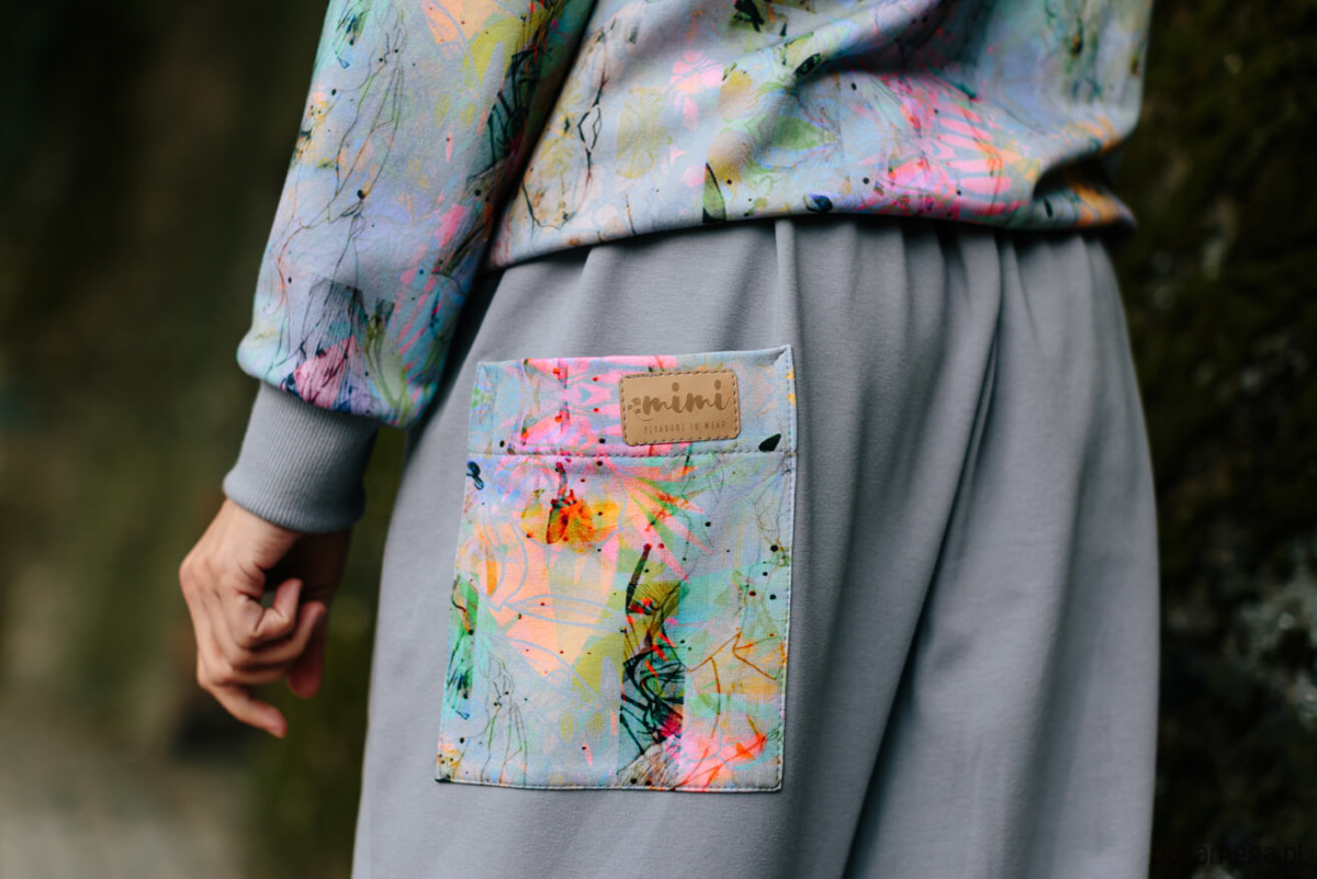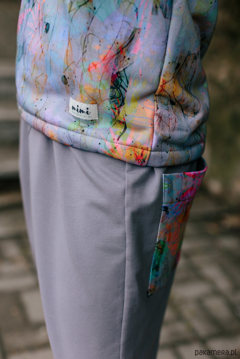 -użyte kolory: ciepły szary, multikolorowy, autorski nadruk.