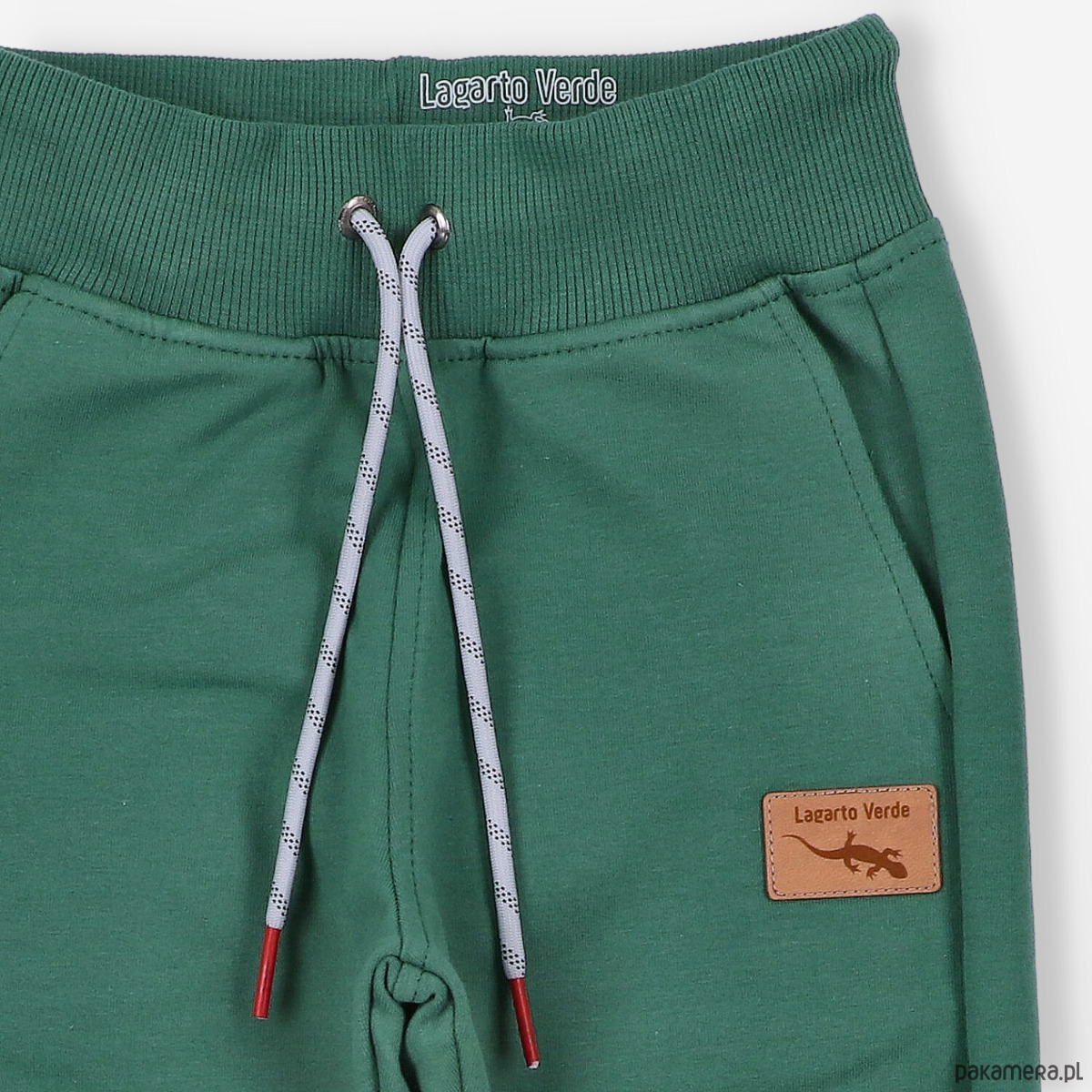Spodnie dresowe dla chłopca z bocznymi kieszeniami wyprodukowane w Polsce. Dzięki użyciu wysokogatunkowej dzianiny dresowej z dodatkiem elastanu, spodenki nie wypychają się na kolanach, nie zmieniają kolorów, ani nie rozciągają się nawet po wielokrotnym praniu.