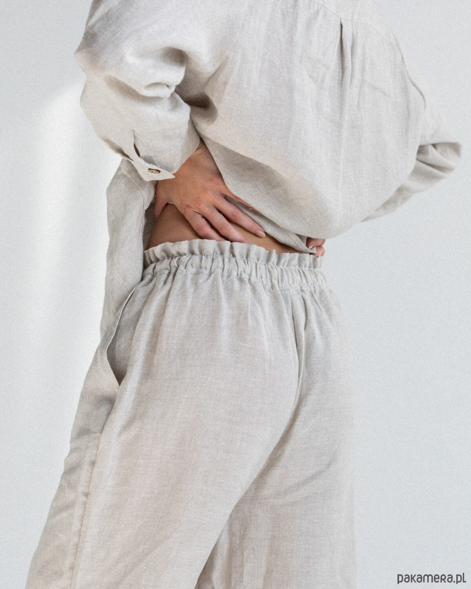 Długie, lniane spodnie z kieszeniami. W pasie posiadają gumkę. Sprawdzą się na co dzień, w podróży czy do spania.