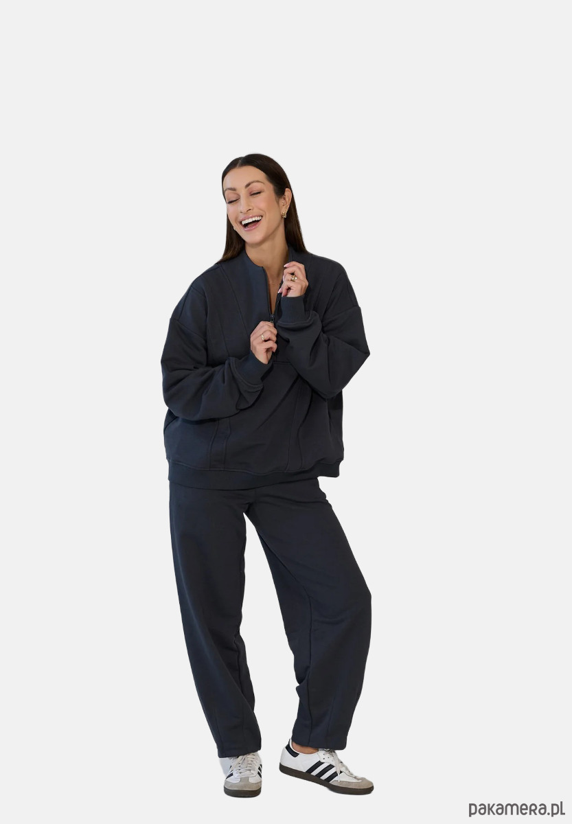 Spodnie Monica to klasyka wygody w dopracowanym wydaniu. Mają luźny, miękko opadający fason typu baggy i elastyczną gumę w pasie, dzięki czemu idealnie dopasowują się do sylwetki, bez zbędnego opinania. Nogawka jest prosta, nieco szersza w udach i zwężana na dole, co nadaje spodniom nowoczesny, swobodny i miejski charakter.