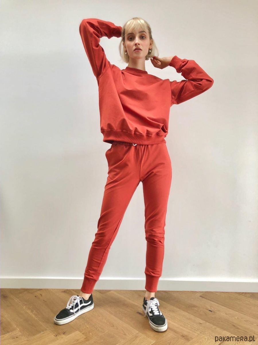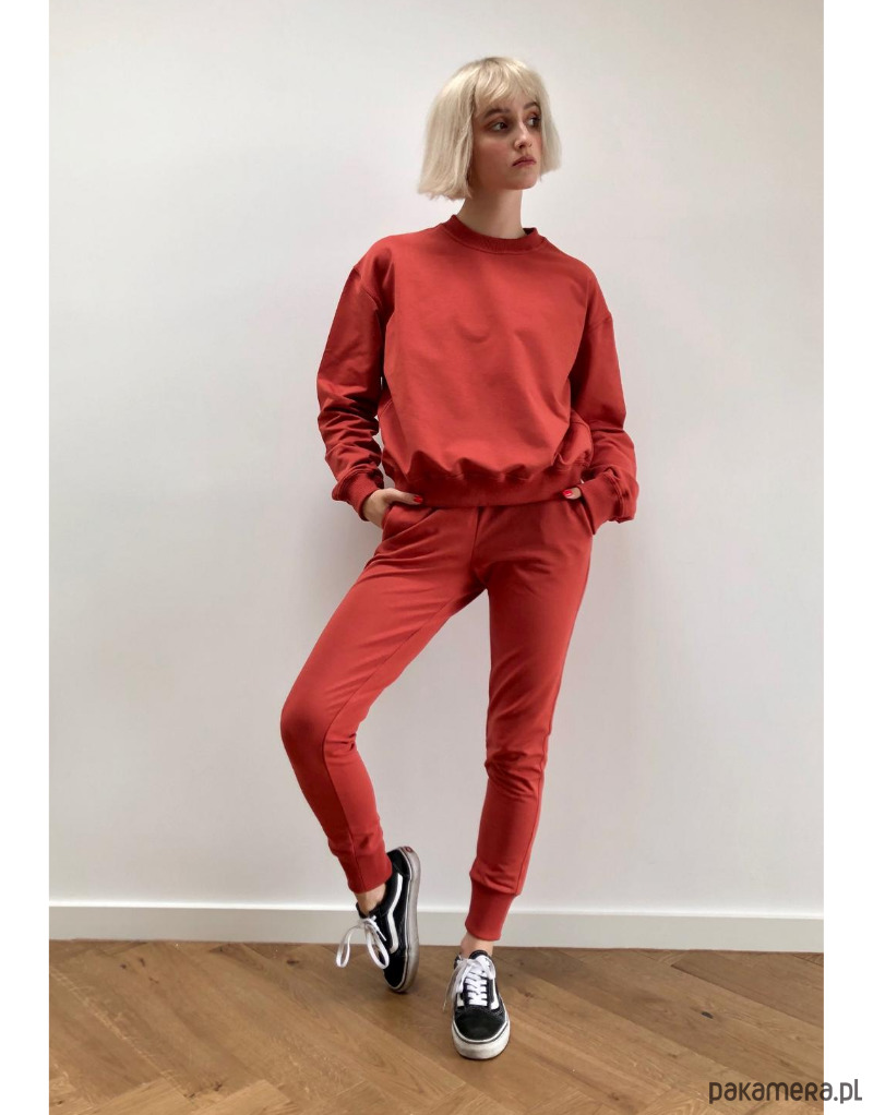 Długie nogawki zakończone ściągaczem, po bokach kieszenie.