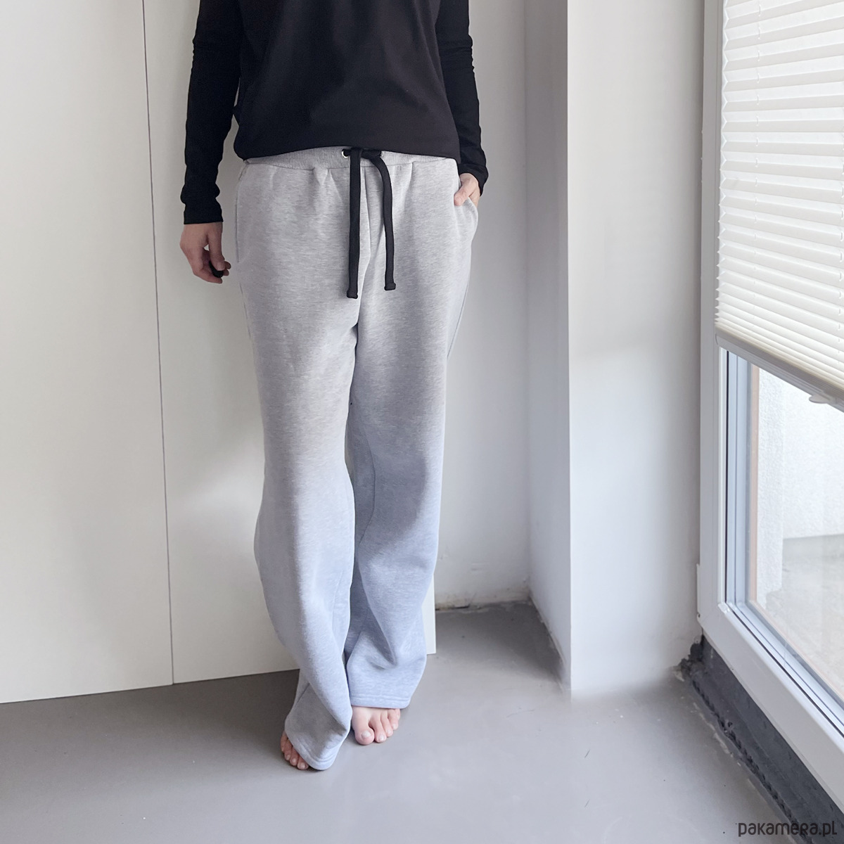 Szare, szerokie spodnie dresowe. Prosta, szeroka nogawka.