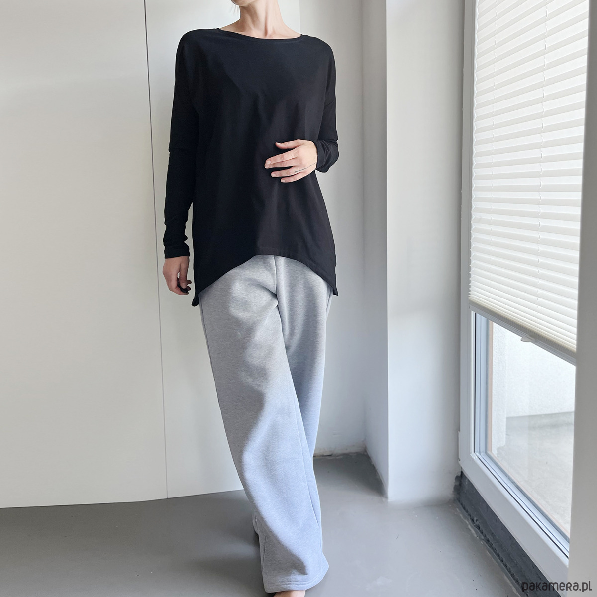 Modelka na zdjęciach ma na sobie rozmiar XL, klasycznie nosi rozmiar M. Bluzka na zdjęciu to Wąski rękaw bluzka czarna, dostępna w naszej ofercie.