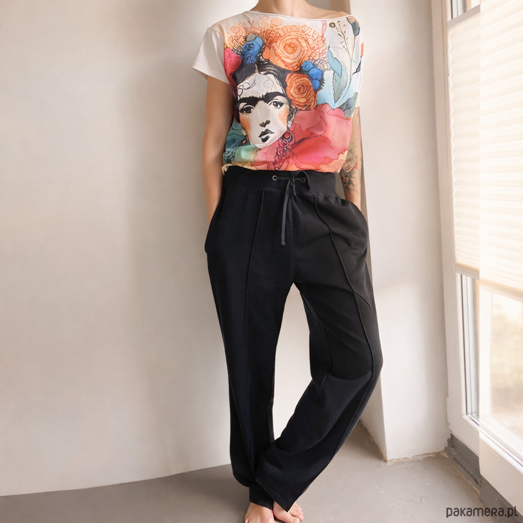 Modelka na zdjęciach ma na sobie rozmiar XL, klasycznie nosi rozmiar M. Koszulka na zdjęciu to Frida fullprint, dostępna w naszej ofercie.