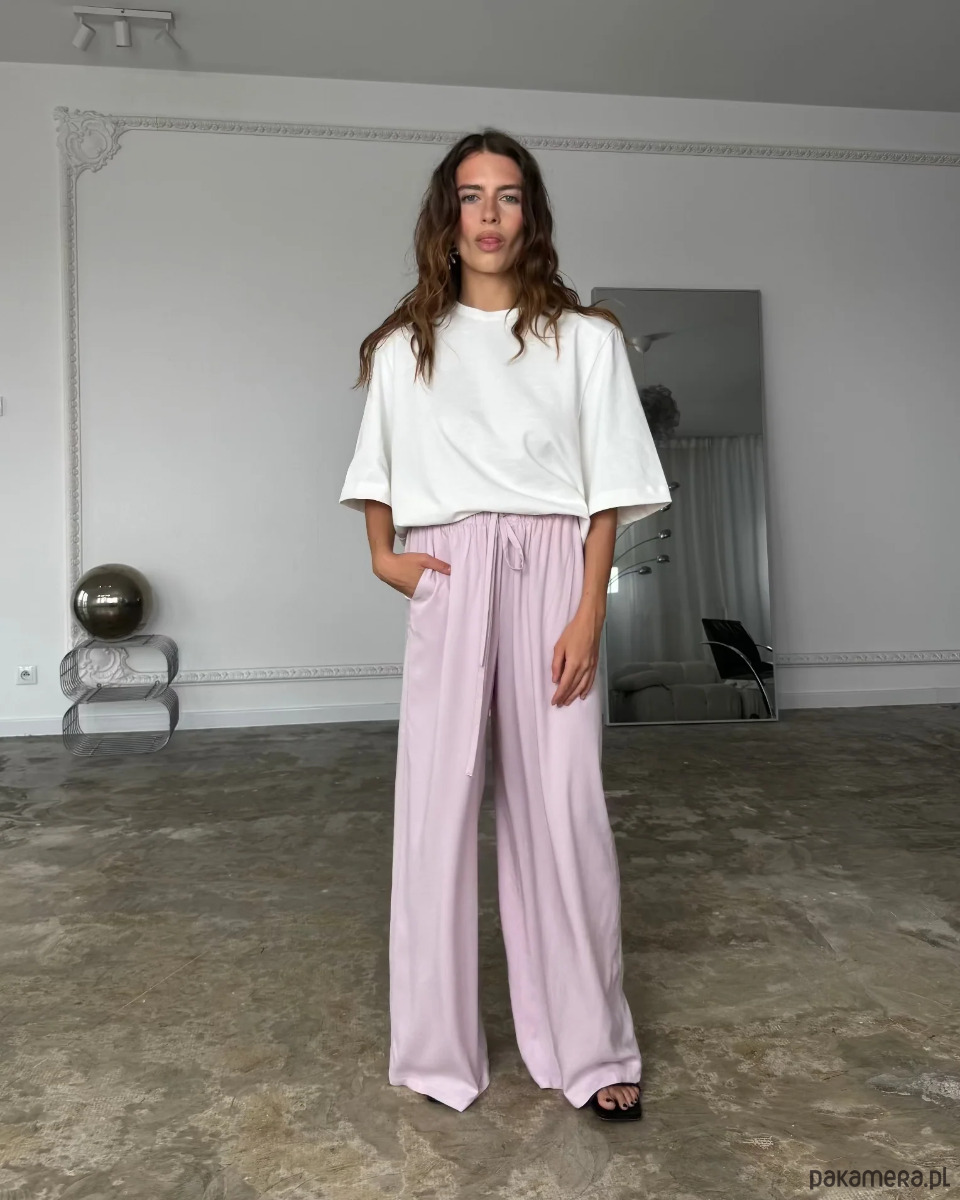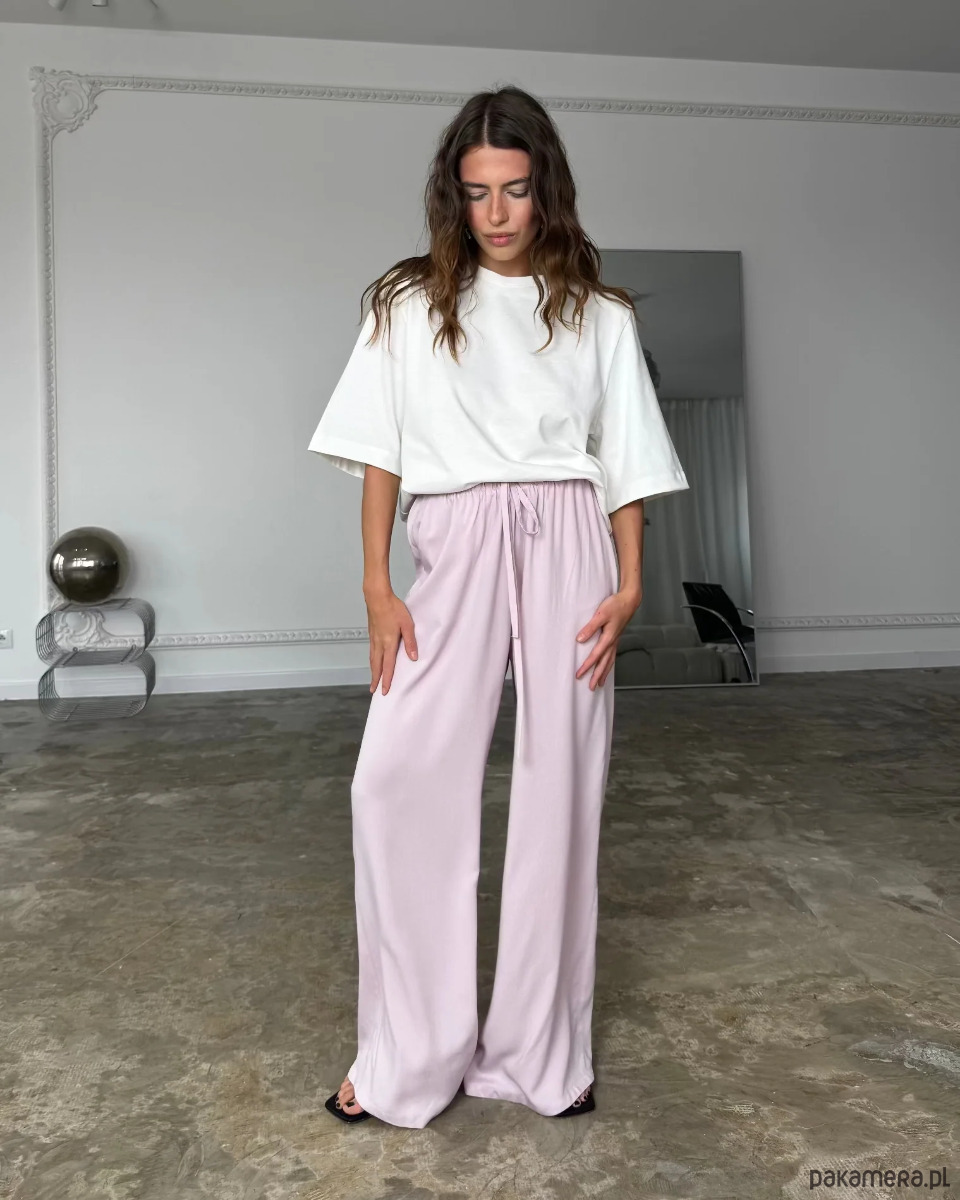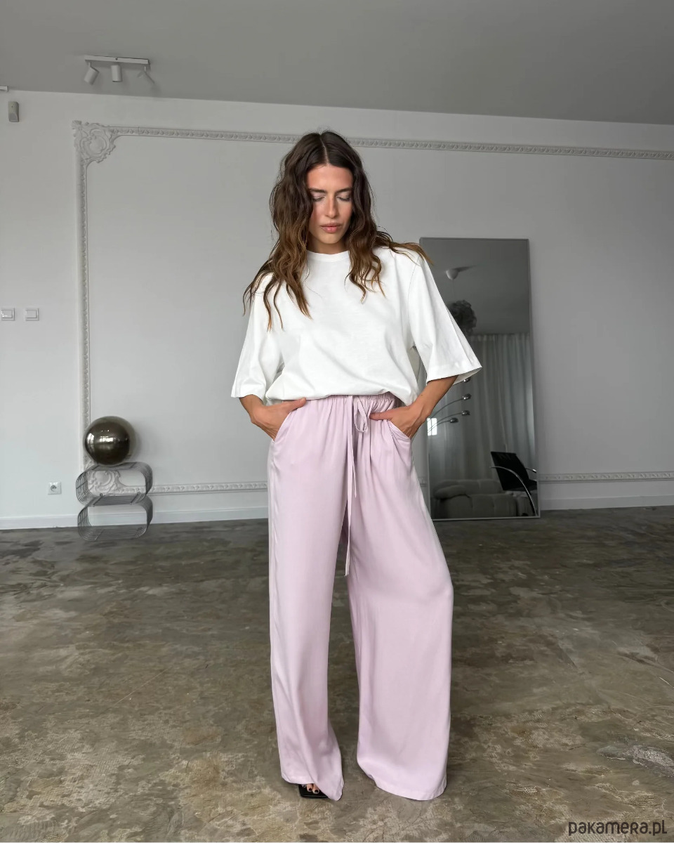 Spodnie Flow Lila to model stworzony z myślą o komforcie, swobodzie i naturalnej elegancji. Ich miękko opadająca forma i szeroka nogawka tworzą efekt płynności ruchu, który pięknie pracuje z sylwetką i nadaje stylizacji lekkości.
