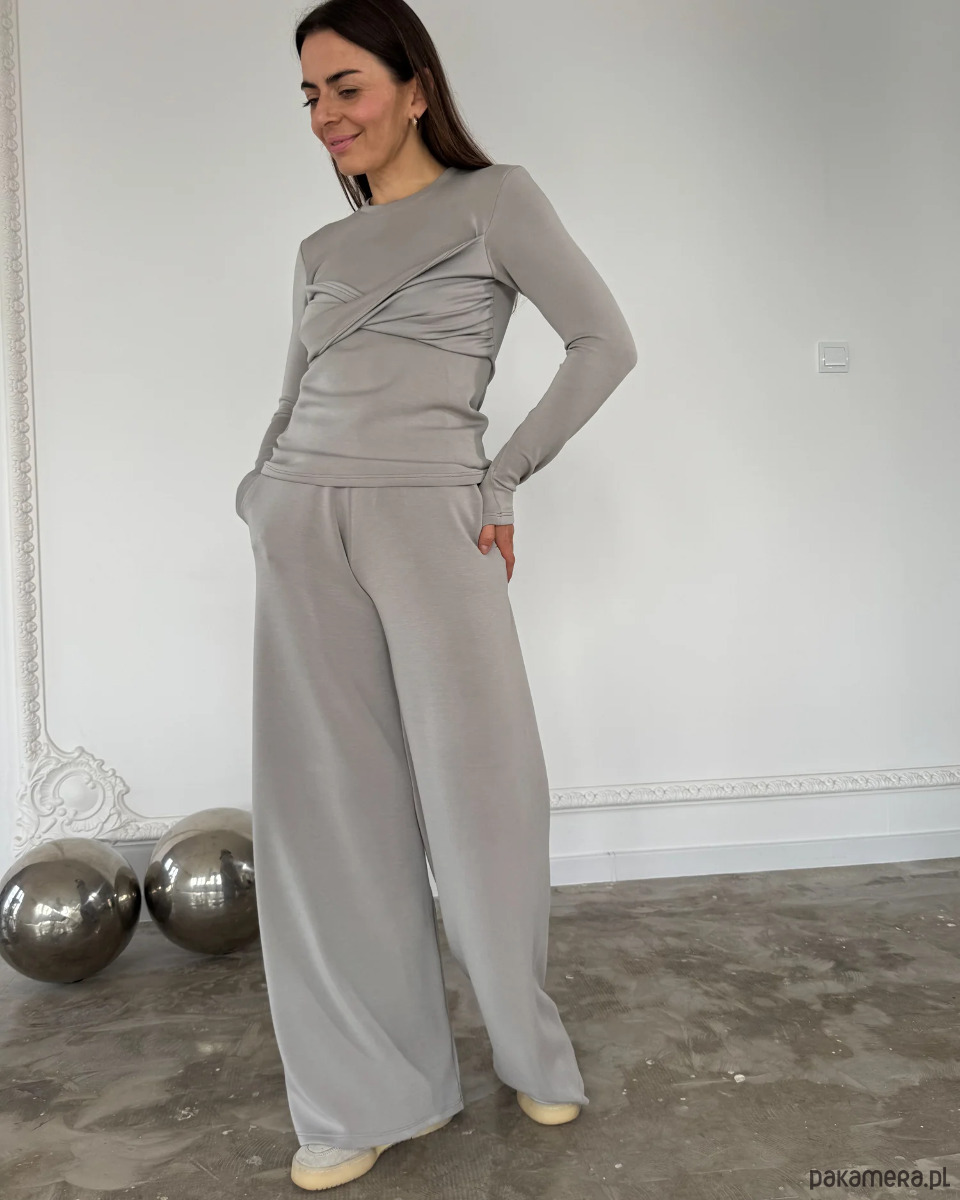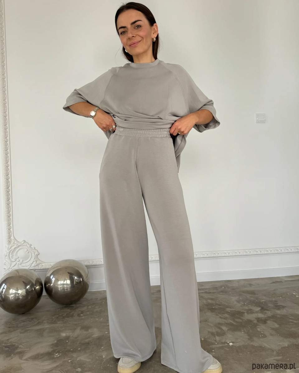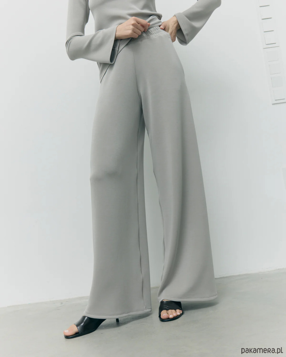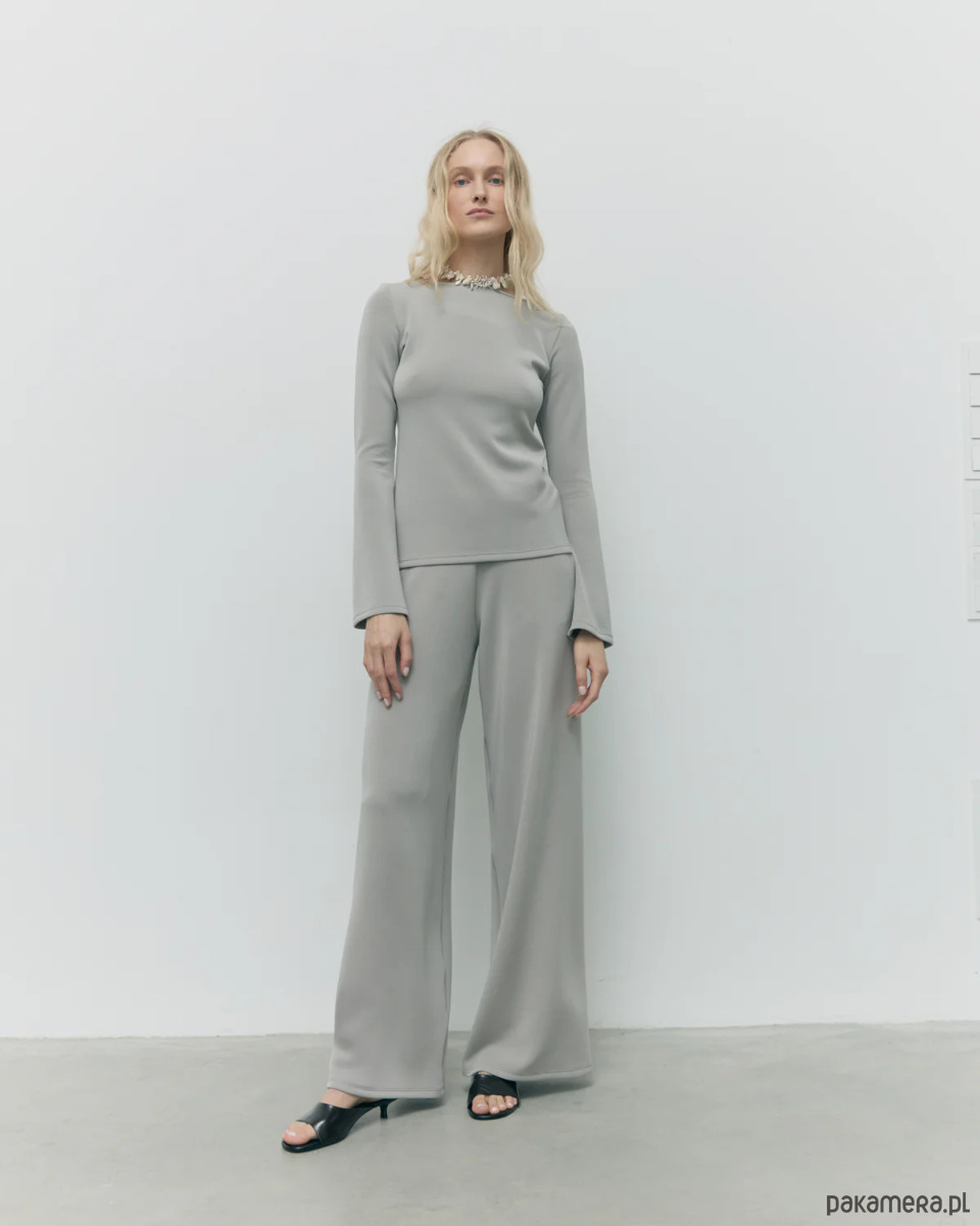 Klasyczny krój z szeroką nogawką optycznie wydłuża sylwetkę, a wysoki stan subtelnie podkreśla talię. Neutralny, jasnoszary odcień paloma to baza, która świetnie komponuje się z każdym kolorem – od minimalistycznych bieli i czerni po wyraziste akcenty. W komplecie z longsleeve Sense tworzy elegancki, a zarazem niezwykle wygodny zestaw w duchu slow fashion.