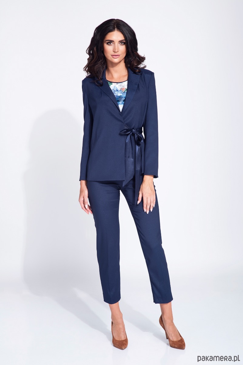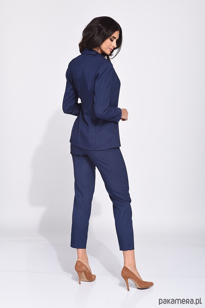 Eleganckie spodnie prasowane na kant w kolorze granatowym o klasycznym fasonie do kostki. Z tyłu wszyty kryty zamek, zwężane nogawki, wysoki stan. Materiał z którego uszyte są spodnie posiada lekki połysk.