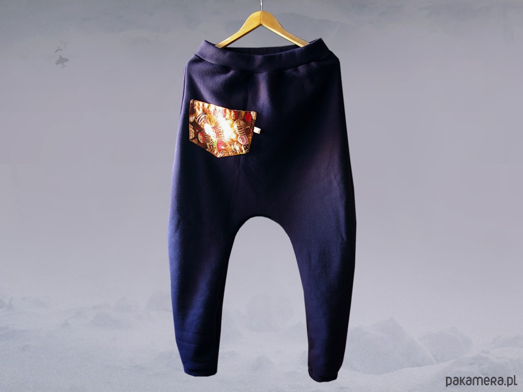 Krój: obszerny, wygodny, z obniżonym krokiem i elastycznym pasem (ściągacz, od wewnątrz wzmocniony szeroką gumą), nogawki zwężane do dołu, na boku naszyto kolorową kieszeń.