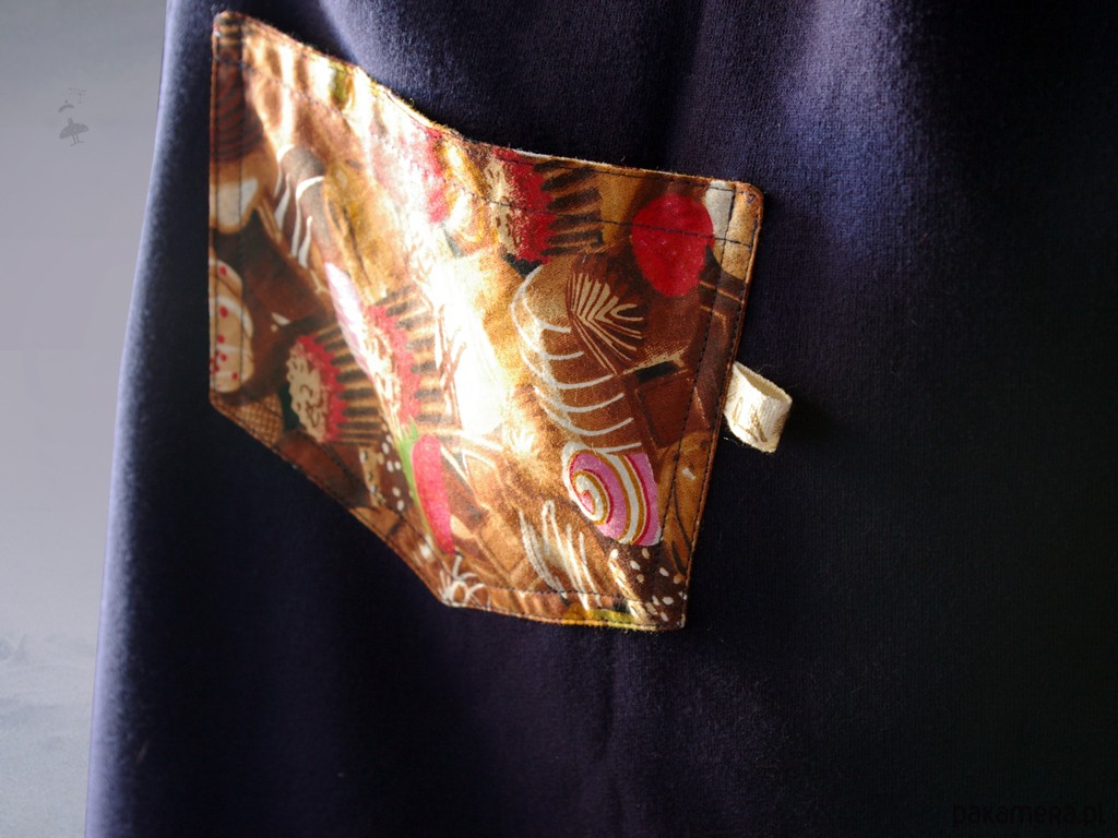 Materiały: miękka i ciepła dzianina dresowa a atramentowym granacie, kolorowa bawełna.
