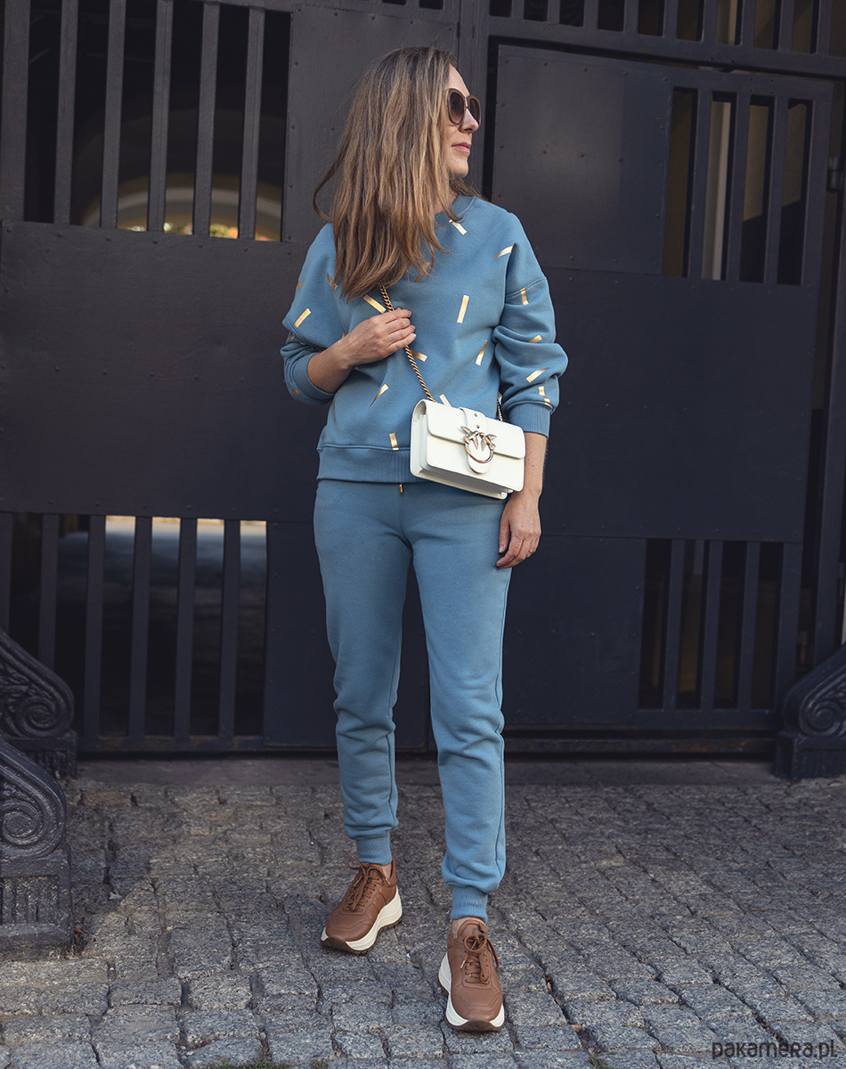 Dół spodni i pas wykończone bawełnianym ściągaczem. Kolor blue. pas na gumie Ściągane sznurkiem w tali.