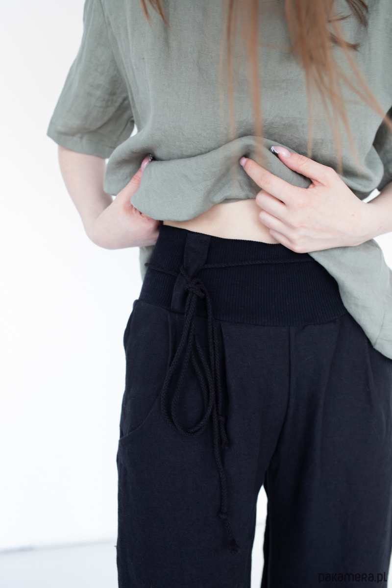 Luźne spodnie szwedy są uszyte ze 100% lnu o bardzo miłym w dotyku zmiękczanym splocie. Materiał idealnie dopasowuje się do sylwetki, więc nosisz je komfortowo do każdej stylizacji. Co więcej, sam fason nie jest zwyczajny i pozwala poczuć się swobodnie. Dzięki lekkim zaszewkom pod bawełnianym ściągaczem w pasie i kieszeniom masz wrażenie, że nosisz najwygodniejsze spodnie z lnu na świecie!