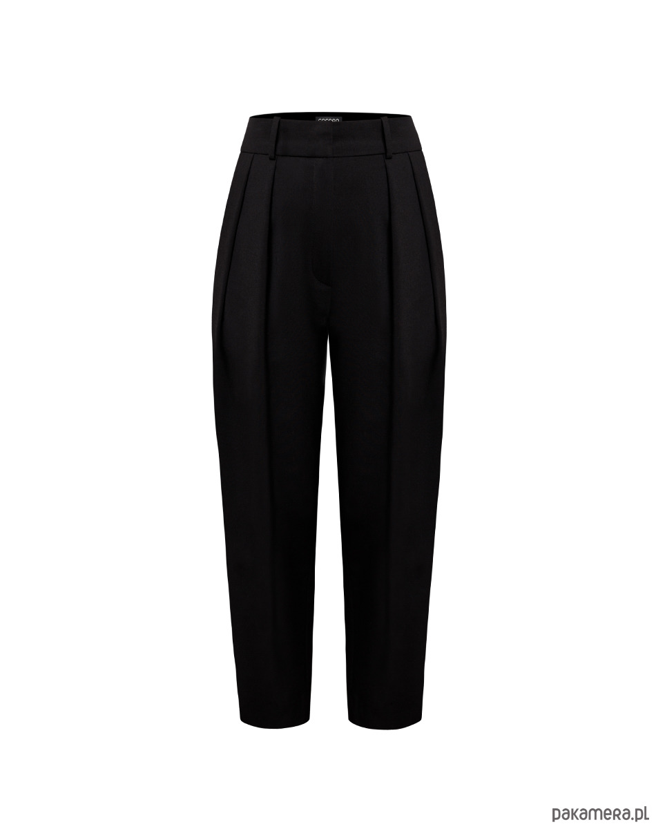 Eleganckie, garniturowe spodnie z zakładkami. Krój z nogawkami zwężającymi się do dołu. Uszyte z cienkiej wysokogatunkowej włoskiej tkaniny wełnianej w kolorze czarnym.
