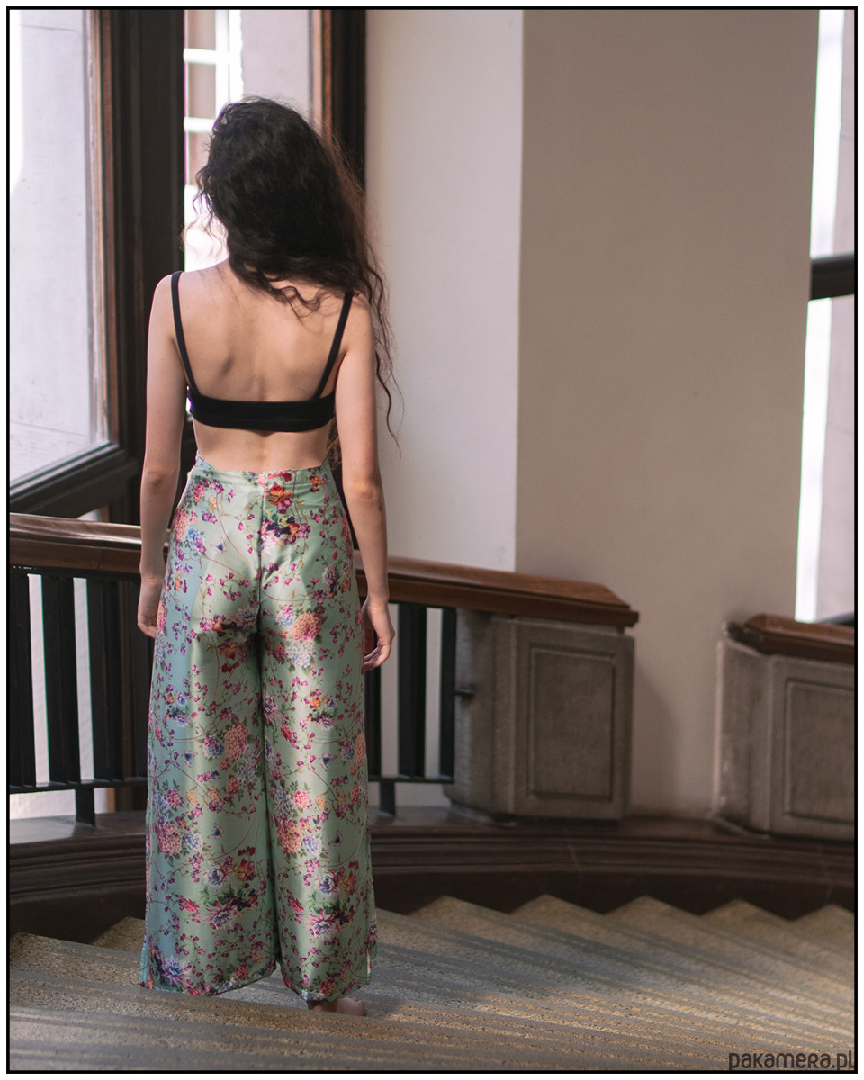 Spodnie o pozornie skomplikowanym fasonie, jednak nosząc je szybko można odkryć ich zalety. Składają się z jednego elementu materiału, który odpowiednio przeplata się pomiędzy nogami i przewiązuje w pasie. Możliwość regulacji w pasie sprawiają, że dopasowują się do różnego typu sylwetki. Finalnie tworzą spodnie o szerokich nogawkach z subtelnymi rozcięciami na linii lampasów.