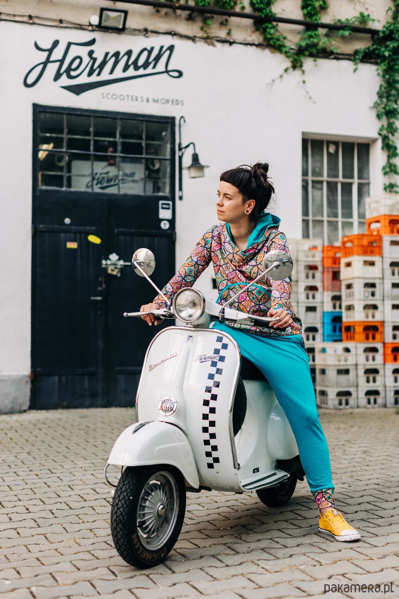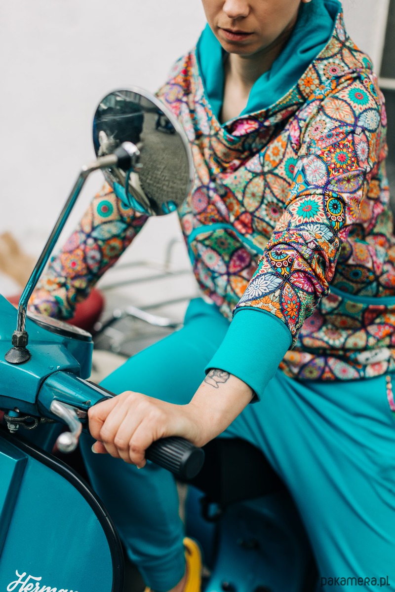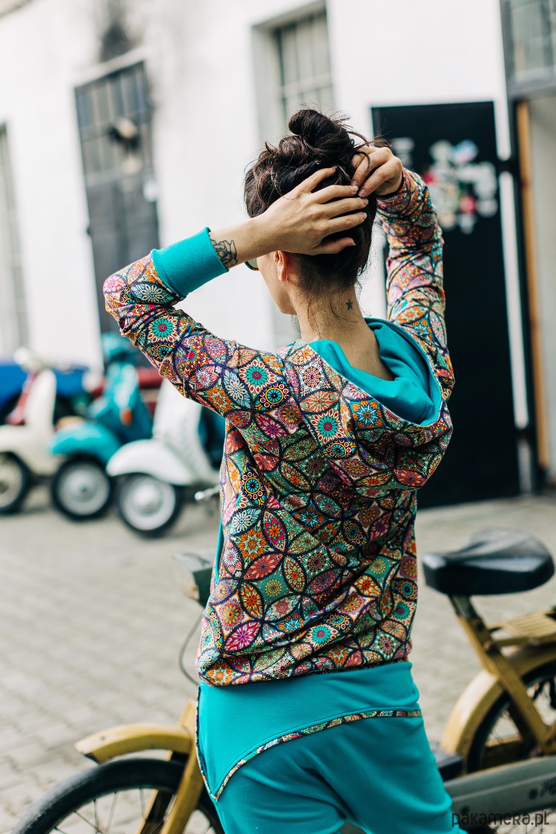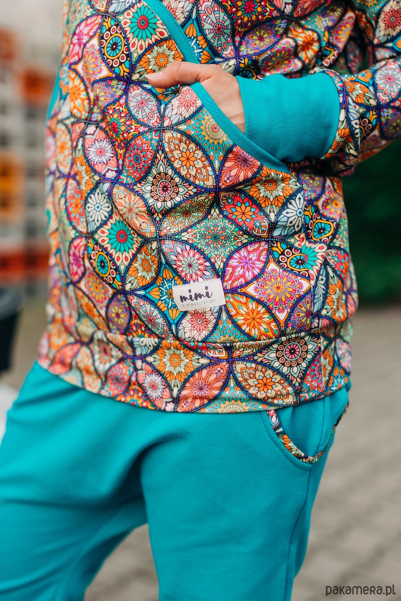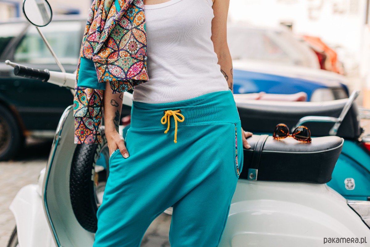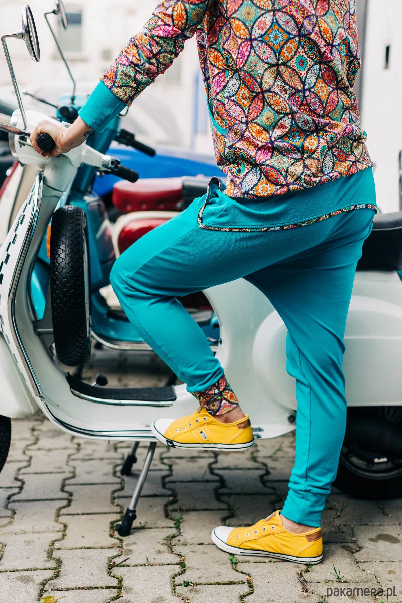 Spodnie baggy - Ciao Bella, to oryginalne spodnie z obniżonym krokiem dla kobiety lubiącej wygodę i niebanalny look. Wielokolorowe rozetki w połączeniu z dzianiną w pięknym zielono/niebieskim kolorze to prawdziwa eksplozja energii i optymizmu. I tak też, czułam się podczas projektowania tych spodni, niemalże eksplodowałam radością . Jeżeli mogę przekazać choćby odrobinę tej pozytywnej energii Tobie, będzie to dla mnie ogromny zaszczyt ;-)?