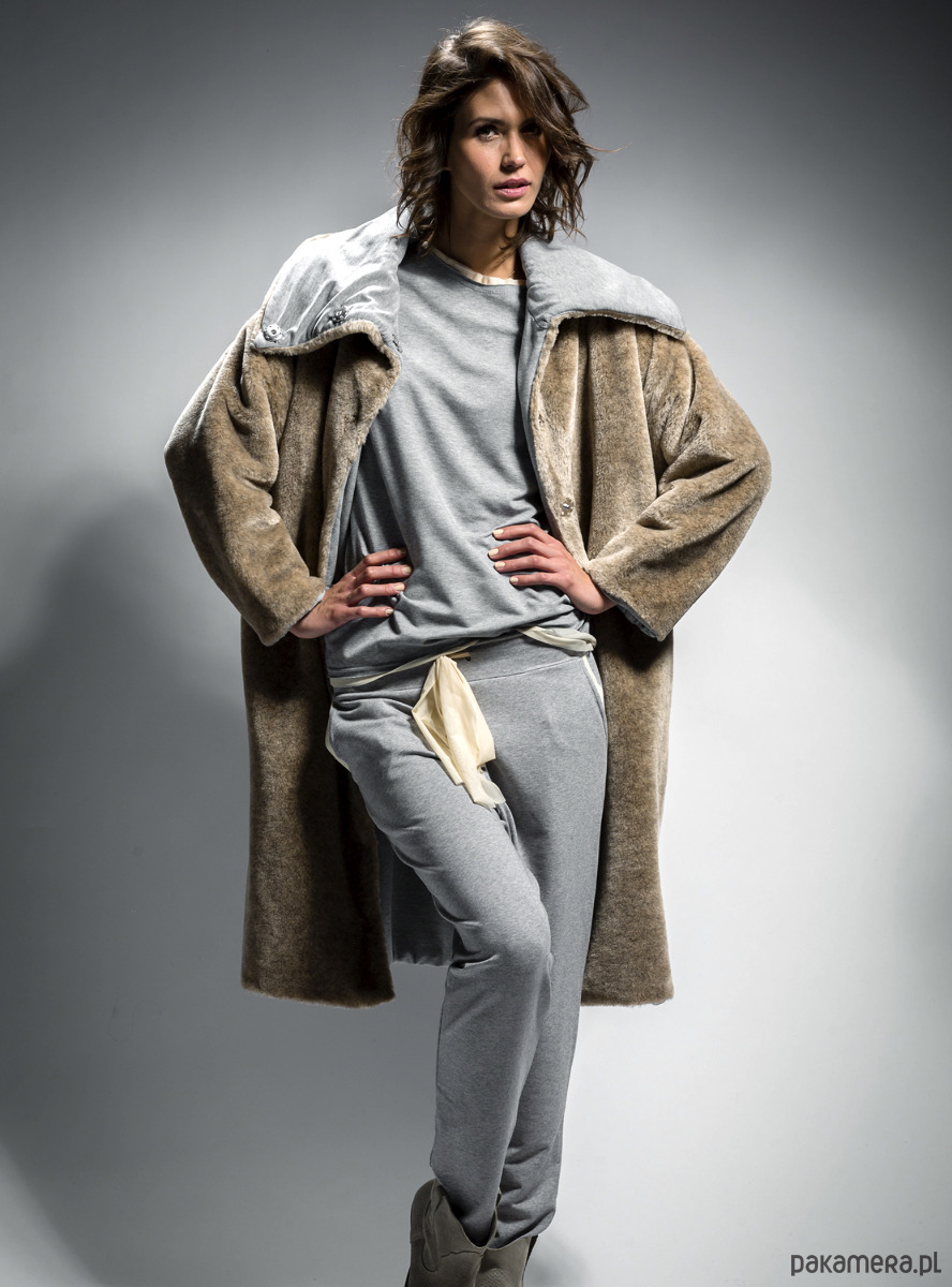 ściąganym na tiulową wstążkę w beżowym kolorze. Mają dwie kieszenie wykończone