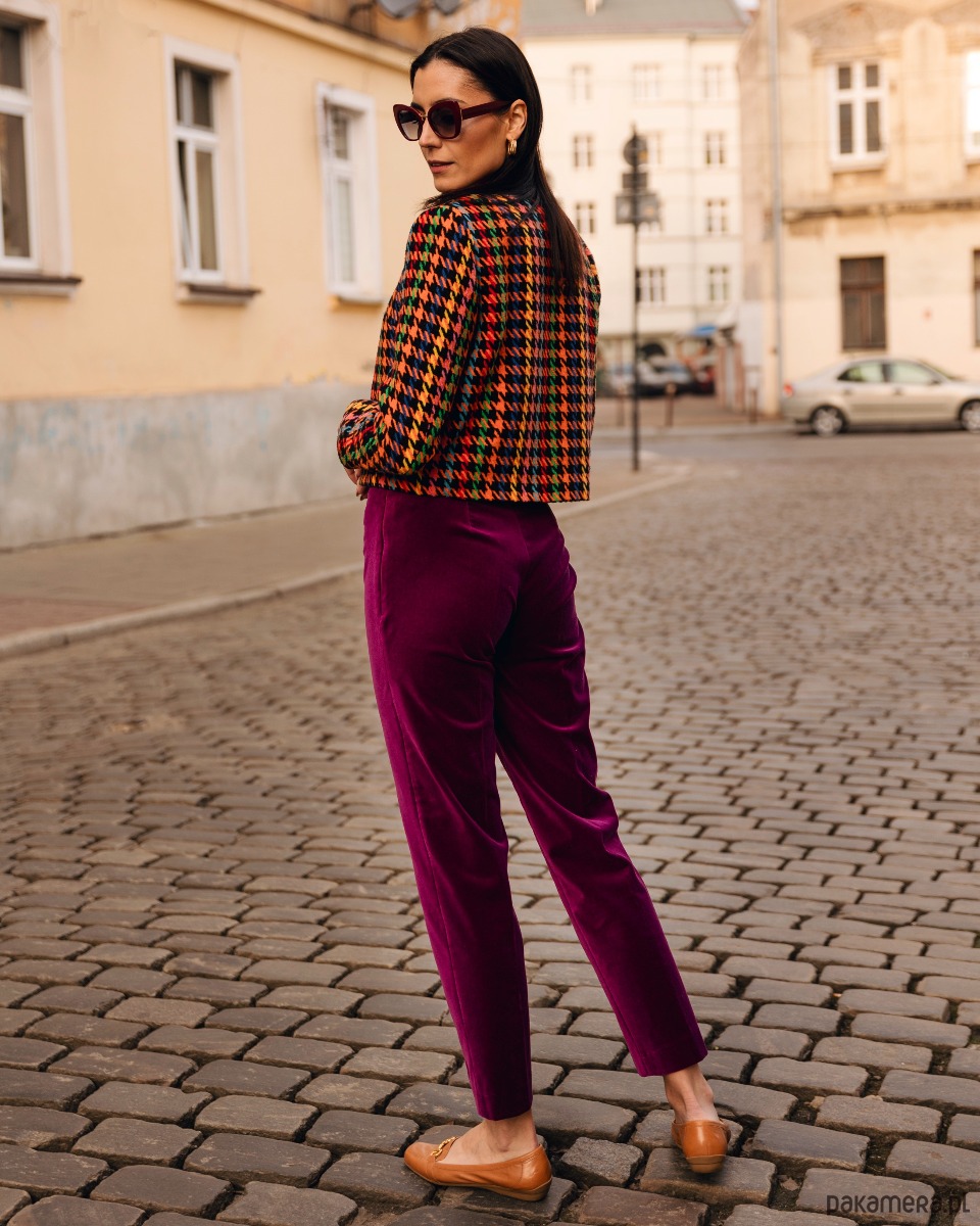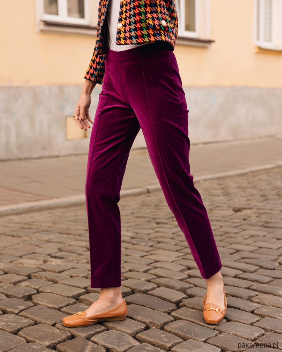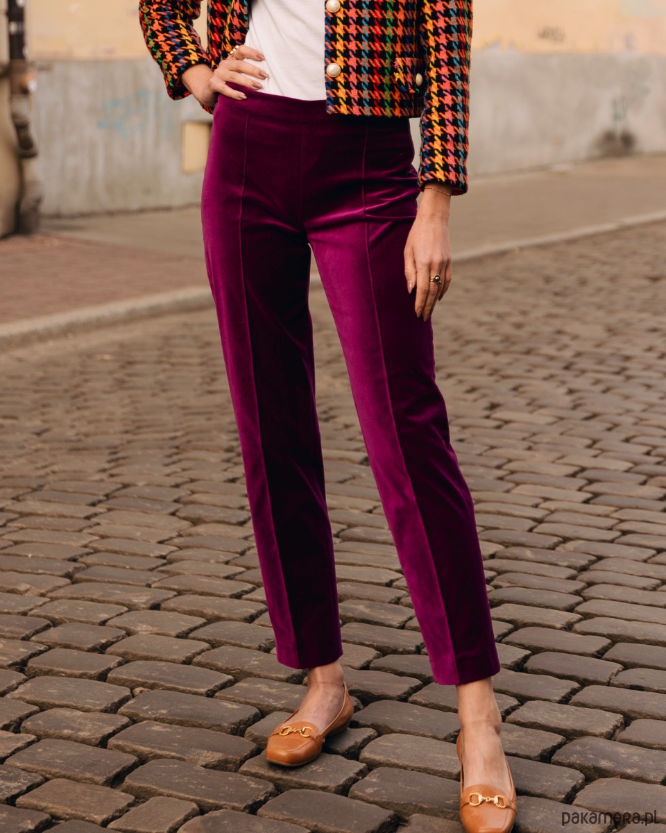 Spodnie o pięknym fasonie, z lekko podwyższonym stanem. Zapinane z boku na zamek. Przez środek nogawek ozdobny szew. Fason spodni wysmukla nogi i biodra. Uszyte ze 100% naturalnego, miękkiego, włoskiego aksamitu. Aksamit jest plastyczny, ale nie gruby. Idealnie nadaje się zarówno na sezon wiosenny, jesienny, zimowy i chłodniejsze dni lata. Tkanina bardzo ładnie układa się na sylwetce.