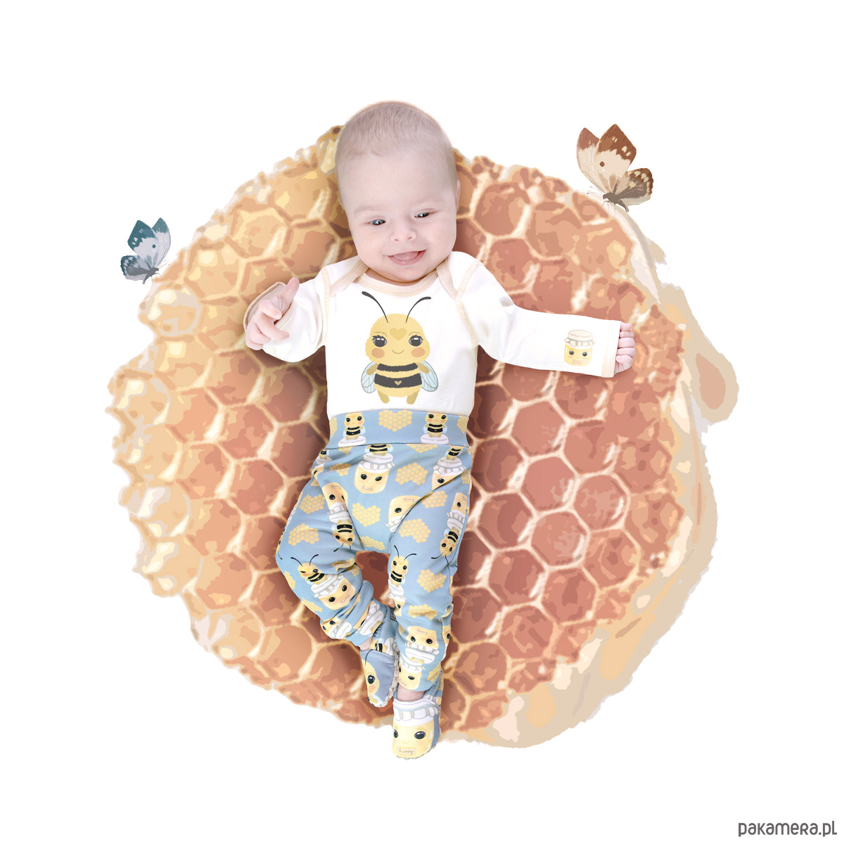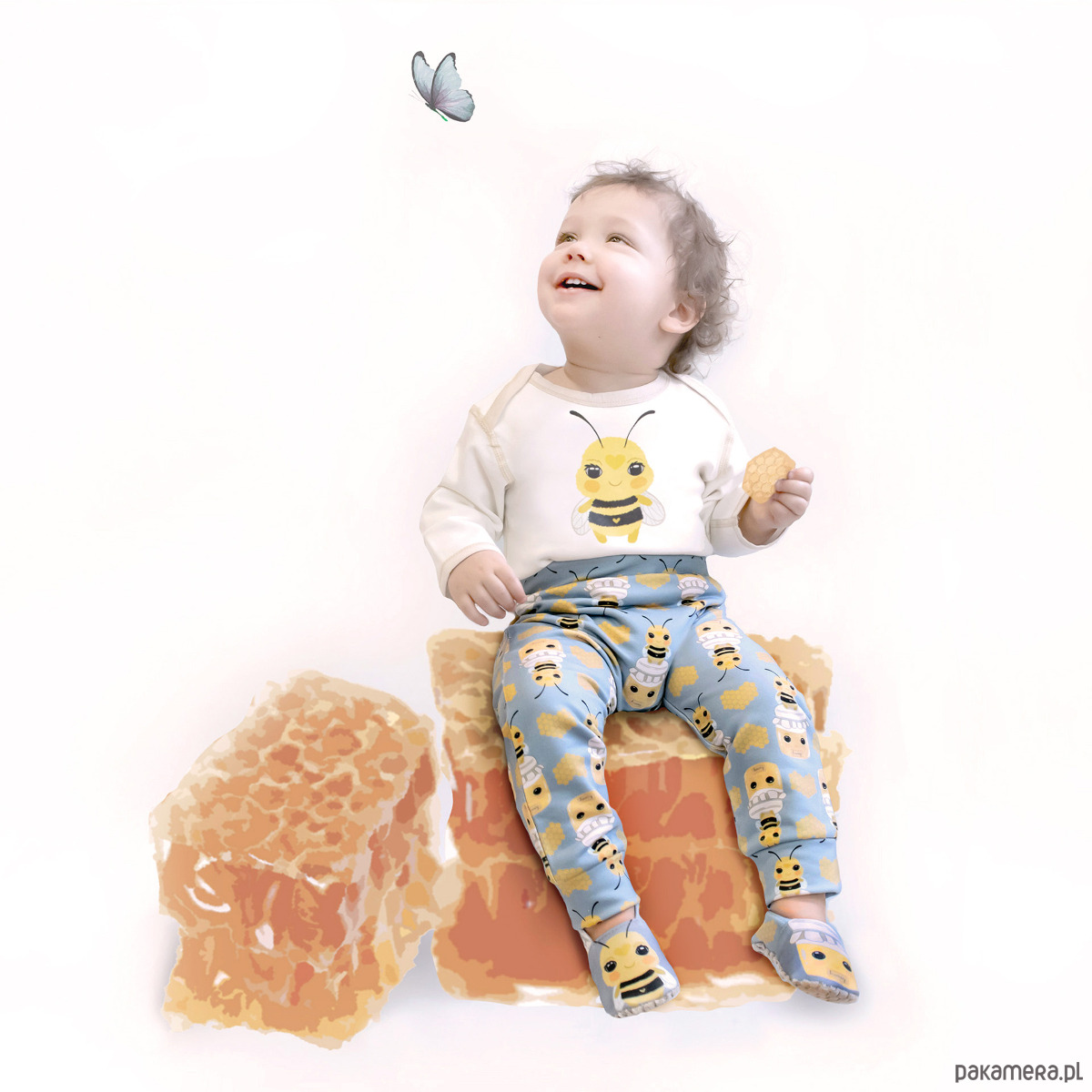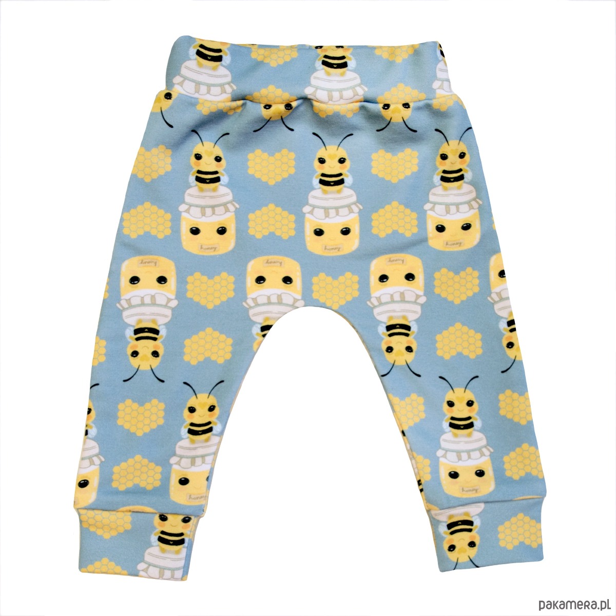 Spodnie są wykonane w 65% z poliestru, 30% z bawełny, 5% ze spandexu, z naszym wzorem pszczółki z miodem wykonanym cyfrowo. Spodnie mają elastyczny pas i ściągacze u dołu nogawek.