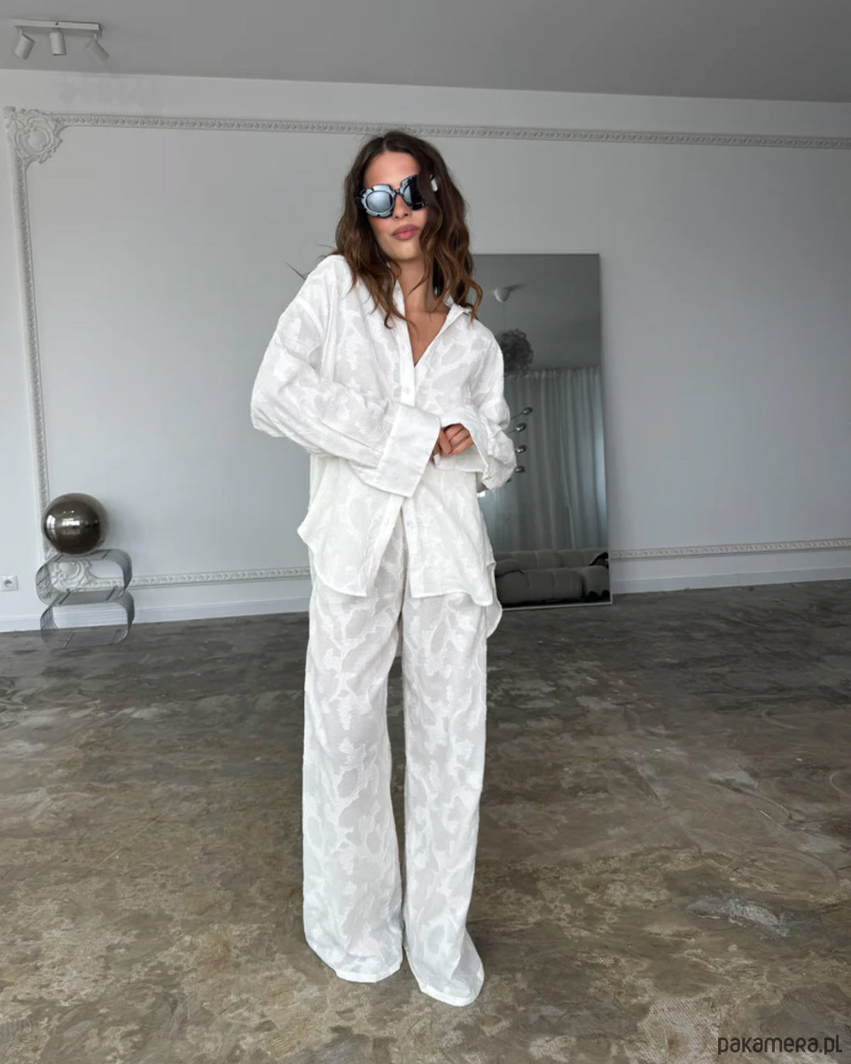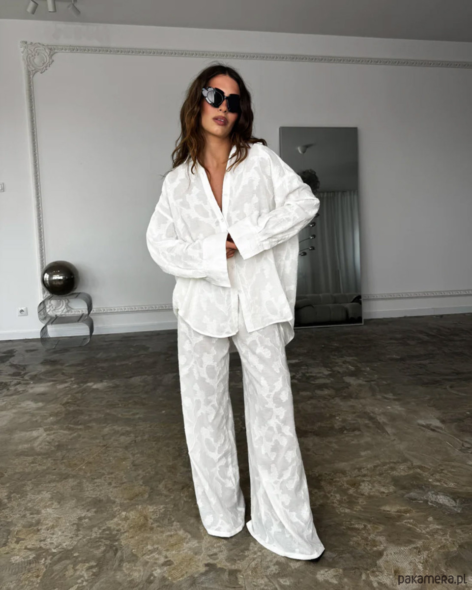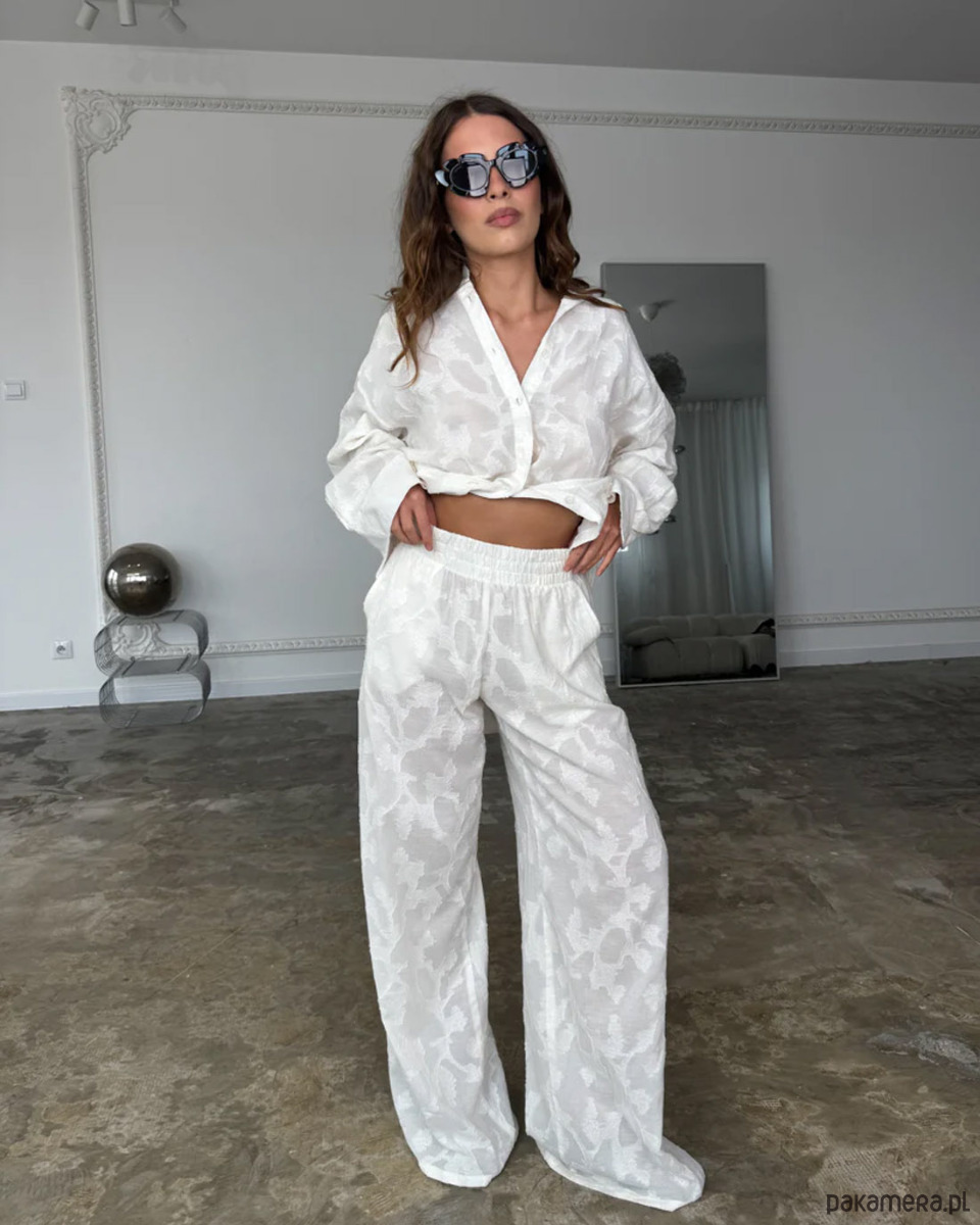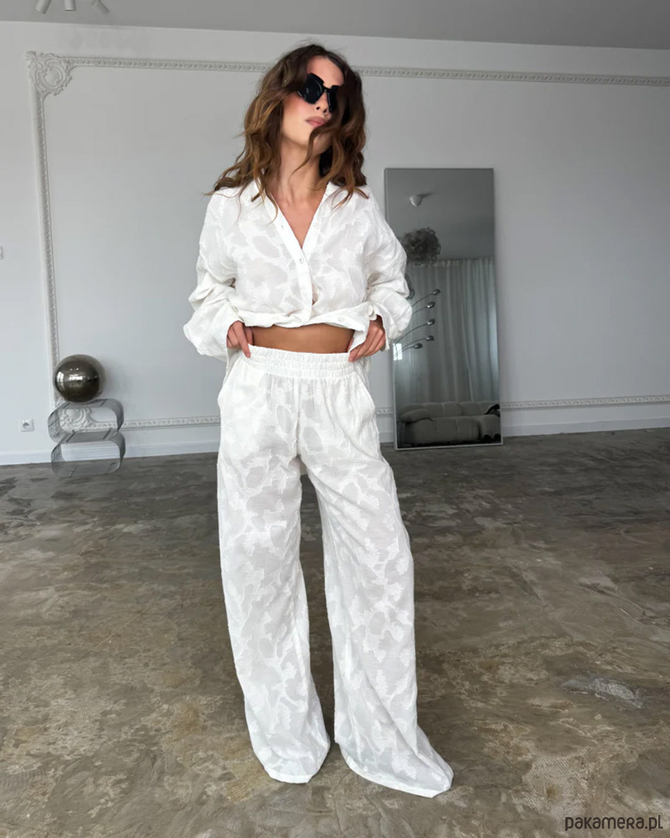 Spodnie o szerokiej, płynnej formie typu palazzo wykonane z żakardowej tkaniny w odcieniu ecru, która subtelnie odbija światło i buduje elegancką, wielowymiarową strukturę. Delikatny wzór nadaje całości głębi, zachowując minimalistyczny i spokojny charakter.