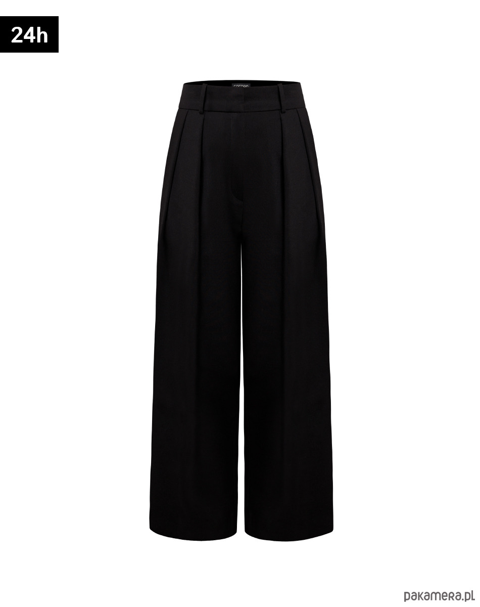 Eleganckie, garniturowe spodnie z zakładkami. Krój z palazzo z szorakimi nogawkami. Uszyte z wysokogatunkowej włoskiej tkaniny wełnianej w kolorze czarnym.