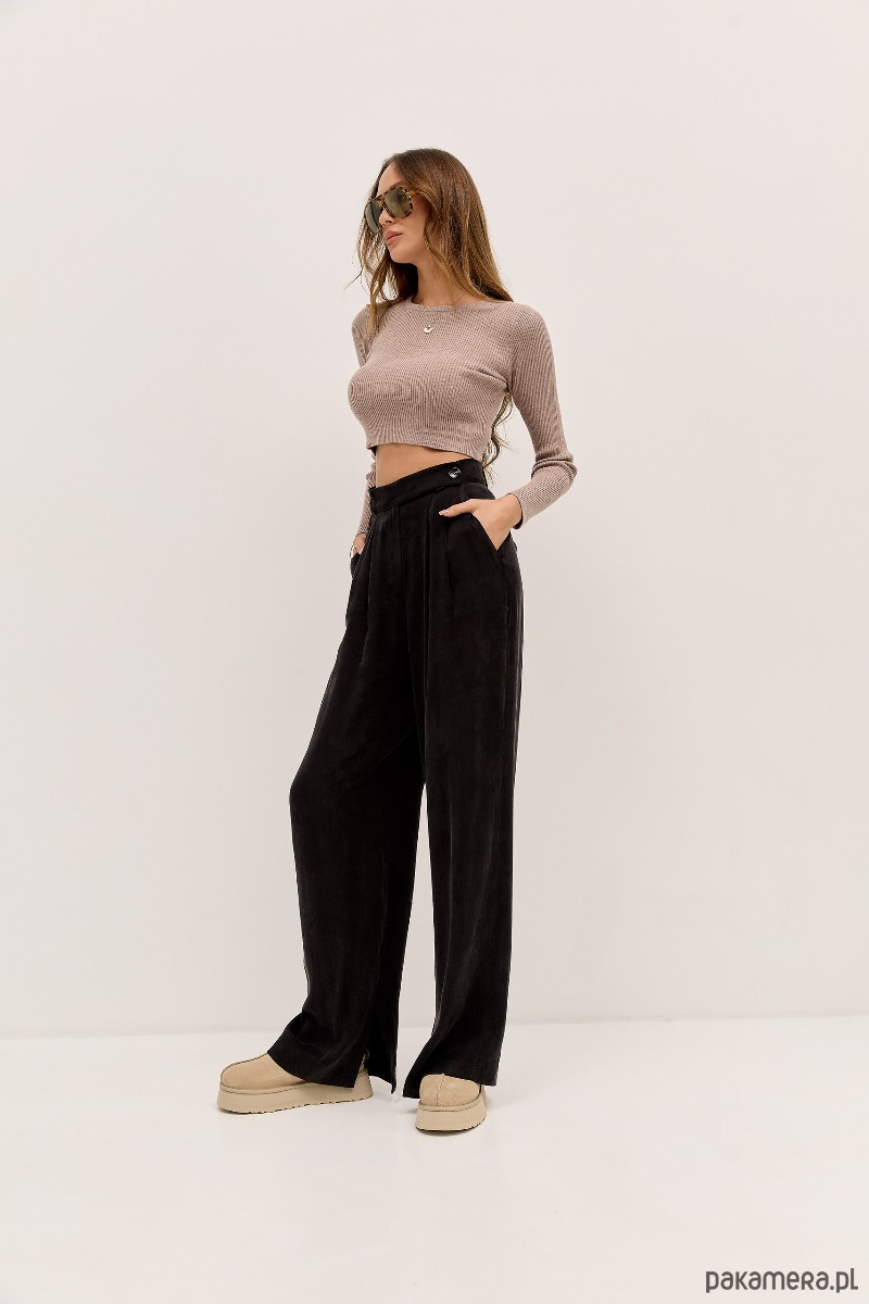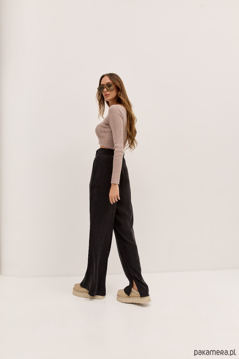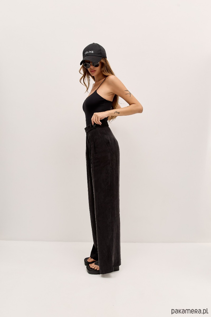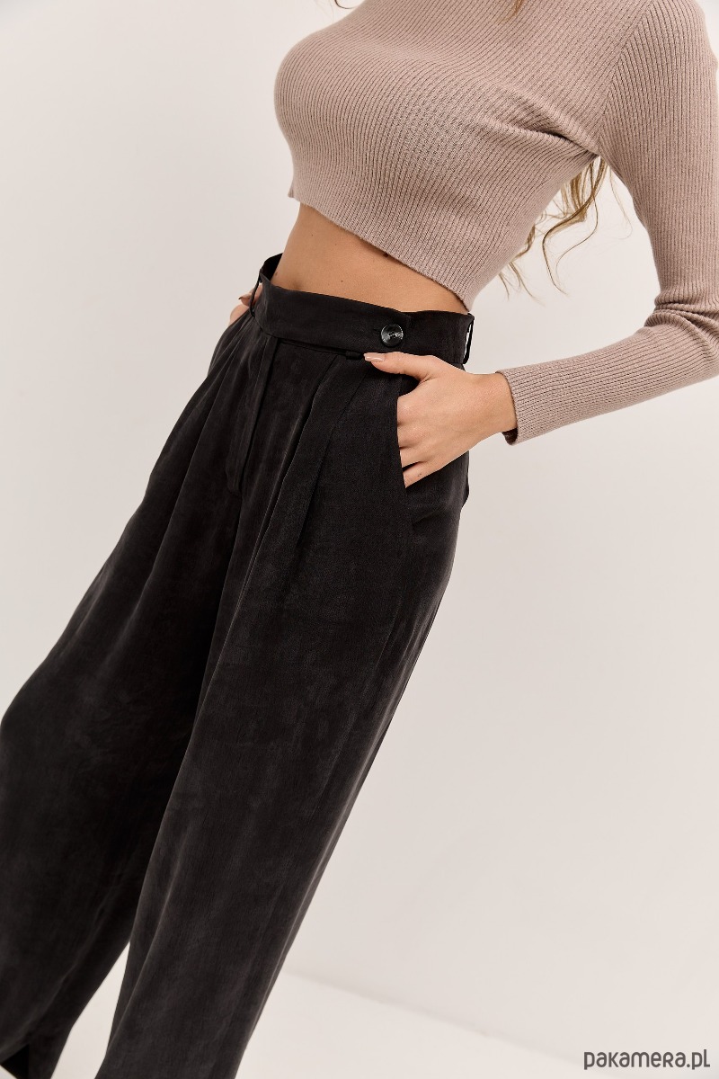 Klasyka w wersji oversize. Ponadczasowe spodnie o luźnym kroju z wysokim stanem i licznymi zakładkami. PAYA to spodnie szyte z wysokiej jakości mięsistej tkaniny z efektem cupro~brzoskwini. Rozporek od wewnętrznej strony nogawki przełamuje monotonię, odkrywając lekko buty i dodając nogawce lekkości.