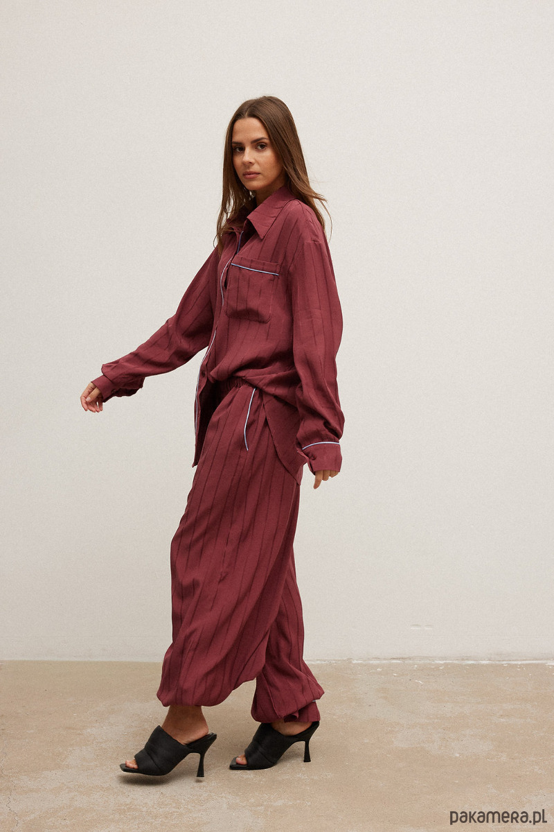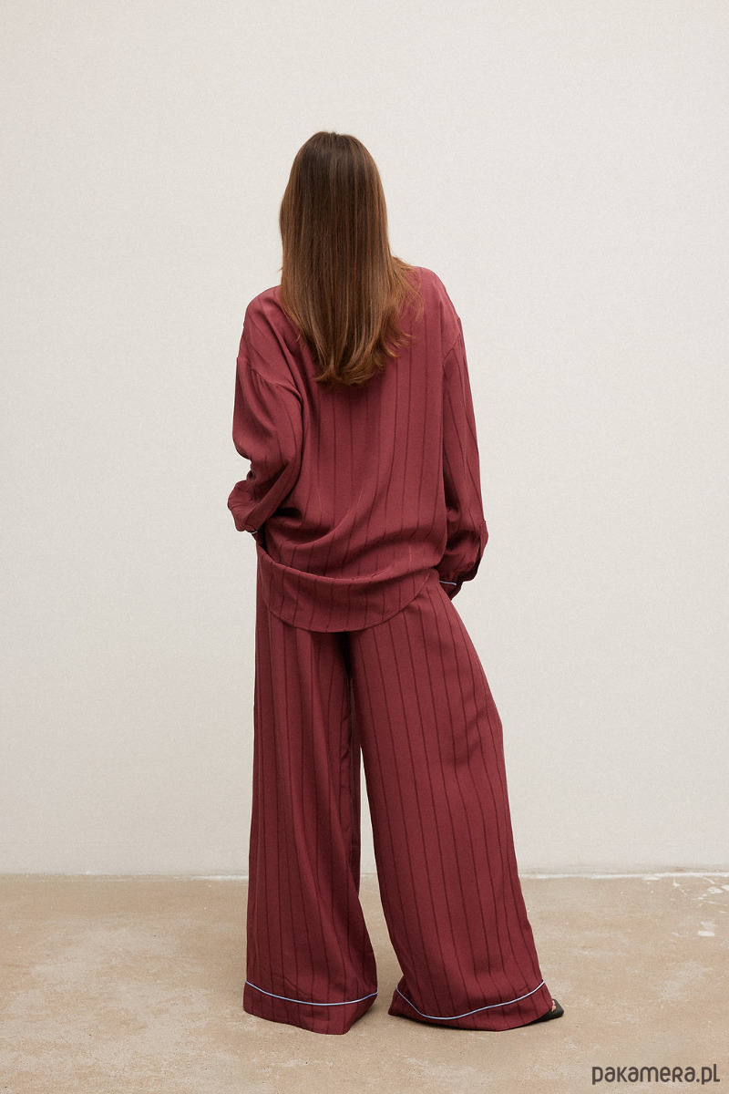 Spodnie w żakardowe paski o bardzo szerokim kroju, tak to piżama daily ;). W pasie wpuszczona gumka oraz sznurek umożliwiające regulację szerokości, można nosić je wysoko w talii lub na biodrach. Uszyte z cienkiej, przewiewnej tkaniny.